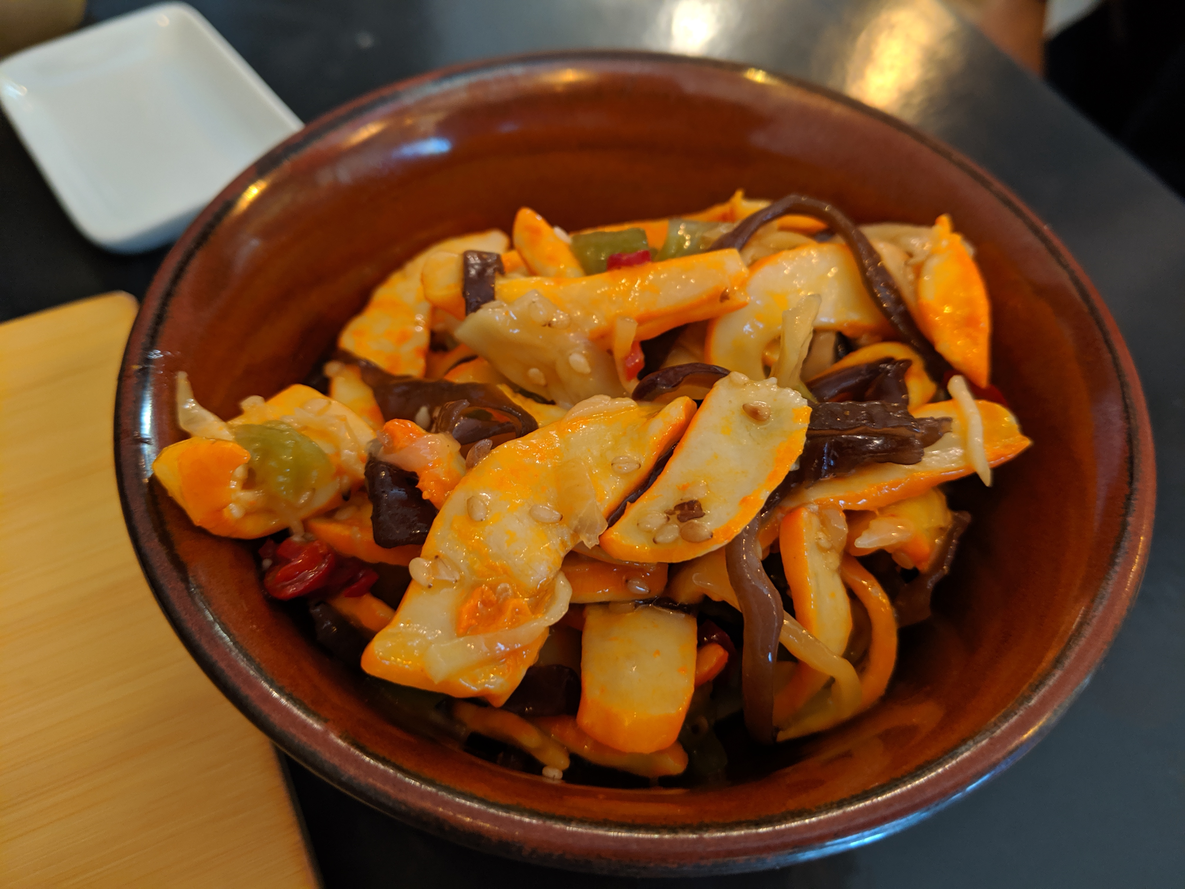 En recherche de cuisine coréenne depuis longtemps sur Quimper, en particulier du vrai bibimbap, découverte de Abalone dans les halles. Ce restaurant sert des ramen, au poulet, au porc ou tofu. La portion de ramen est suffisamment copieuse et allie de nombreux ingrédients : du poulet et un oeuf, des légumes dont les pousses de soja et de bambou, de la cébette, des champignons shütake, et aussi des narutomaki. J'ai déjà eu l'occasion de manger dans des restaurants japonais à plusieurs reprises. Si la soupe de ramen est copieuse, je n'adhère pas au goût du poulet et son bouillon. Par contre, le kimchi maison est bon. Mais 5 € la portion L de 160 gr, ça fait 31 € le kilo (7 € les 500 gr en magasin soit 14 € le kilo et tout aussi bon). Au total, une soupe ramen et un kimchi pour 20 €.