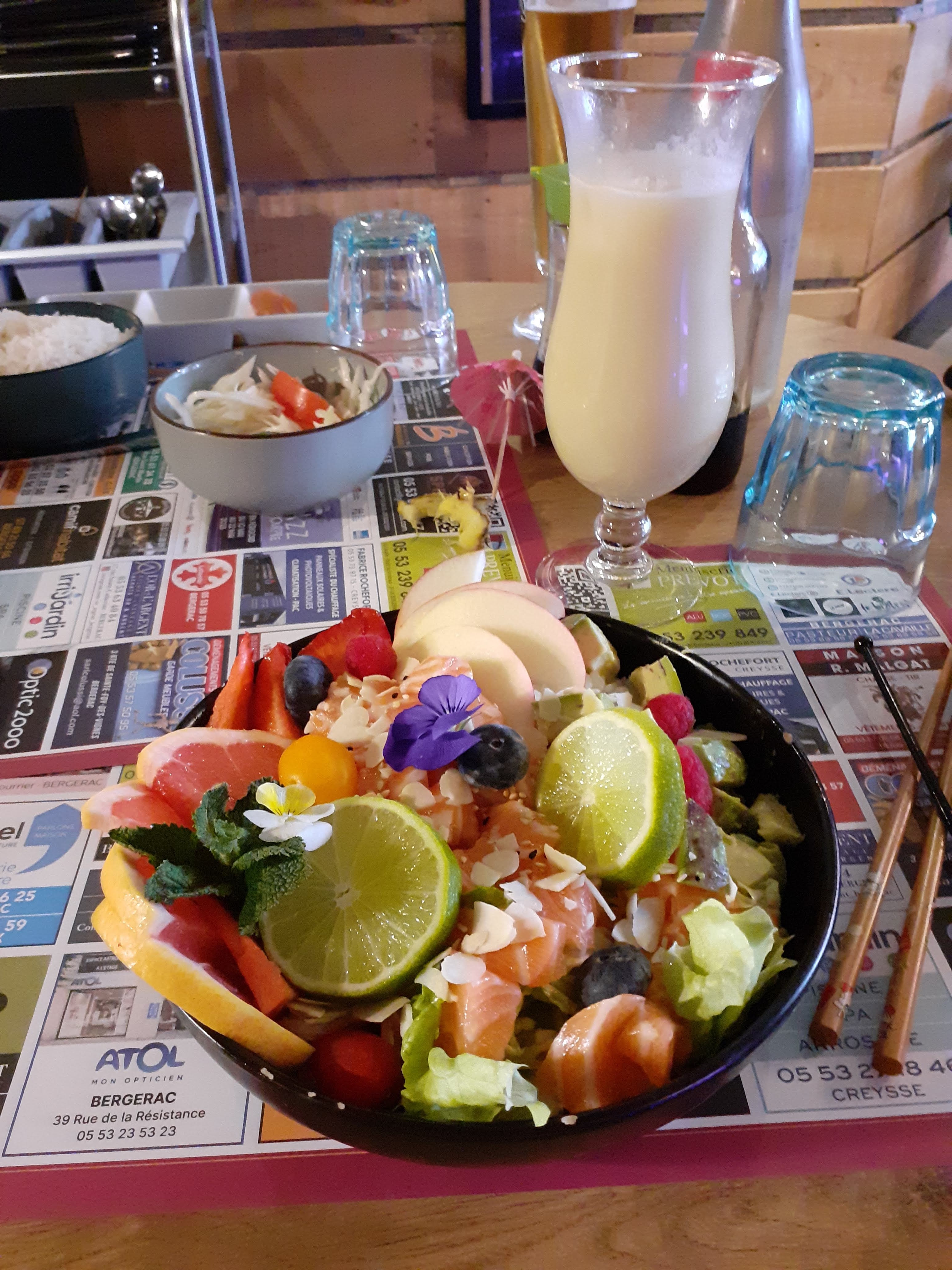 Un restaurant découvrir Accueil au top Service très agréable Et le repas dans une ambiance musicale des Studio Ghilbi Que demander de plus À refaire sans hésiter, je vous le conseille même en visite à Bergerac pour un repas léger ou plus gourmand Pour moi ce fut pina colada sans alcool et Pok Bowl avocat, un délice