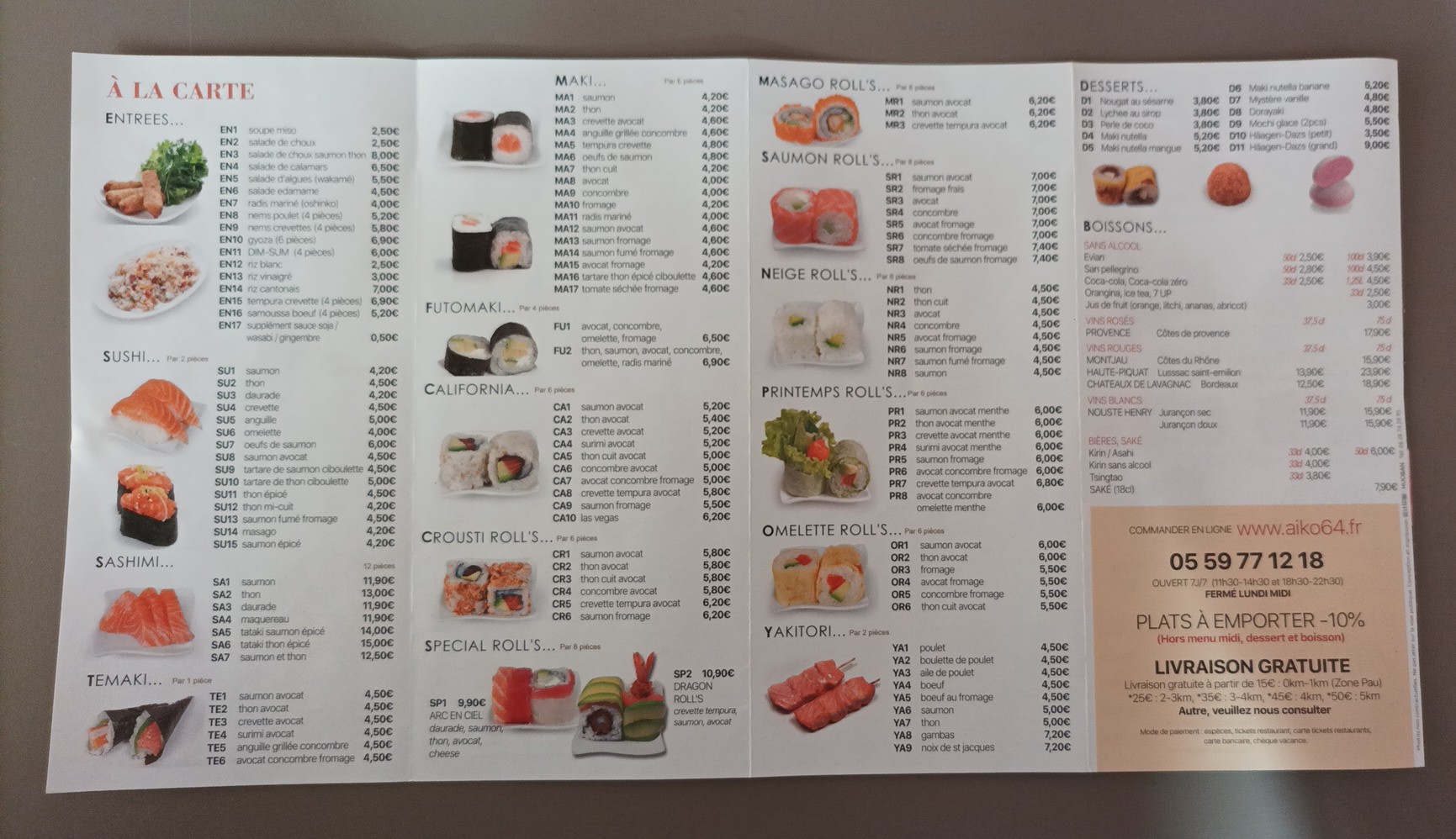 Nourriture de qualité, je n'ai jamais été déçu par leurs produits. La carte des sushis est classique, cela dit. Pas de fioriture ce qui permet des prix abordables. Merci Aiko !