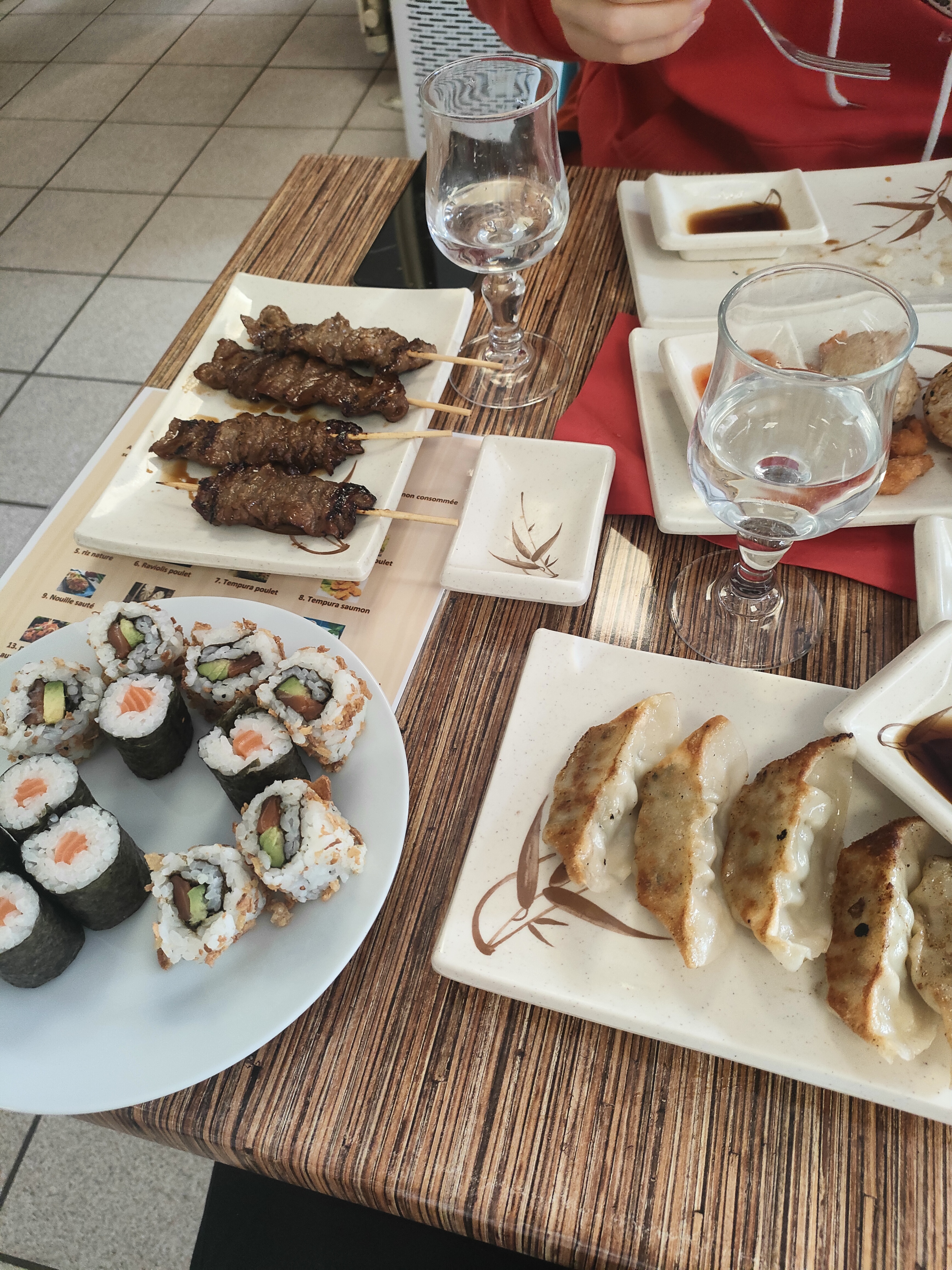 Bof , nous avons prit le menu a la carte a volonter prit plusieurs plats . Et cest moyen les fritures ont un gout u amere , les preparations a base de poulet sens bizarre et goute bizarre aussi . Lambiance la bas y est rythme de temps a autre de petit bruit entrecouper dun silence de cathédrale. 20euros pour ca cest vraiment chère et la carte sans les sushis et petite
