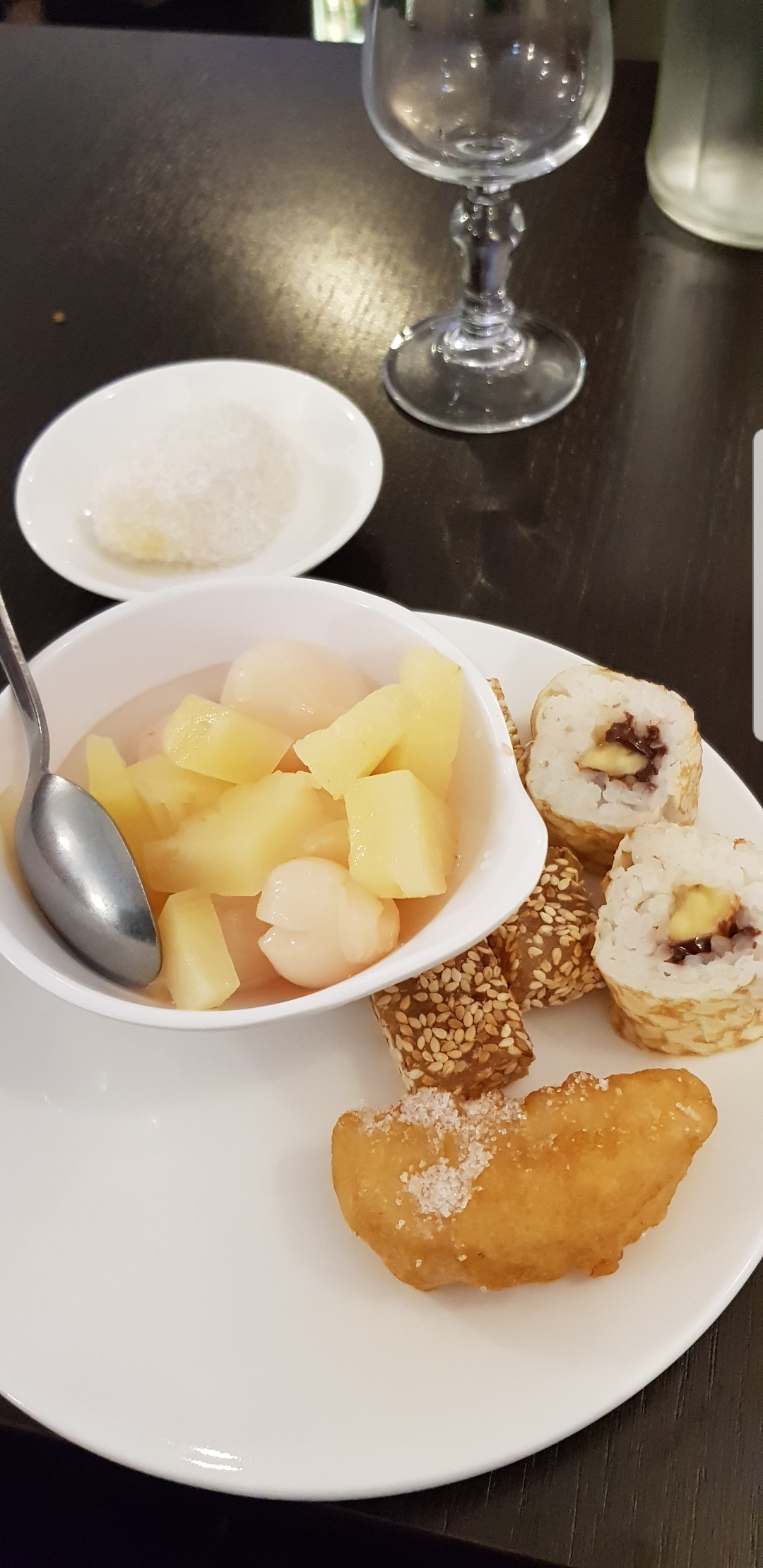 Les sushis, machis et californias sont assez bons, nonobstant, la qualité de la nourriture chaude laisse à désirer, à vrai dire la nourriture n'est pas vraiment chaude, mais plutôt tiède, voir froide! De plus, un des samoussas n'était plus propre à la consommation, en effet ce dernier (en plus d'être froid) avait un goût de détritus! Les desserts quant à eux restent corrects. Le lieu reste propre et chaleureux, et le personnel est accueillant. Pour conclure si vous allez à cette adresse, ne mangez que sushis et desserts, évitez absolument tout ce qui est chaud.