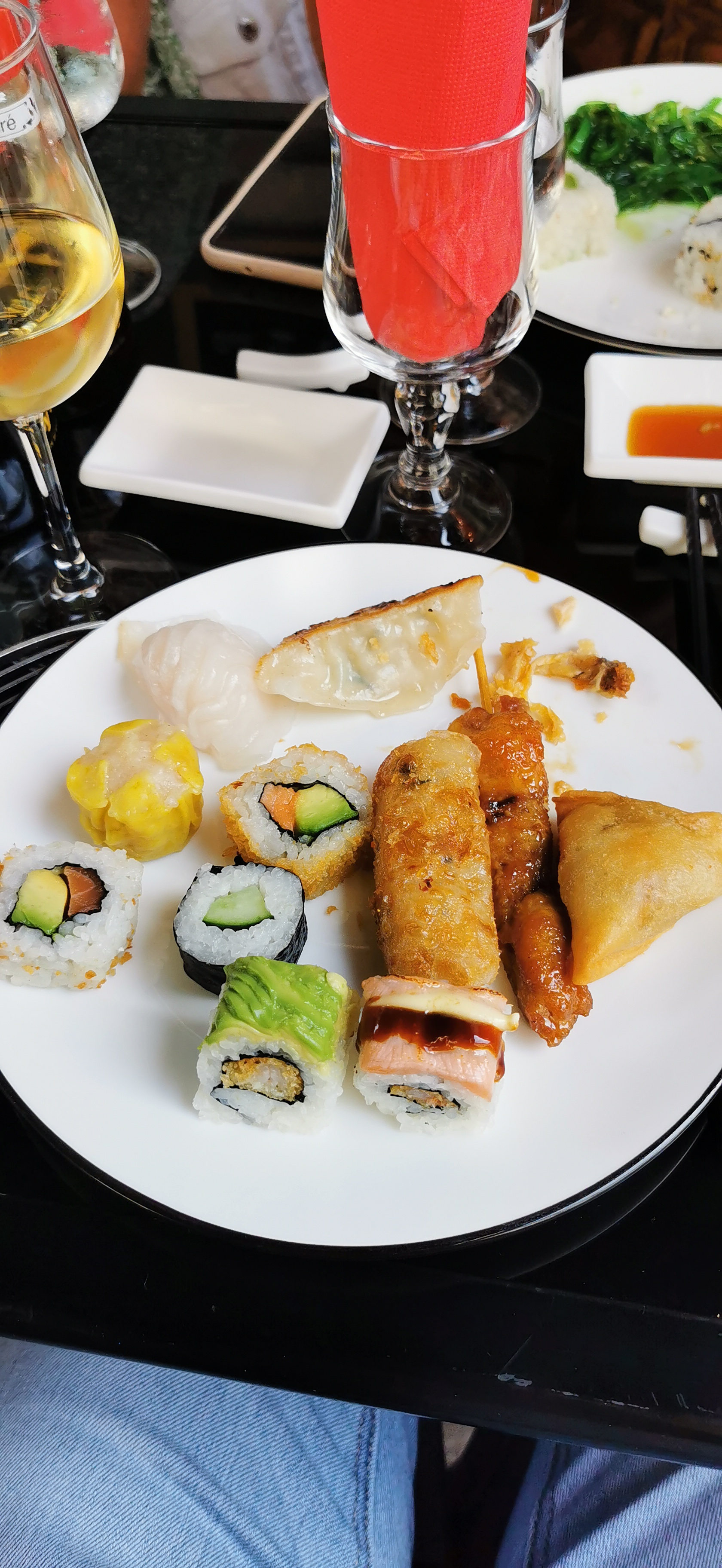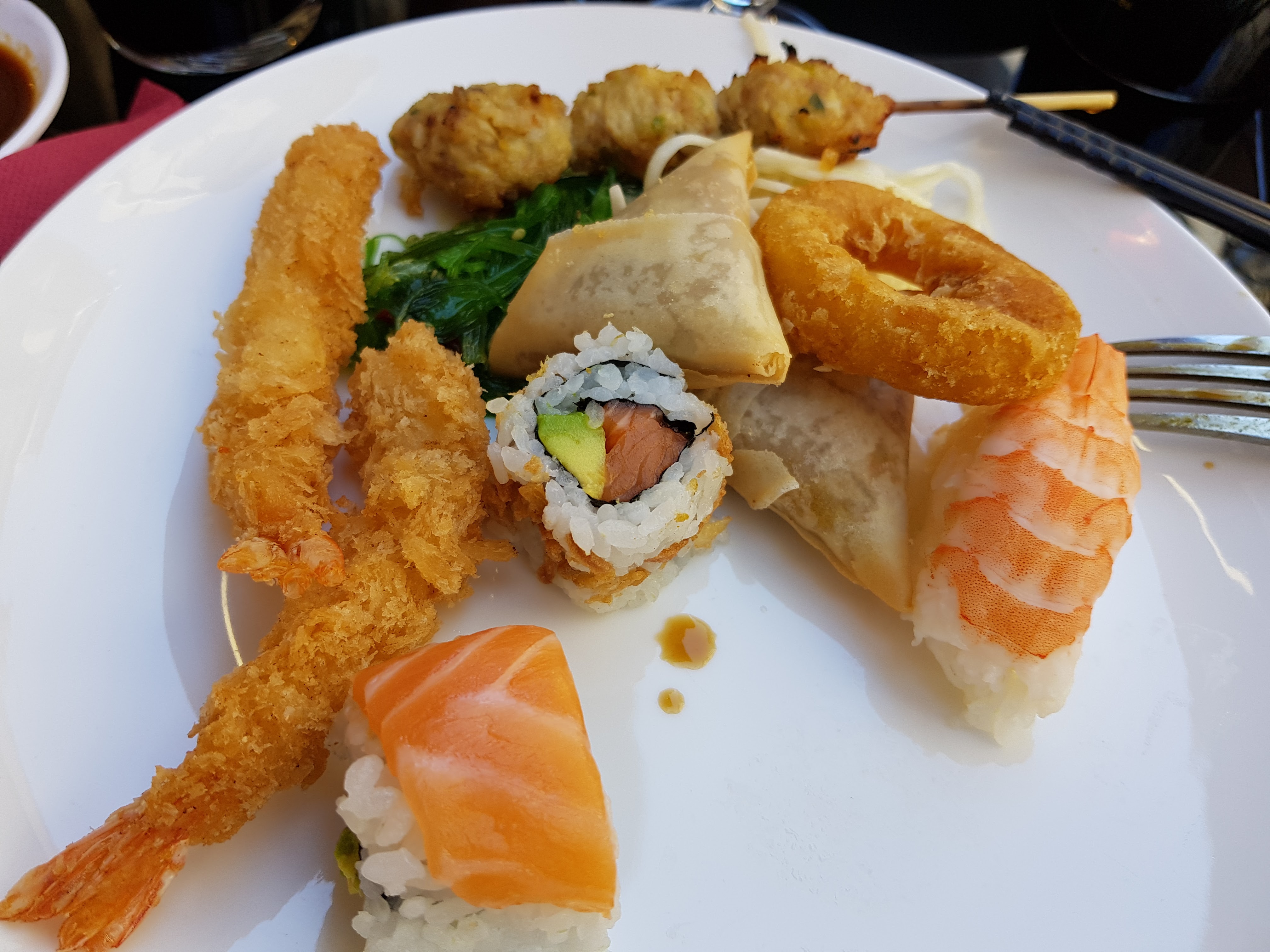 Commençons par l'emplacement, il est bon le restaurant est bien placé, facile à trouver mais la décoration ne nous mets pas dans l'ambiance. L'accueil était plutôt froid comme si nous n'étions pas les bienvenus, nous avons néanmoins vite été placé et invités à prendre une boisson et à manger. Pour ce qui est des sushis le choix était là même s'il manquait certains sushis indiqués sur la carte, mais le goût n'était là que partiellement. Les sushis étaient plutôt fade ils donnent l'impression de venir du supermarché d'à côté, pour autant ils restent bon avec un grand choix mais nous aurions préférés la qualité à la quantité. Pour le reste à part les raviolis chinois il faut mieux éviter. Sois ce n'était tout simplement pas bon je pense surtout au brochettes bœuf fromage qui était tout sauf du boeuf nous n'avons même pas réussi à identifier la viande. Sois c'était juste froid donc pas très agréable à manger. Pour conclure je vous ne le recommande pas mais il n'est pas forcément à fuire.
