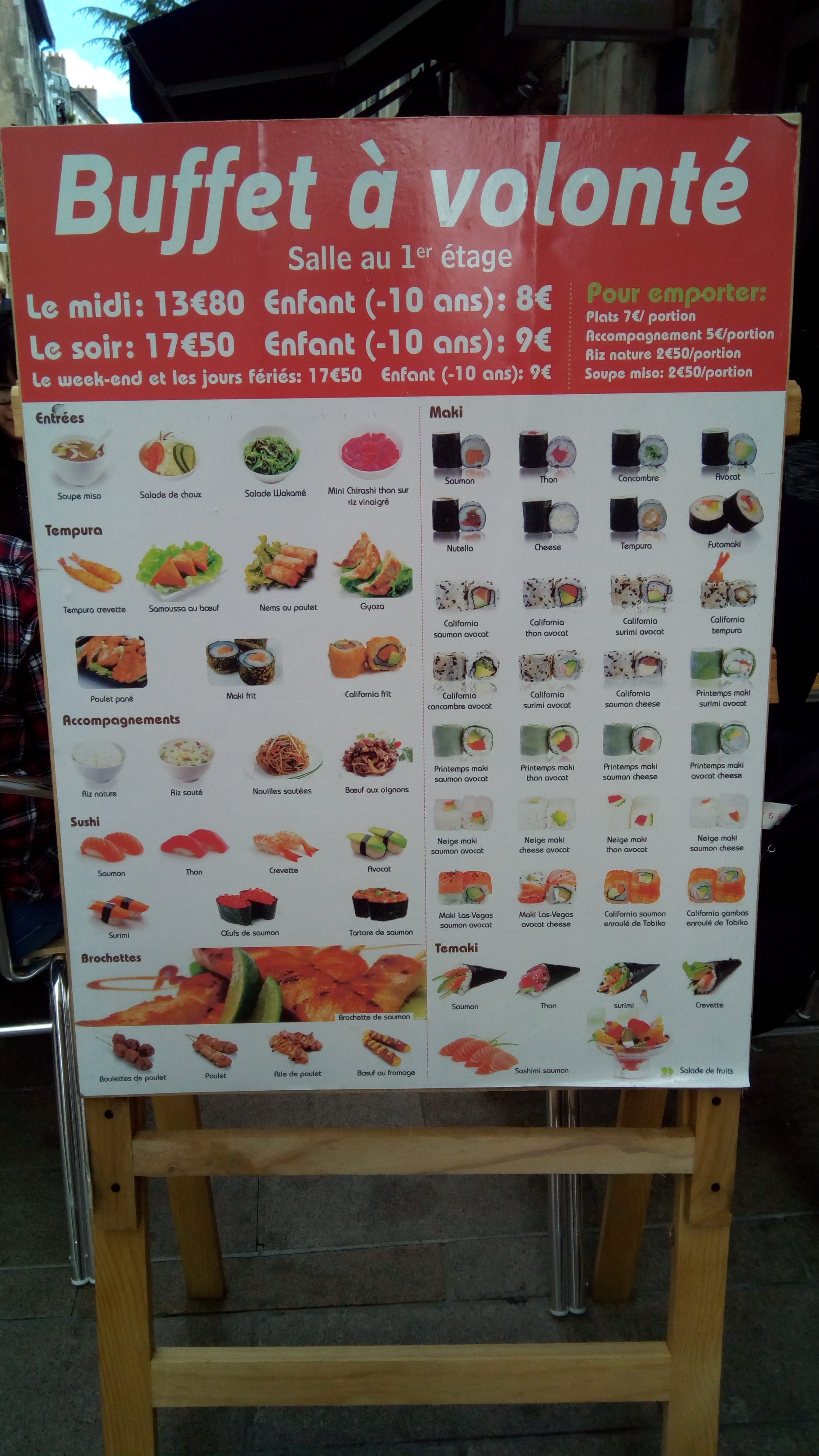 Sushi a volonté, 18 euros le soi 14 le midi, large choix de produits ( sushis, nouilles, nems, beignets, dumbling, riz, soupes, désert) , les serveurs sont très accueillants, et toujours souriants, pour nous c'est un plaisirs de s'y rendre.