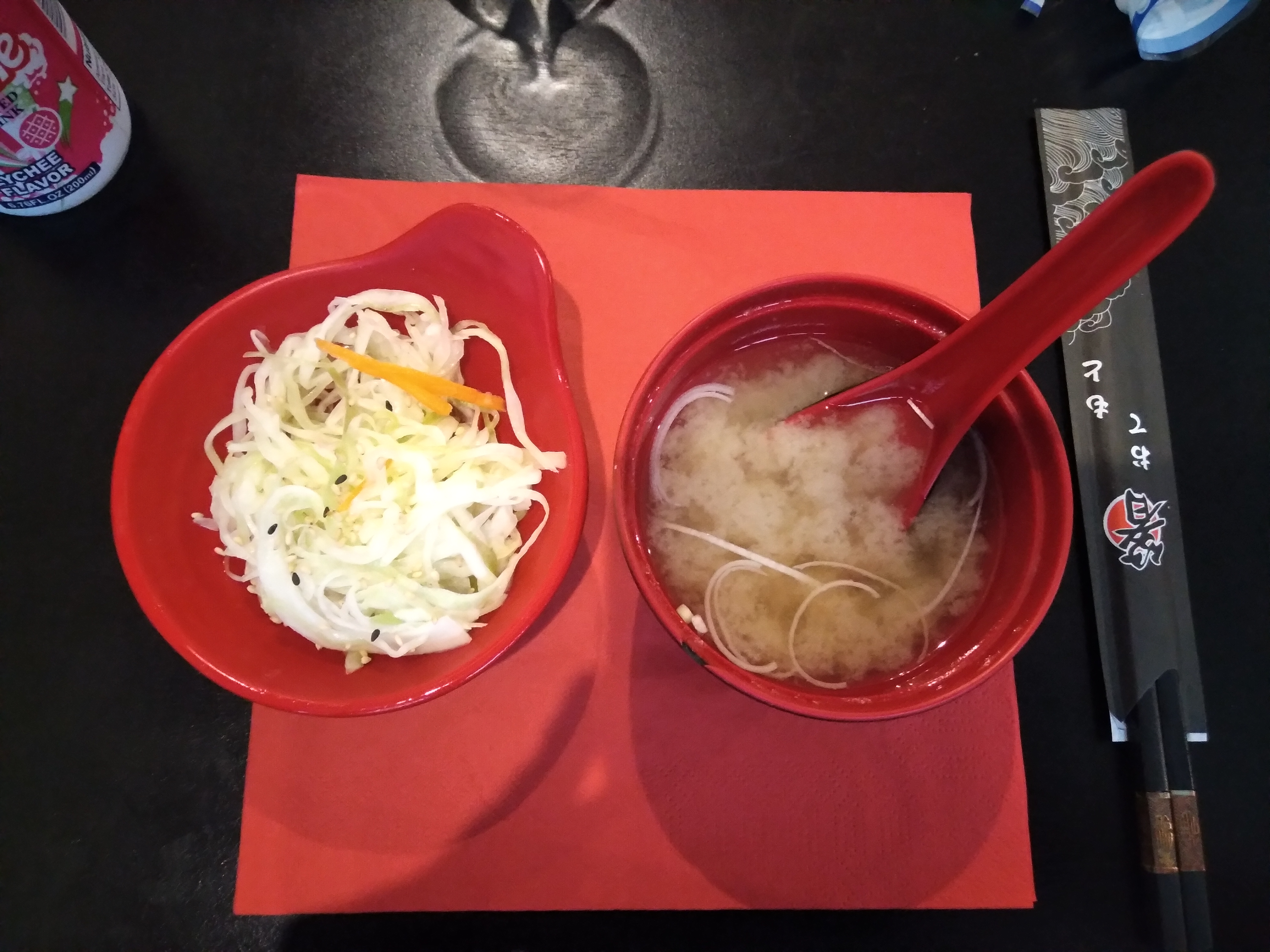 C'est correct, pas exceptionnel non plus. Les makis et les sushis sont bons. Les sashimis sont corrects, sans plus. La présentation de ces trois plats est raffinée, un vrai paysage japonais. Le vin rosé au pichet est surprenant, et bon avec son goût réglissé. Heureusement que nous en avions commandé, car il ne nous a pas été proposé d'eau. Le plat de salade est très peu garni et quelconque. Autre point négatif : la soupe, insipide, très claire, trop peu garnie (voir la photo). La soupe brûlante et la salade sont servies dans de la vaisselle en plastique. On s'attendrait à de la céramique. Les baguettes sont en plastique. Ça fait cheap, vraiment pas très classe. J'adore la cuisine japonaise et le raffinement qui va avec. Un peu déçue de ne pas trouver de serviettes chaudes par exemple. C'est un restaurant tout de même, avec des prix de restaurant. Dans un autre avis, il est écrit qu'il n'y a pas de différence avec Wok 41, sauf que c'est plus cher. Ce n'est pas faux. Le rapport qualité/prix est favorable à Wok 41. C'est toutefois un peu moins bruyant, enfin pas tout le temps : la serveuse ou les clients qui viennent chercher les plats à emporter ne sont pas discrets. Si vous cherchez une atmosphère zen, comme on peut la trouver dans certains restaurants japonais, ce n'est pas le bon endroit.