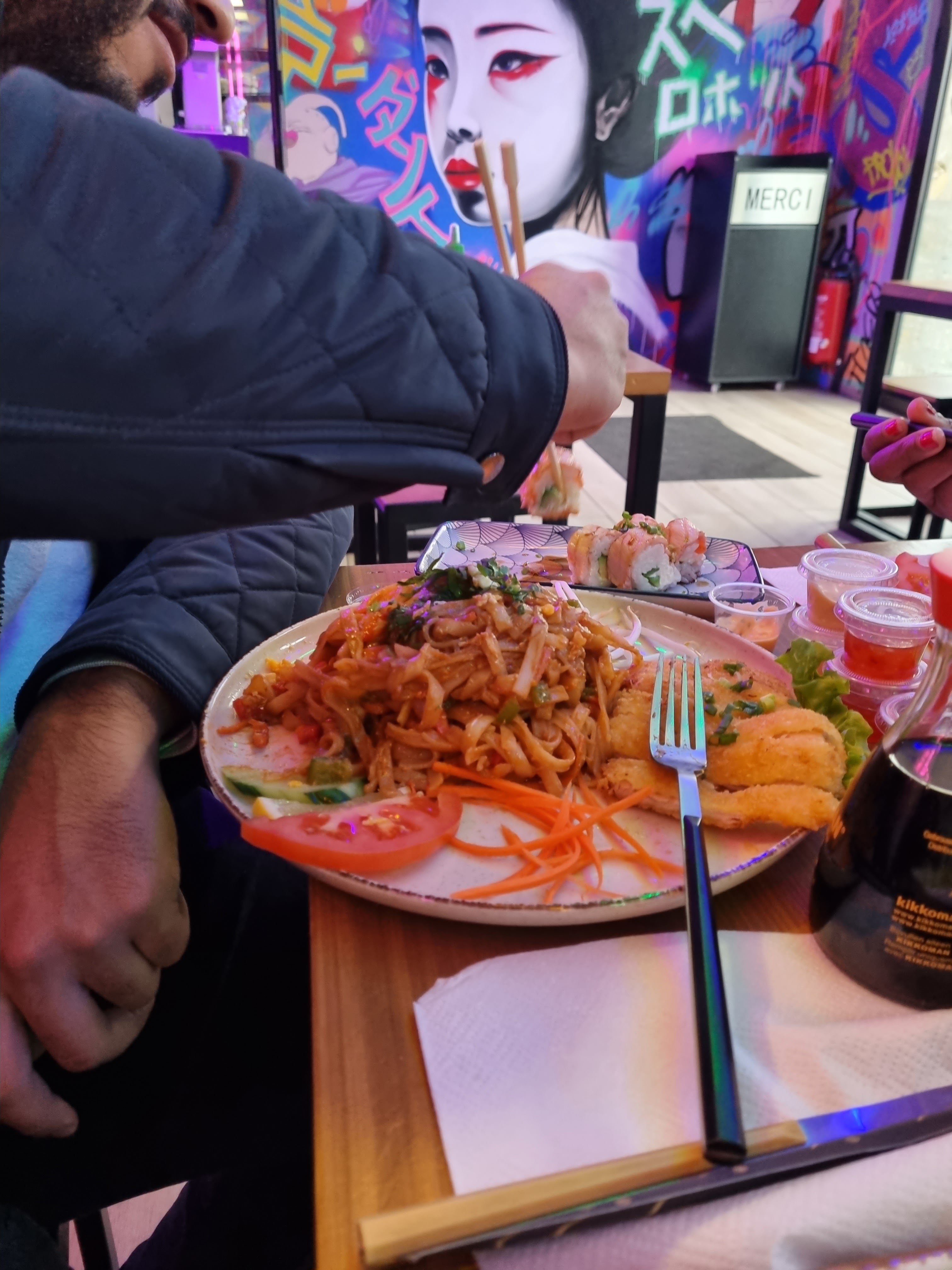 Posté le 29/07/2024 à 09:05"Rien a dire et à redire sur ce restaurant à part que je me suis régalée, lorsque vous y entrez vous ressentez direct une atmosphère différente, très chaleureuse grâce au personnel et au gérant mais aussi grâce à la déco et les LEDs. J'ai pris la salade de mangue épicé, elle m'a rappelé la salade de papaye de Thaïlande donc merci ! Les dynamite rolls sont des monstrueux maki surmontés d'une crevette pané et frit, vraiment très bonne recette ! J'ai remarqué que le surimi à l'intérieur était de bonne qualité ( de tout façon on le ressent que la qualité et l'amour sont au rendez-vous)! Merci et à bientôt !"