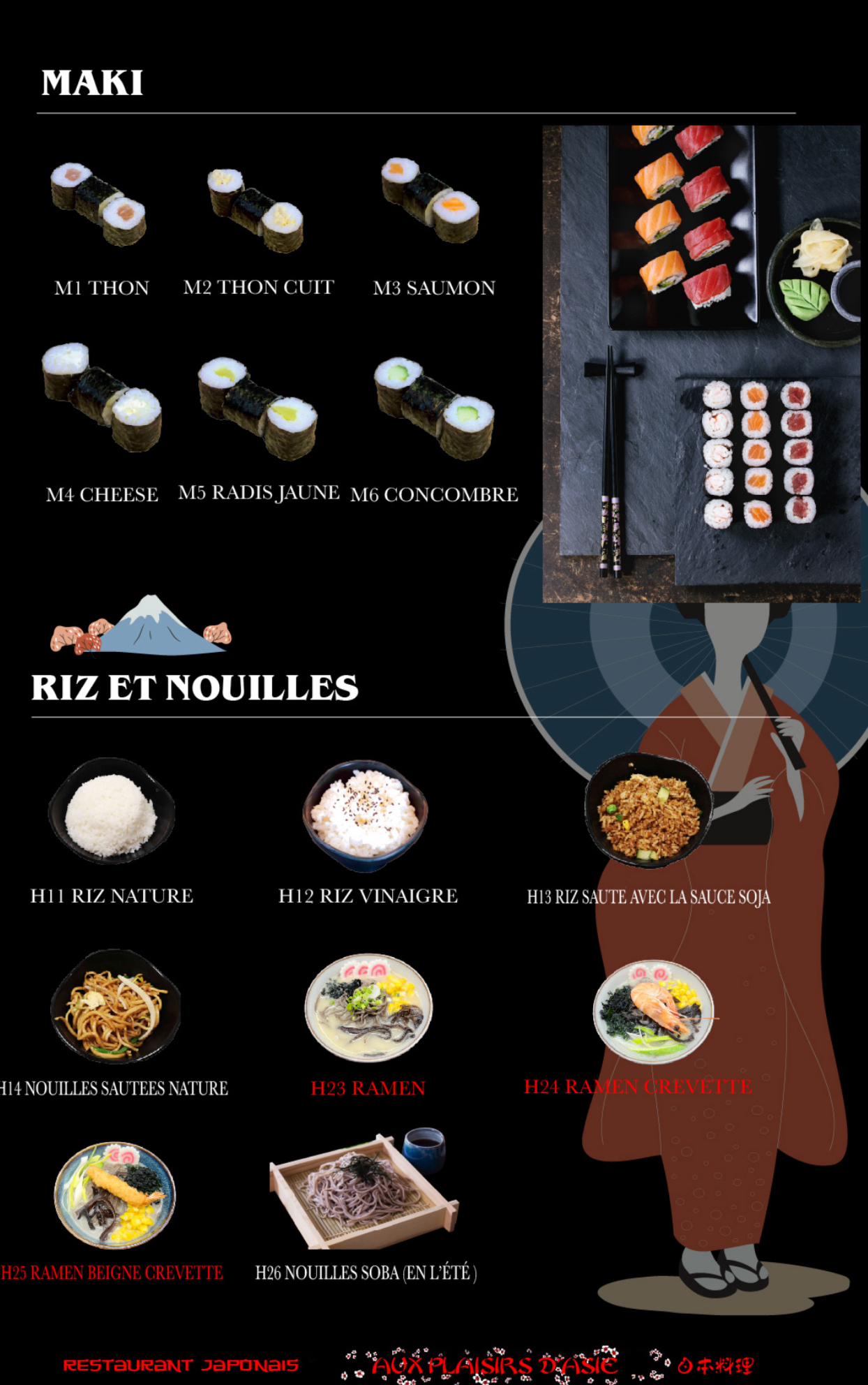 Très large choix pour les amateurs de sushis, makis et sashimis. Ils sont frais et très bons ! De même pour tous les plats chauds (nems, brochettes Yakitori, plats sautés...). Il faut cependant y aller dès l'ouverture, car dès qu'il commence à y avoir du monde, très bruyant et peu intime de par la proximité des tables. Aussi, faites bien attention aux sauces car nous avons déjà eu à deux reprises des fourmis à l'intérieur... Tellement dommage pour l'image du restaurant, qui sert à mon goût, des produits de qualité !