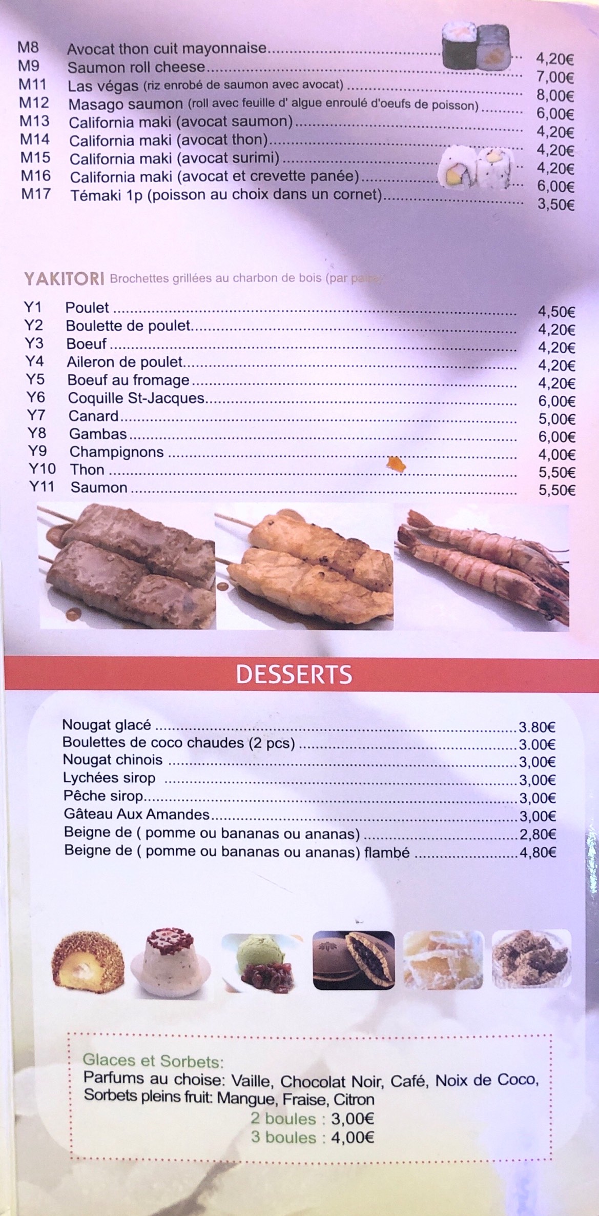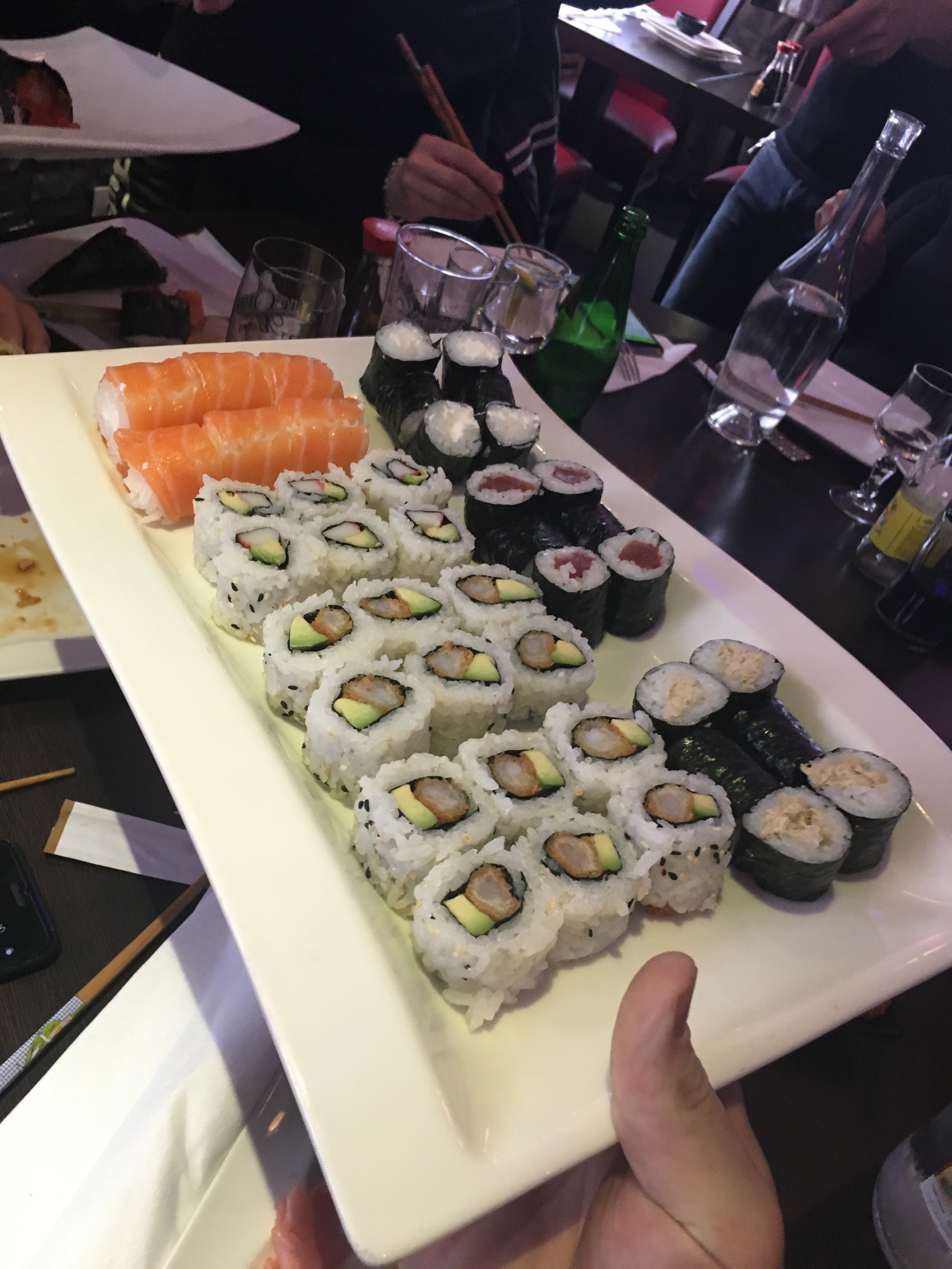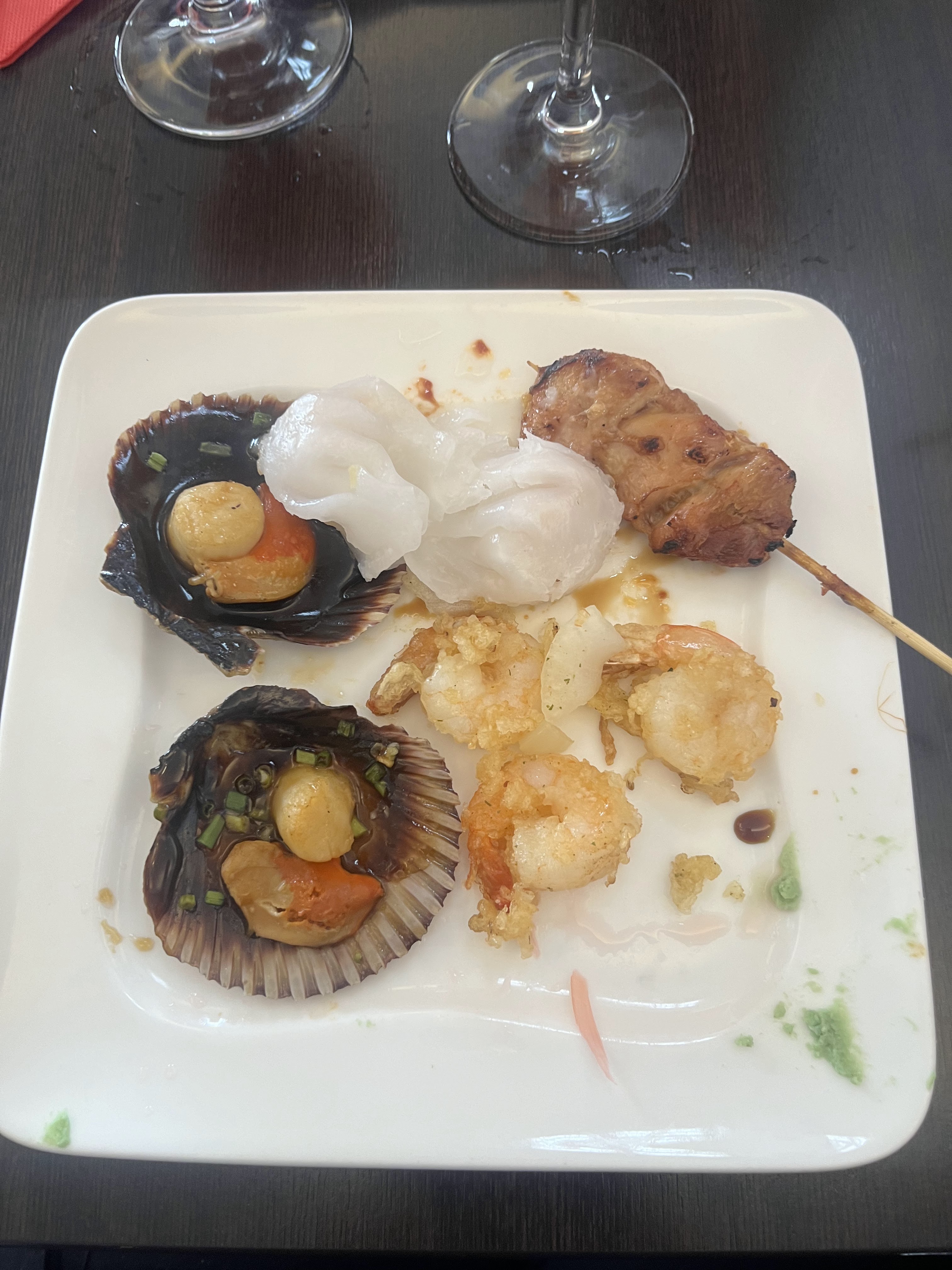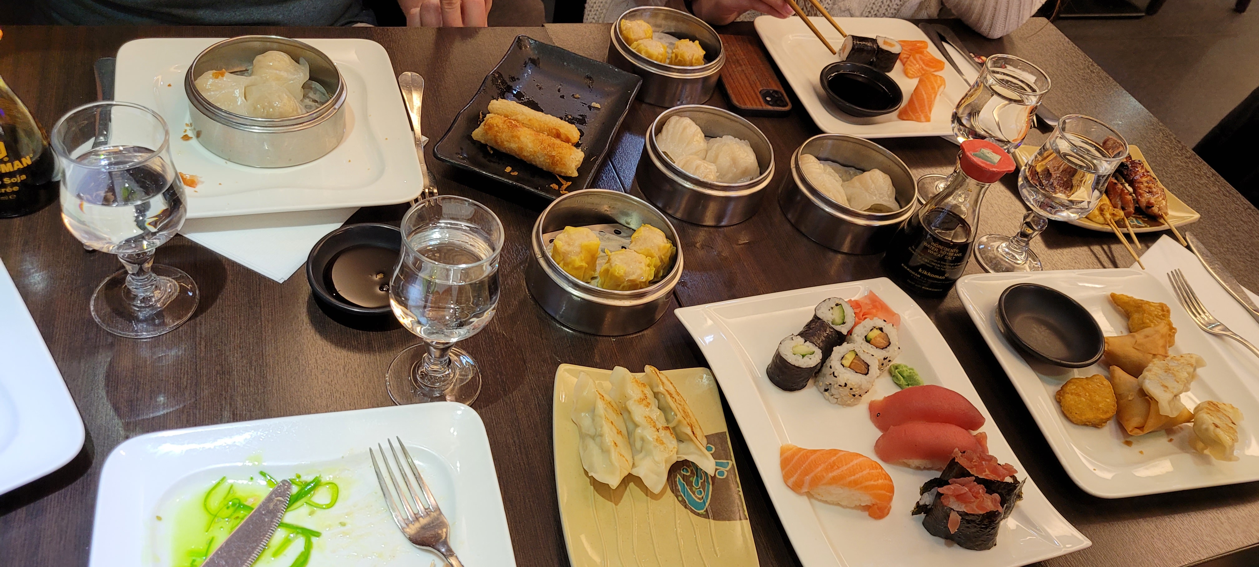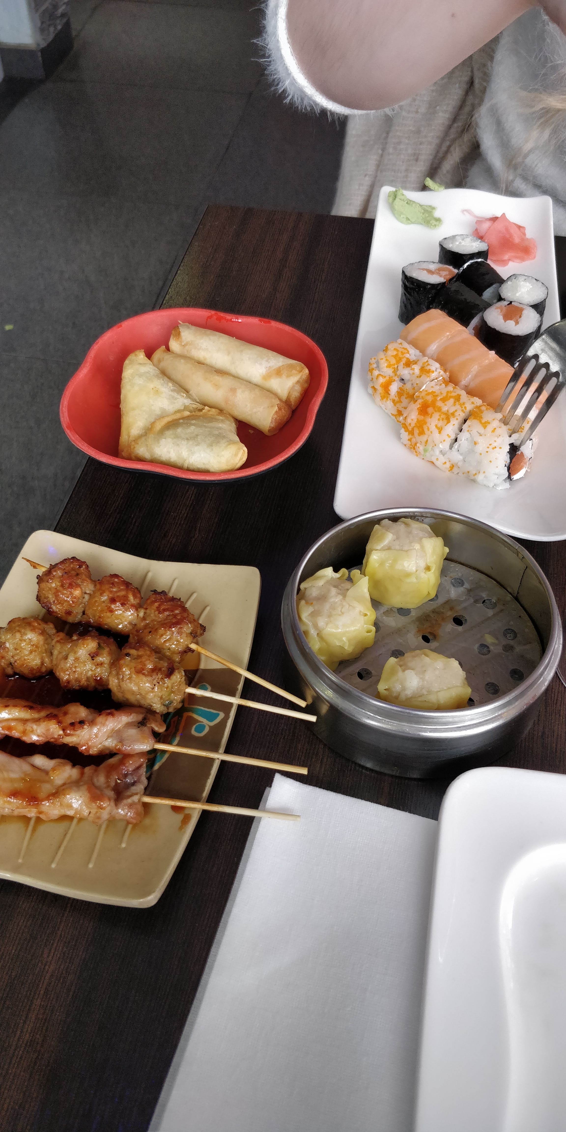 Un grand restaurant type buffet chinois/ japonais, l'accueil et le service n'est pas leur fort, l'objectif c'est la quantité de plats servis ! Par contre au niveau qualité de la nourriture on est quand même bien meilleur que la plupart des buffets, rien à redire de ce côté là (le marché gare juste en face est sûrement un source de produits ultra frais). Nous avons pris menu japonais à 23,90€ on vous donne alors une tablette pour la table avec 5 plats par personne par 15min. Cela veut dire que à 4, nous pouvions commander 20 plats (sushis, sashimis, riz, yakitori....) toutes les 15min. Évidemment niveau dessert il faut pas se leurrer rien n'est fait maison, je me suis contentée des fruits au sirop 😉