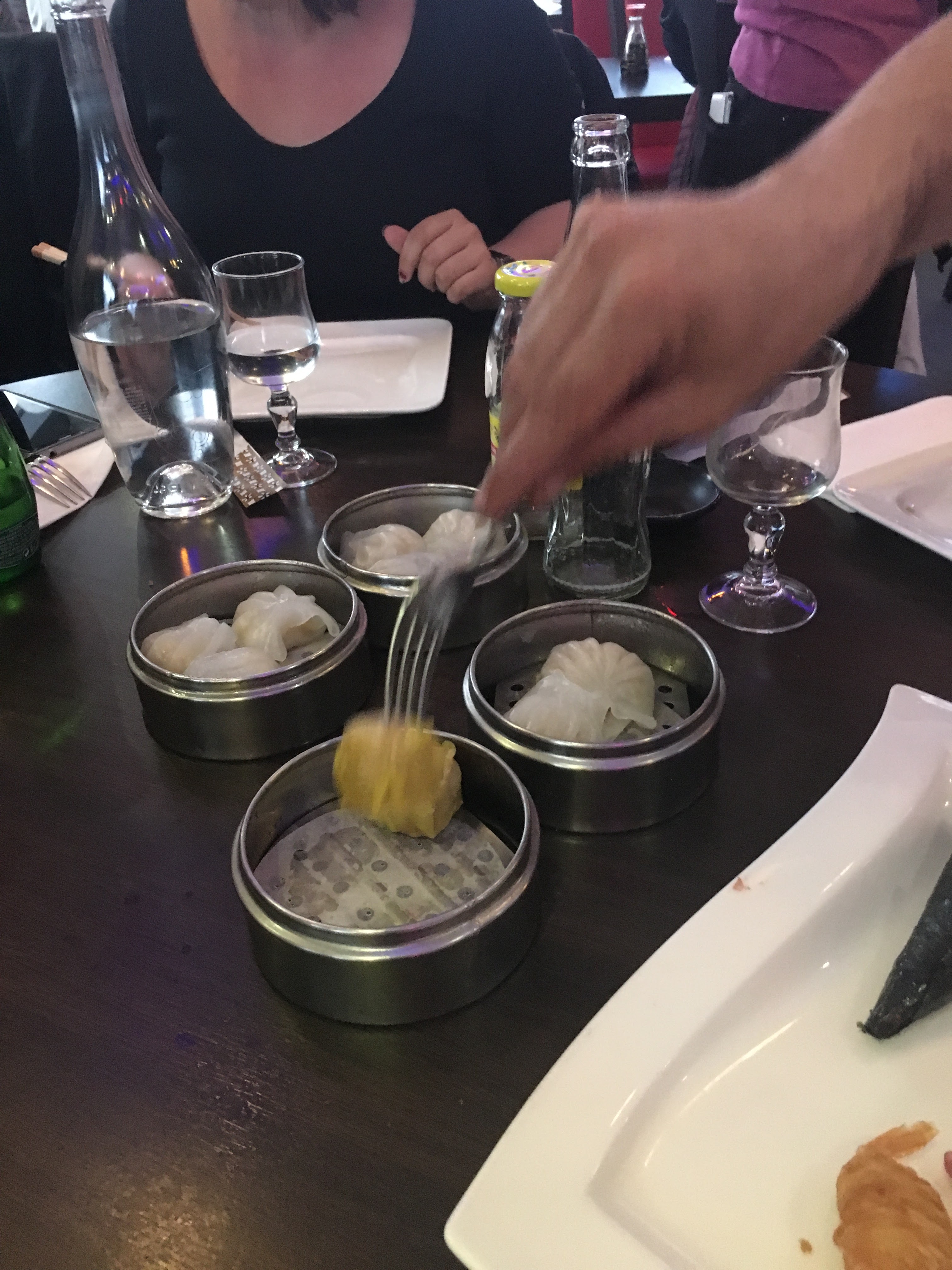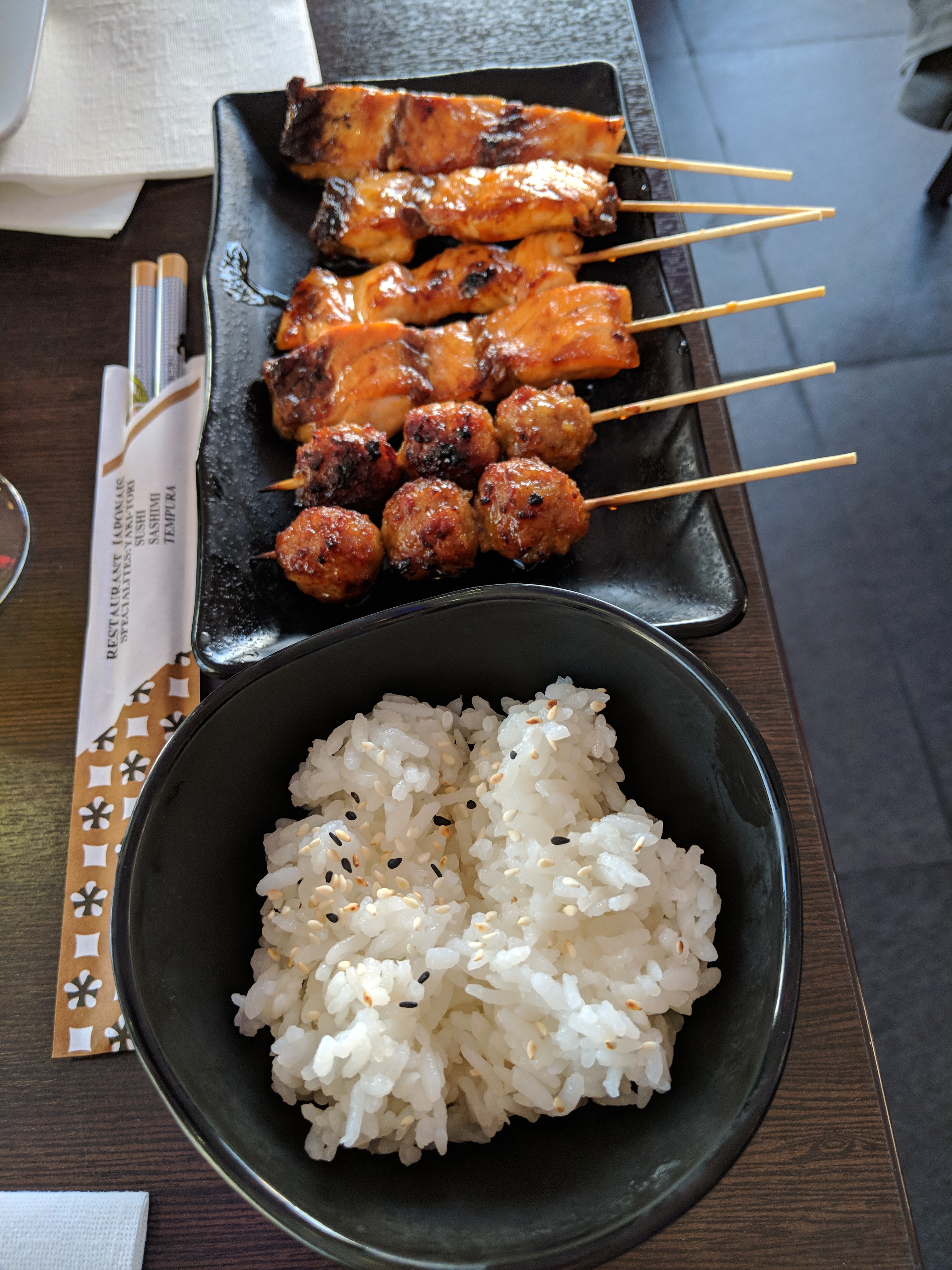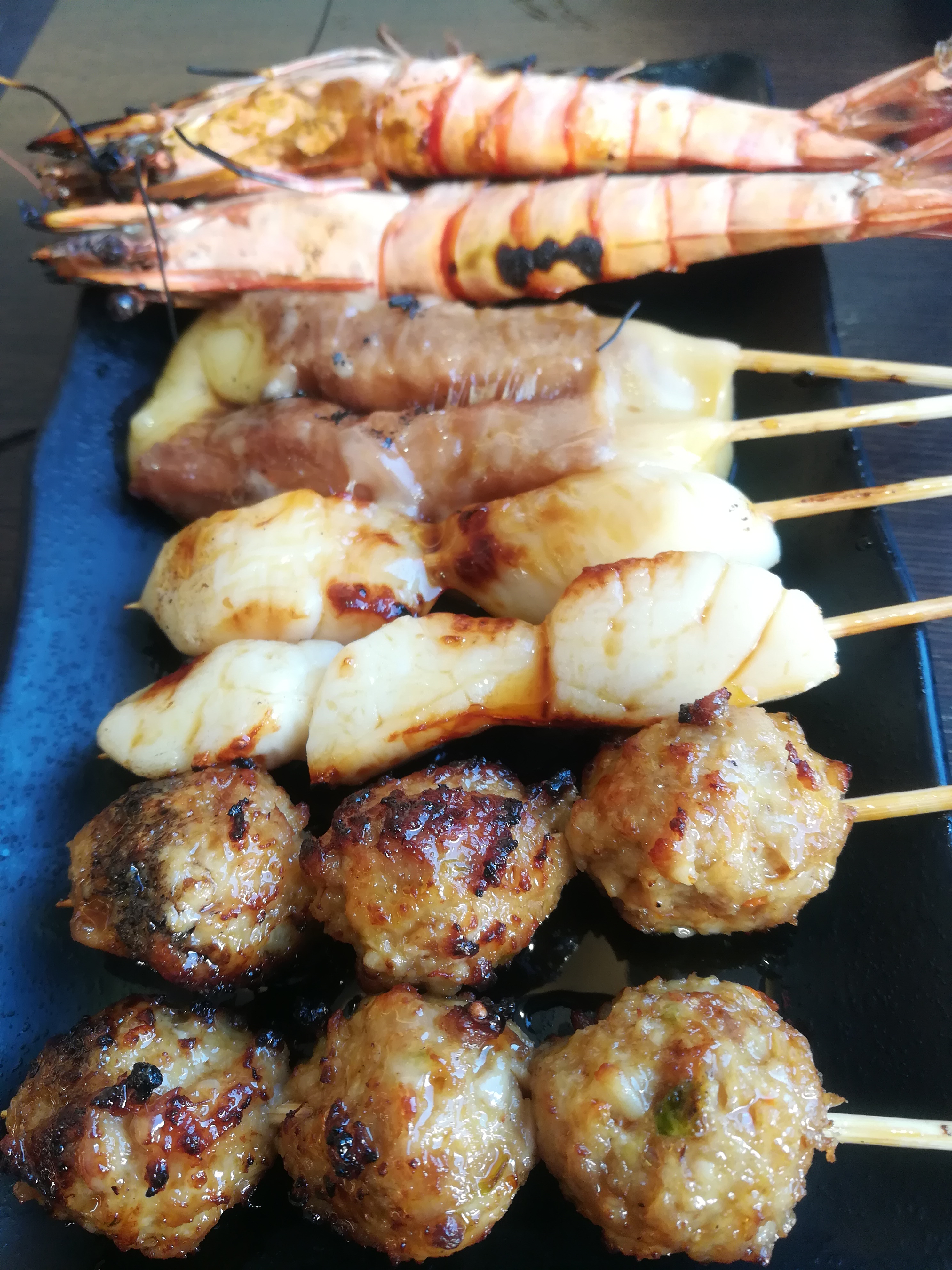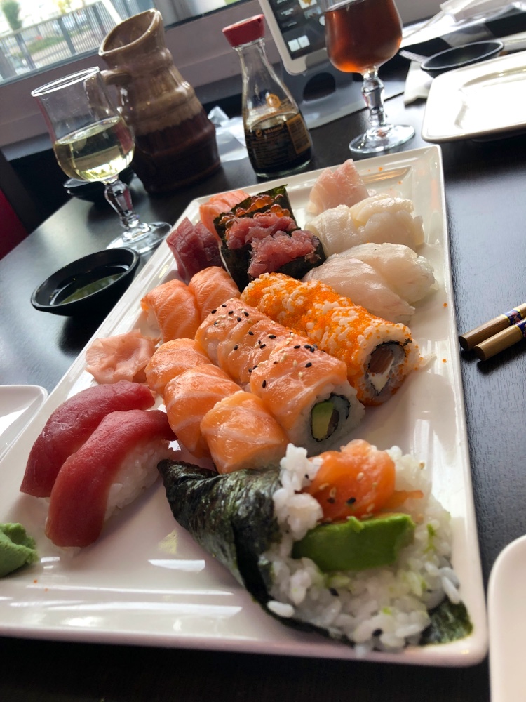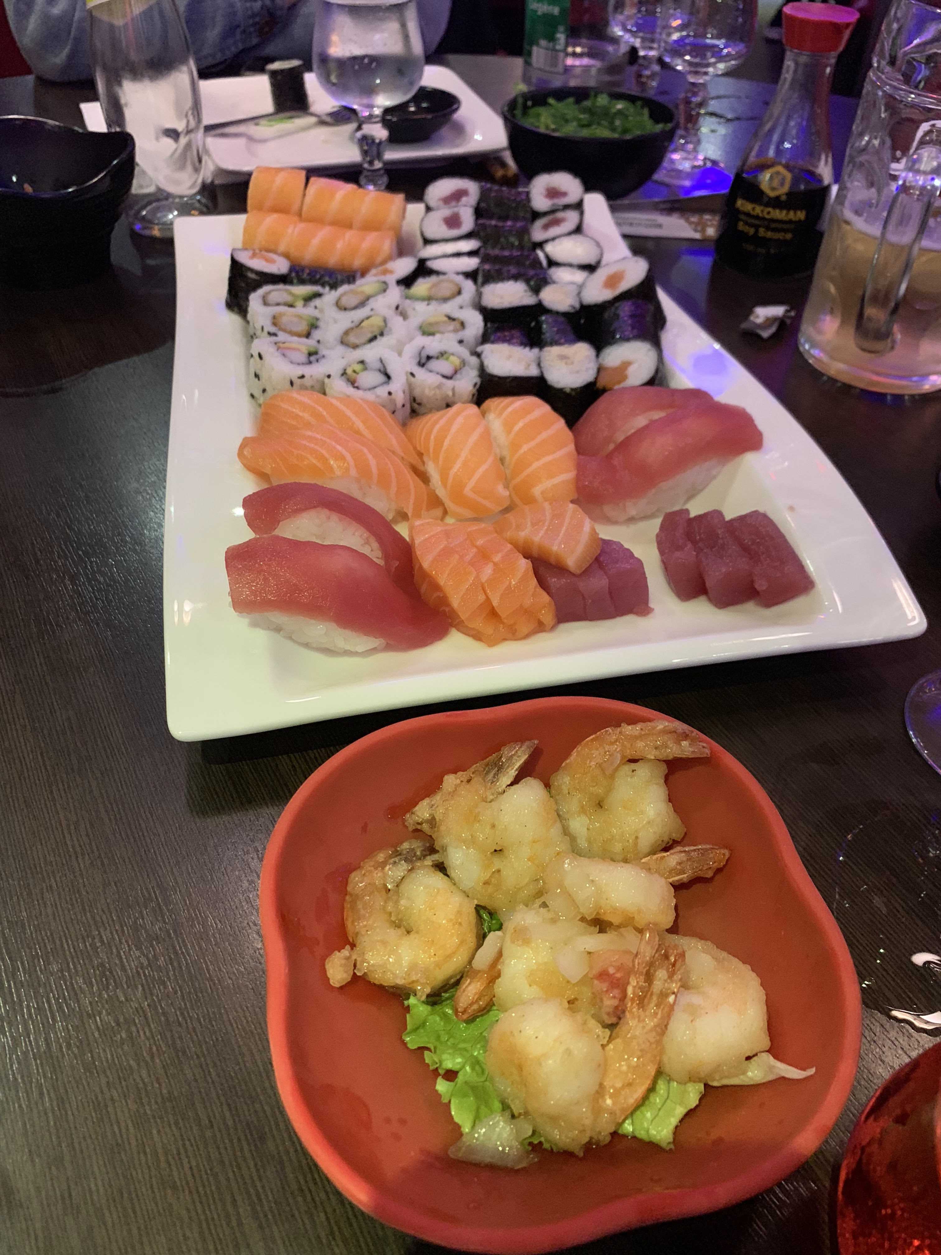 Un grand restaurant type buffet chinois/ japonais, l'accueil et le service n'est pas leur fort, l'objectif c'est la quantité de plats servis ! Par contre au niveau qualité de la nourriture on est quand même bien meilleur que la plupart des buffets, rien à redire de ce côté là (le marché gare juste en face est sûrement un source de produits ultra frais). Nous avons pris menu japonais à 23,90€ on vous donne alors une tablette pour la table avec 5 plats par personne par 15min. Cela veut dire que à 4, nous pouvions commander 20 plats (sushis, sashimis, riz, yakitori....) toutes les 15min. Évidemment niveau dessert il faut pas se leurrer rien n'est fait maison, je me suis contentée des fruits au sirop 😉