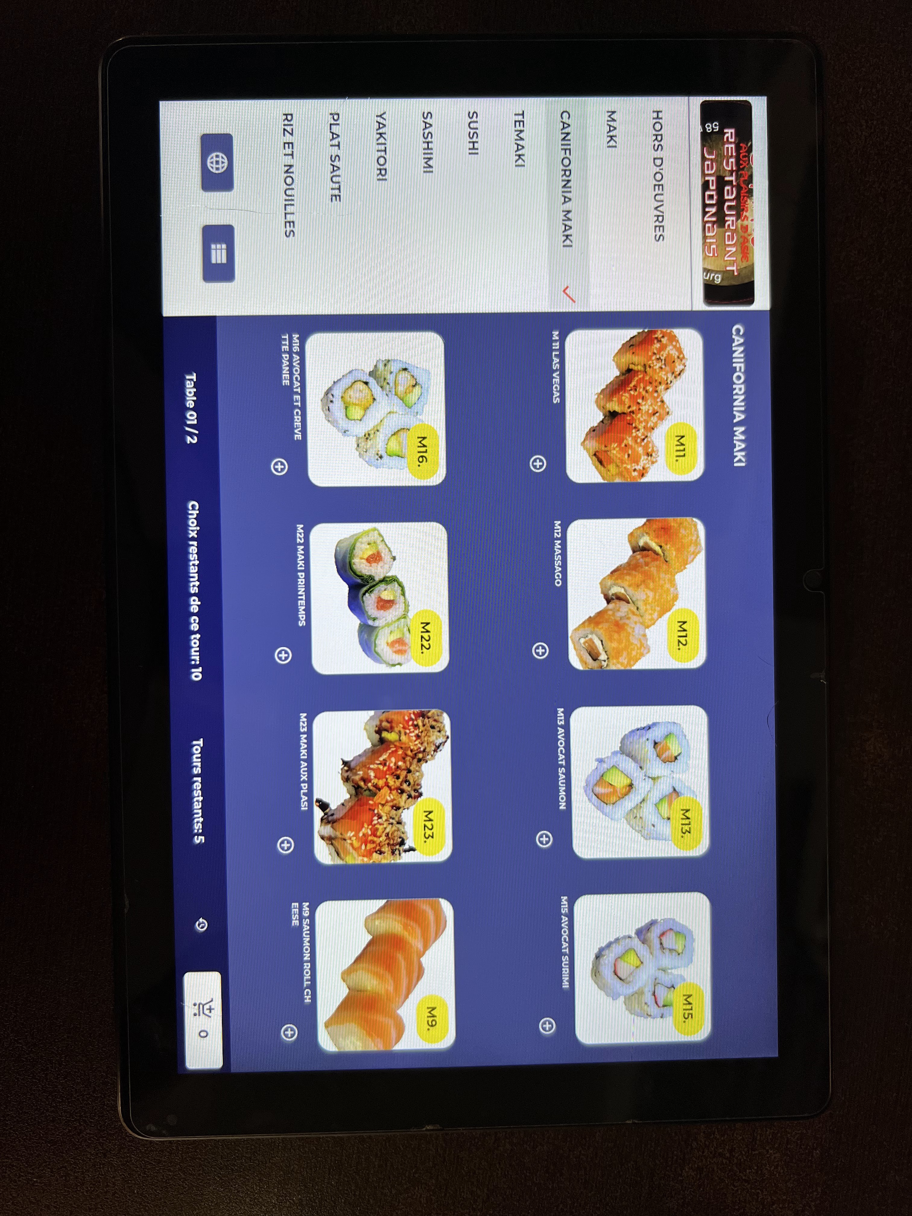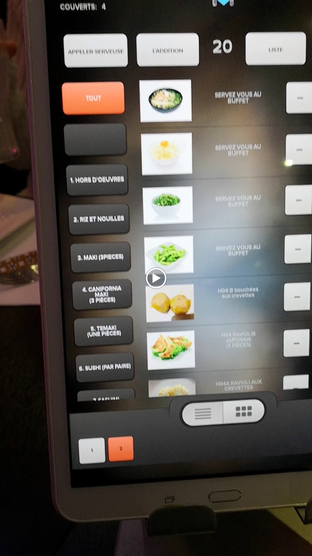 Oublie des plats commander même en demandant à la serveuse, alors menu tablette, le japonais est plus cher que le menu chinois et cela pour 5sortes de maki de différence, si vous prenez japonais vous payé 5e plus cher pour pas grand-chose finalement contrairement aux autres restaurant asiatique où l'on se sert à volonté d'où le prix reste le même. Serveur qui se permet de faire des réflexions si l'on goûte un maki chez son conjoint... Mieux vaut un buffet à volonté où on se lève pour se servir, avec un personnel bien aimable qui vous demandent si c'était correct avec serviettes chaudes agréable en fin de repas, ce qu'il n'y a vraiment pas dans ce restaurant. Un gros manque de sociabilité et de respect. La net impression que le client n'est pas roi mais un tir argent.