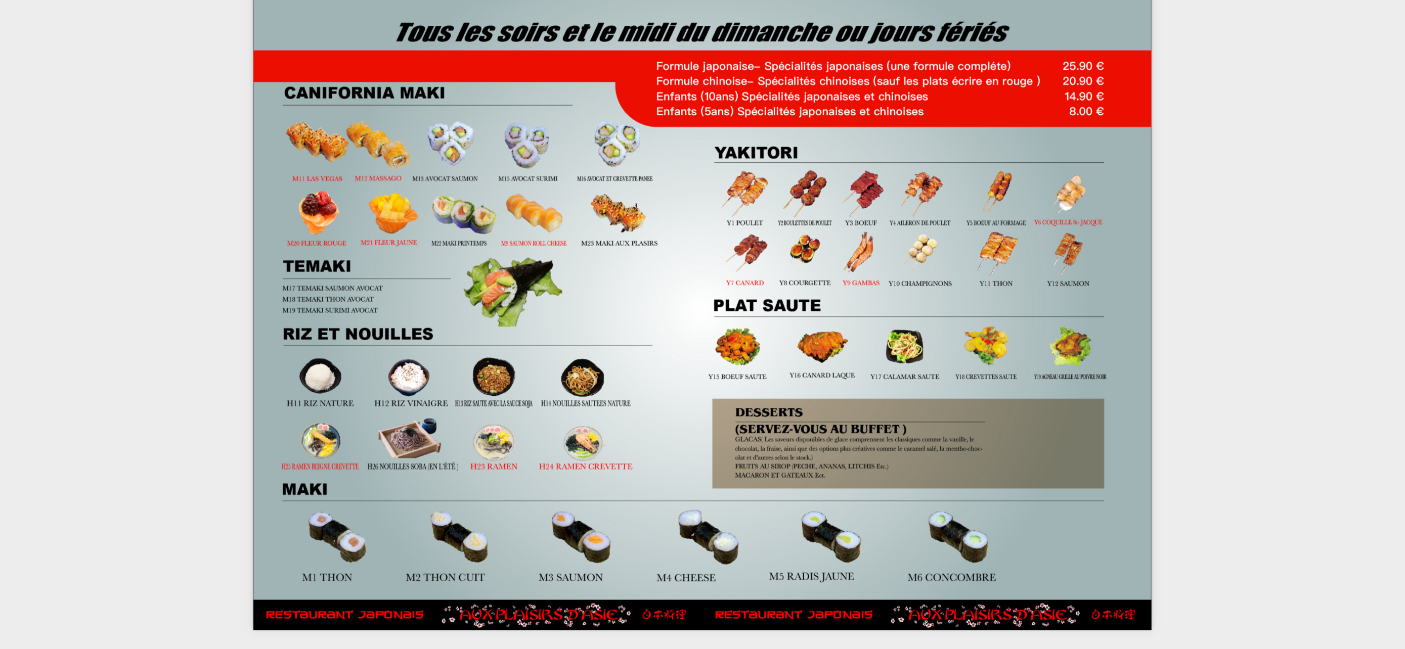 Cet avis vaut pour la formule japonaise le soir. Nous y sommes allés plusieurs fois et jamais déçus. C'est un buffet à volonté donc il faut savoir à quoi s'attendre (service minimal, un peu bruyant si il y a du monde etc), mais les sushis/maquis/brochettes sont très bons, aussi bons que dans un restaurant japonais traditionnels. Il y a aussi des sashimis (4 ou 5 poissons différents), de la soupe miso, la fameuse salade de choux et d’algue... En bref, si vous cherchez à manger japonais et varié, sans vous prendre la tête, c'est le seul buffet à volonté des environs qui est qualitatif sur les produits.