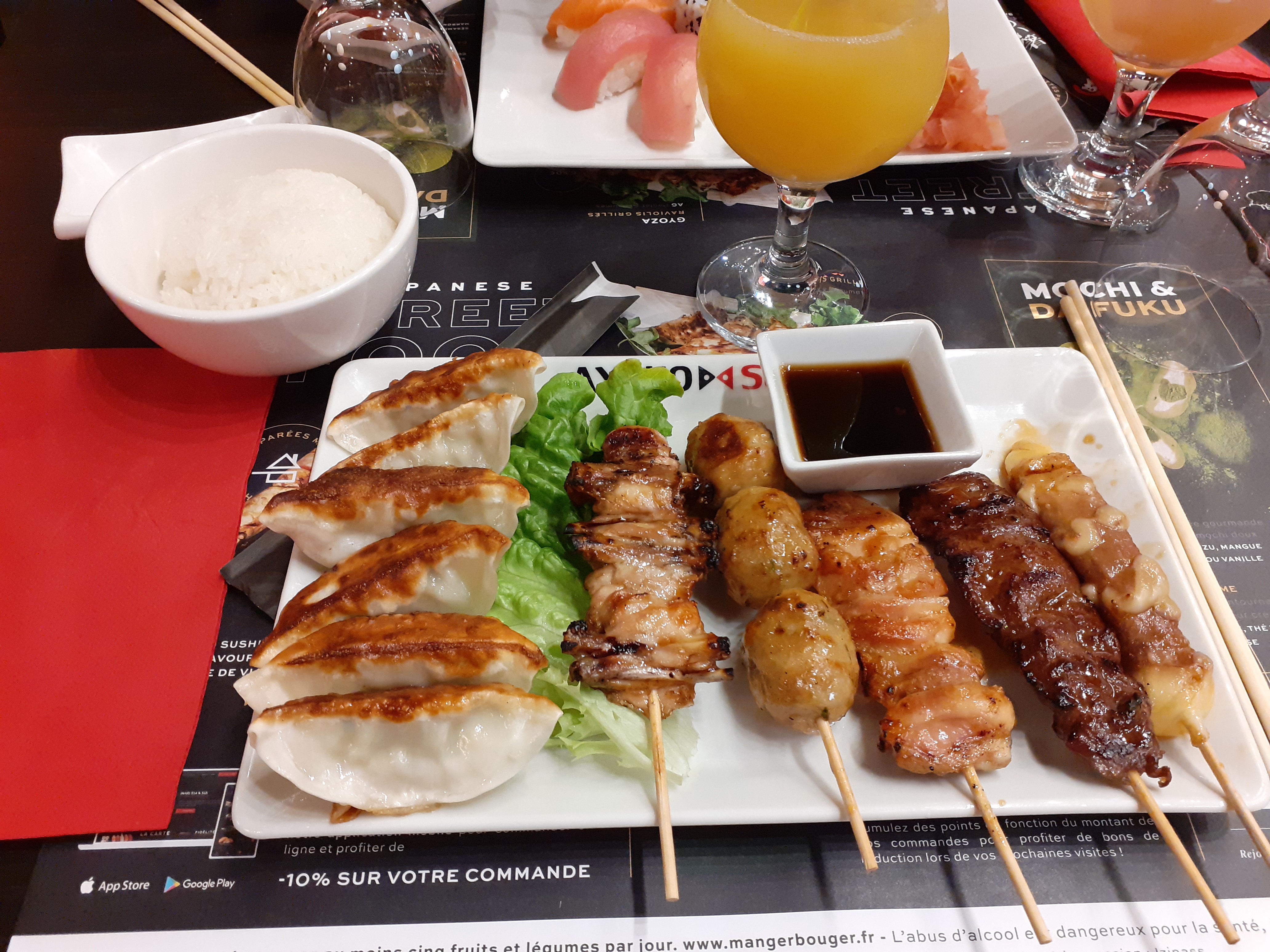 Très bon restaurant japonais Gyozas très bons ainsi que les brochettes. Commande à emporter prête quand je suis arrivée. J avais déjà mangé à l intérieur du restaurant et tout était très bon. Les brochettes ont beaucoup de goût et les mochis sont excellents. J y retournerais très certainement , je recommande ce restaurant. Tout serait parfait s il proposait des ramens 🤤