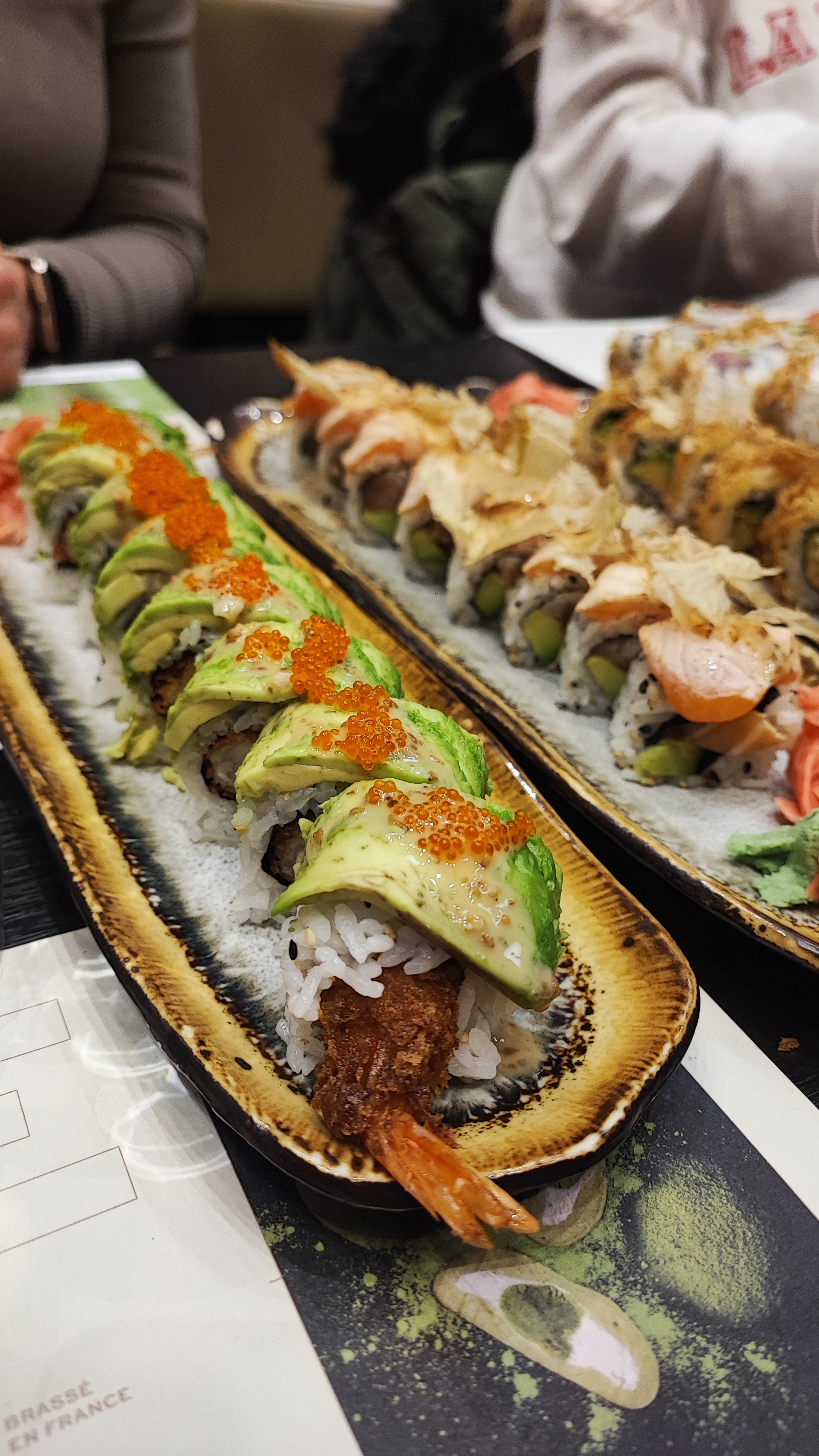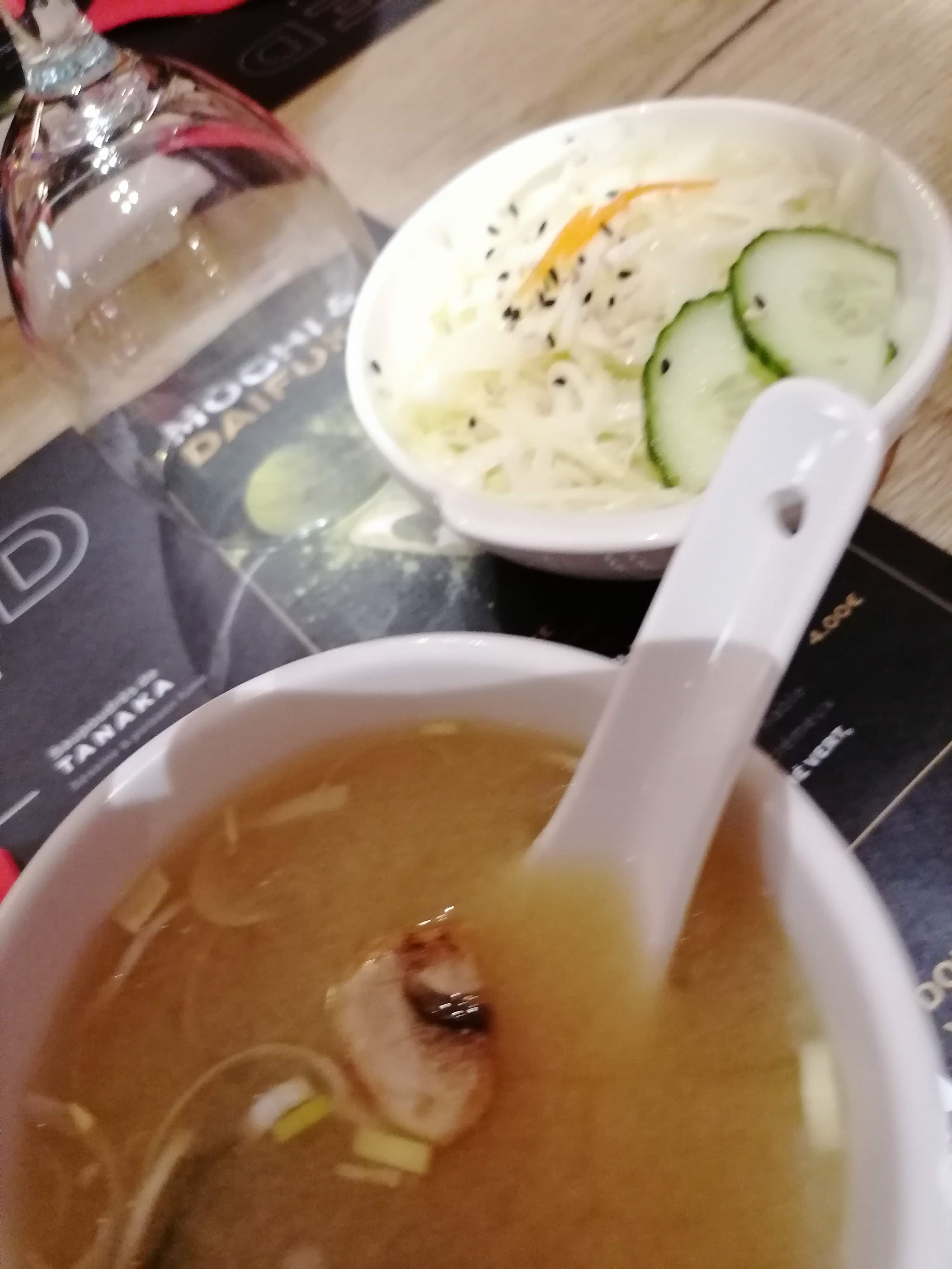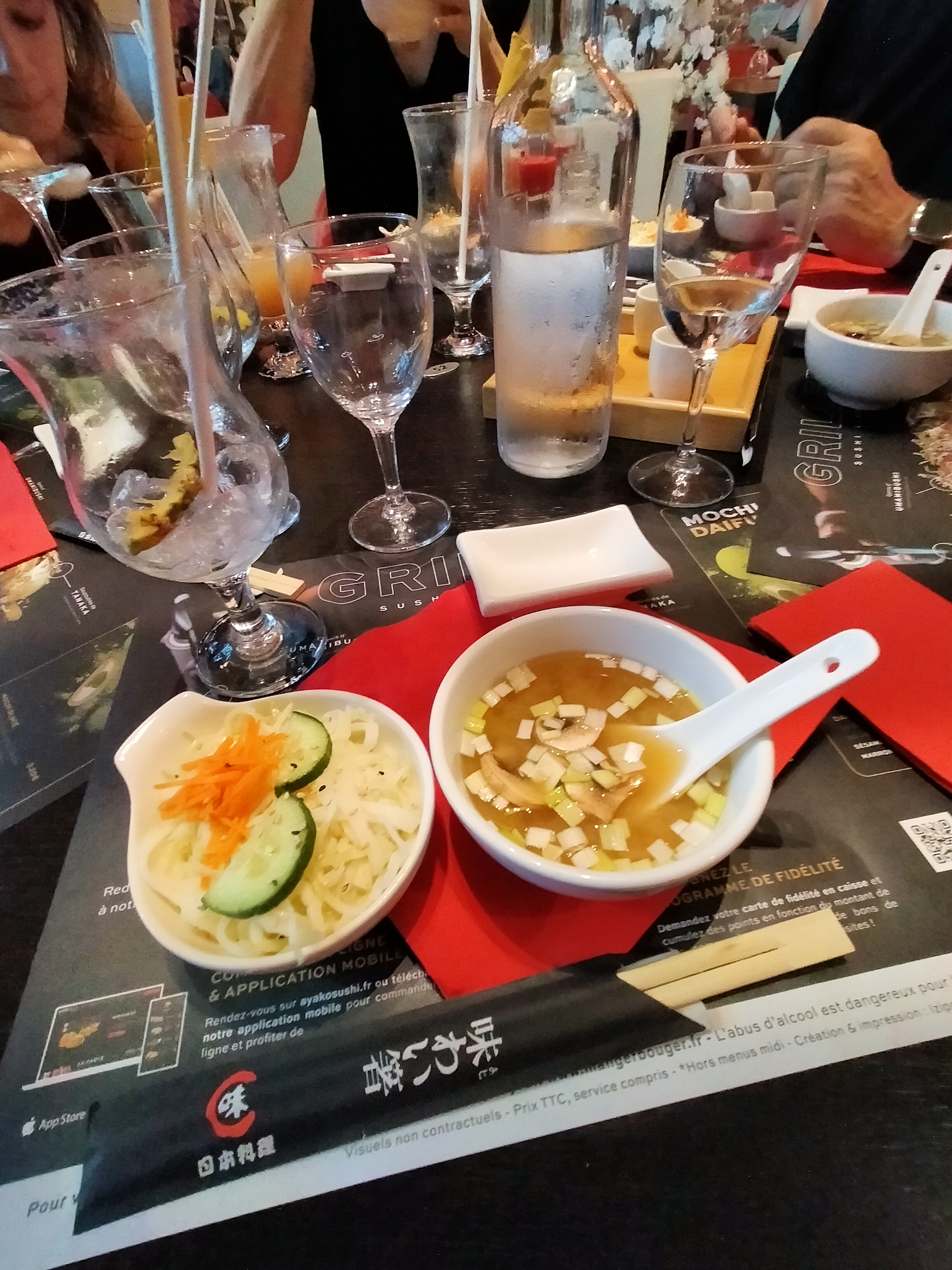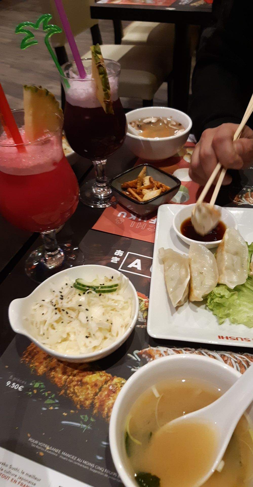 Le service a été long et laissait à désirer mais le personnel était bienveillant. Il y avait plus de riz qu’autres choses dans les sushis…. Et comme si ça ne suffisait pas, nous avons eu du riz en plus que nous n’avions pas commandé. La supposée soupe d’entrée était fade. 16€ les tempura avec seulement 3 crevettes et des légumes en tout genre ( champignons, courgettes, patate douce…) frits qui nous auront fait boire plus d’huile que d’eau à table ( puisqu’il a fallu attendre la carafe un moment ) c’était trop. Les cartes sont en piteuses état et se déchiraient dans nos mains….