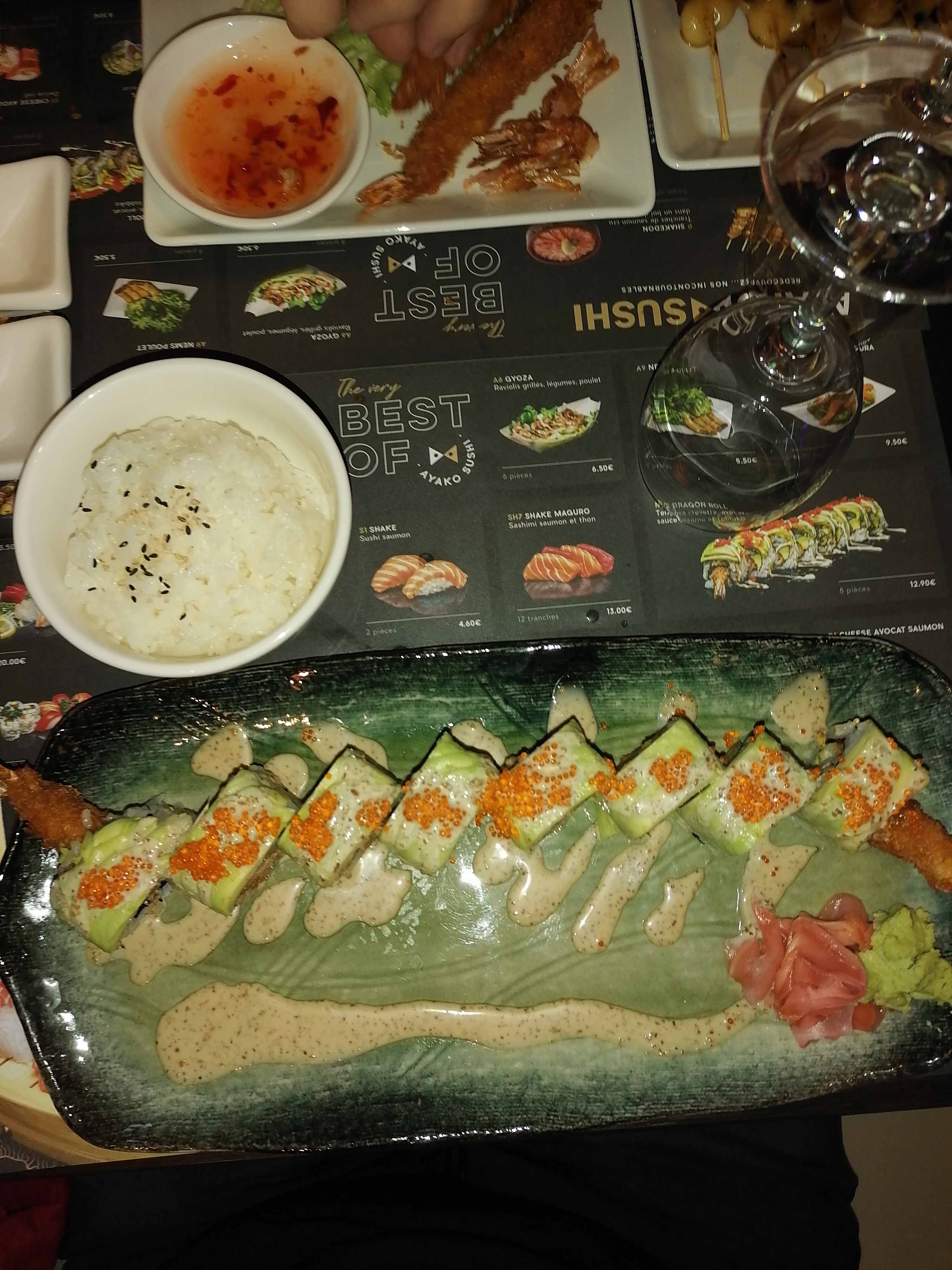 Posté le 24/06/2024 à 21:32"Le dragon roll est succulent!!! Les oeufs de lump sont éclatants. Le fried roll croustillant!!! Les sashimis thon / saumon sont au top niveau fraîcheur et quantité... Si les morceaux étaient coupés plus fins ça ne deviendrait pas vite écœurant...ou alors, laisser couteau et fourchette. La salade saumon avocat généreuse à un prix mini!!!"