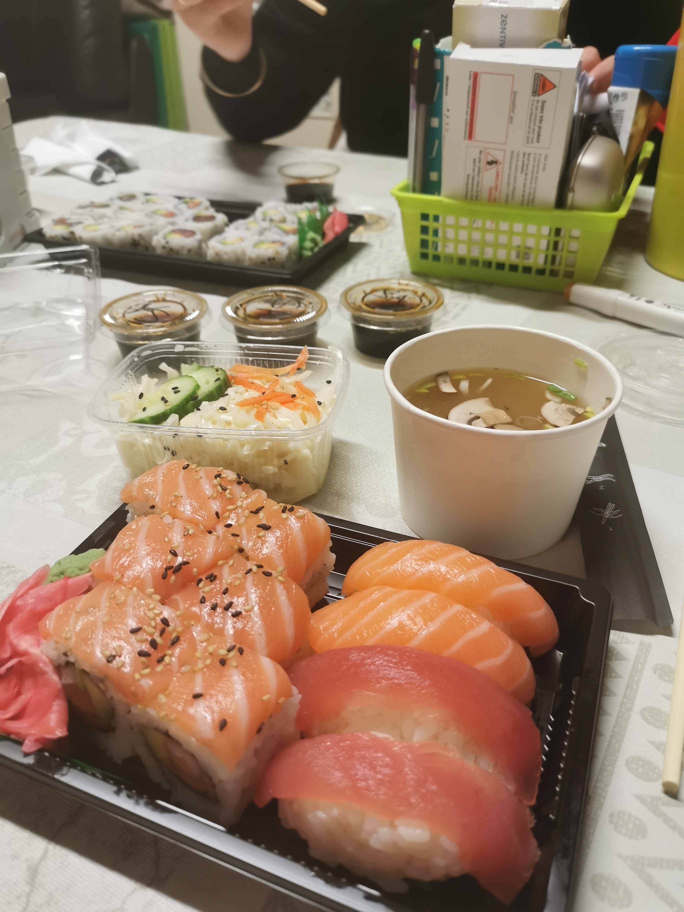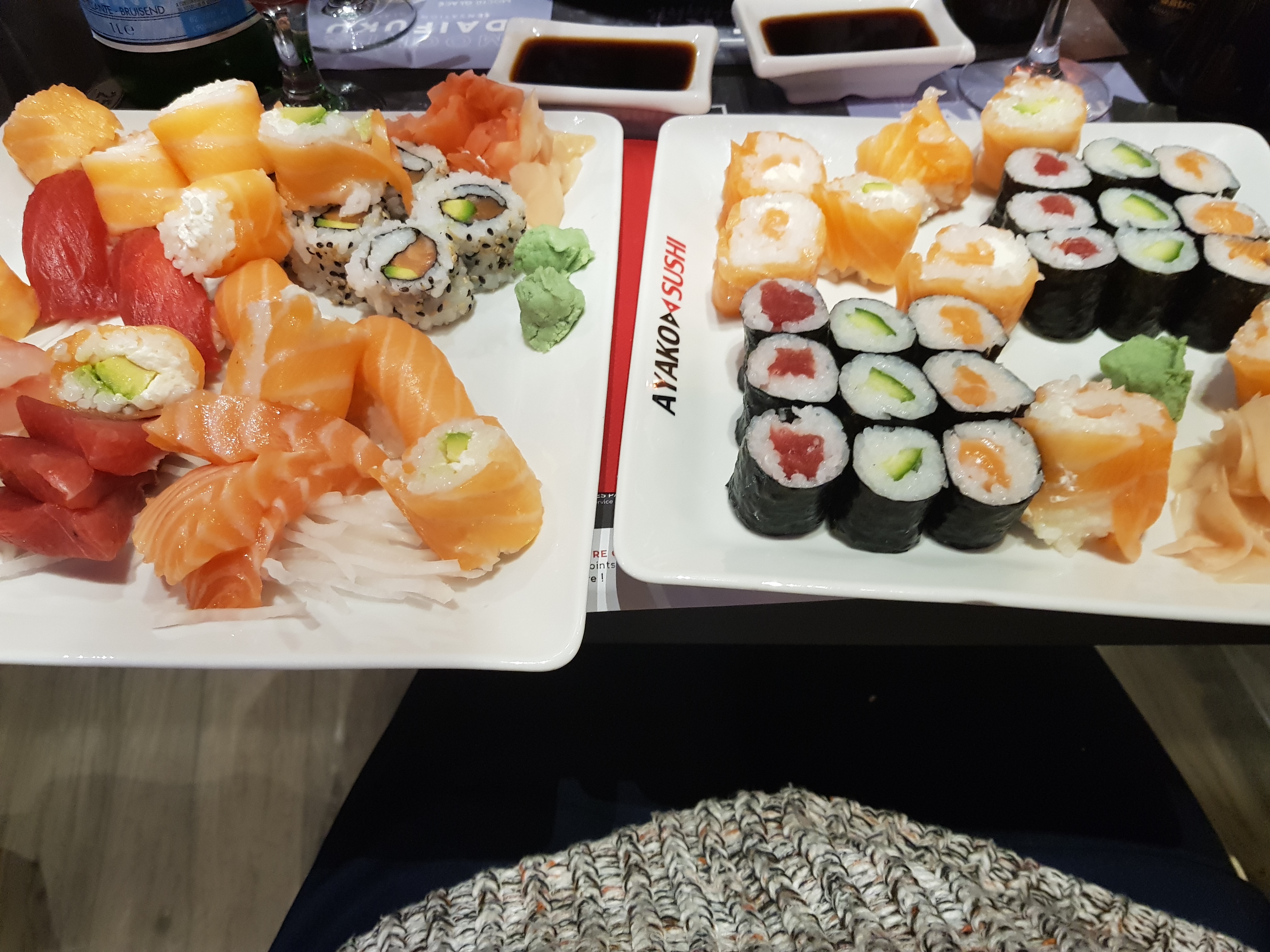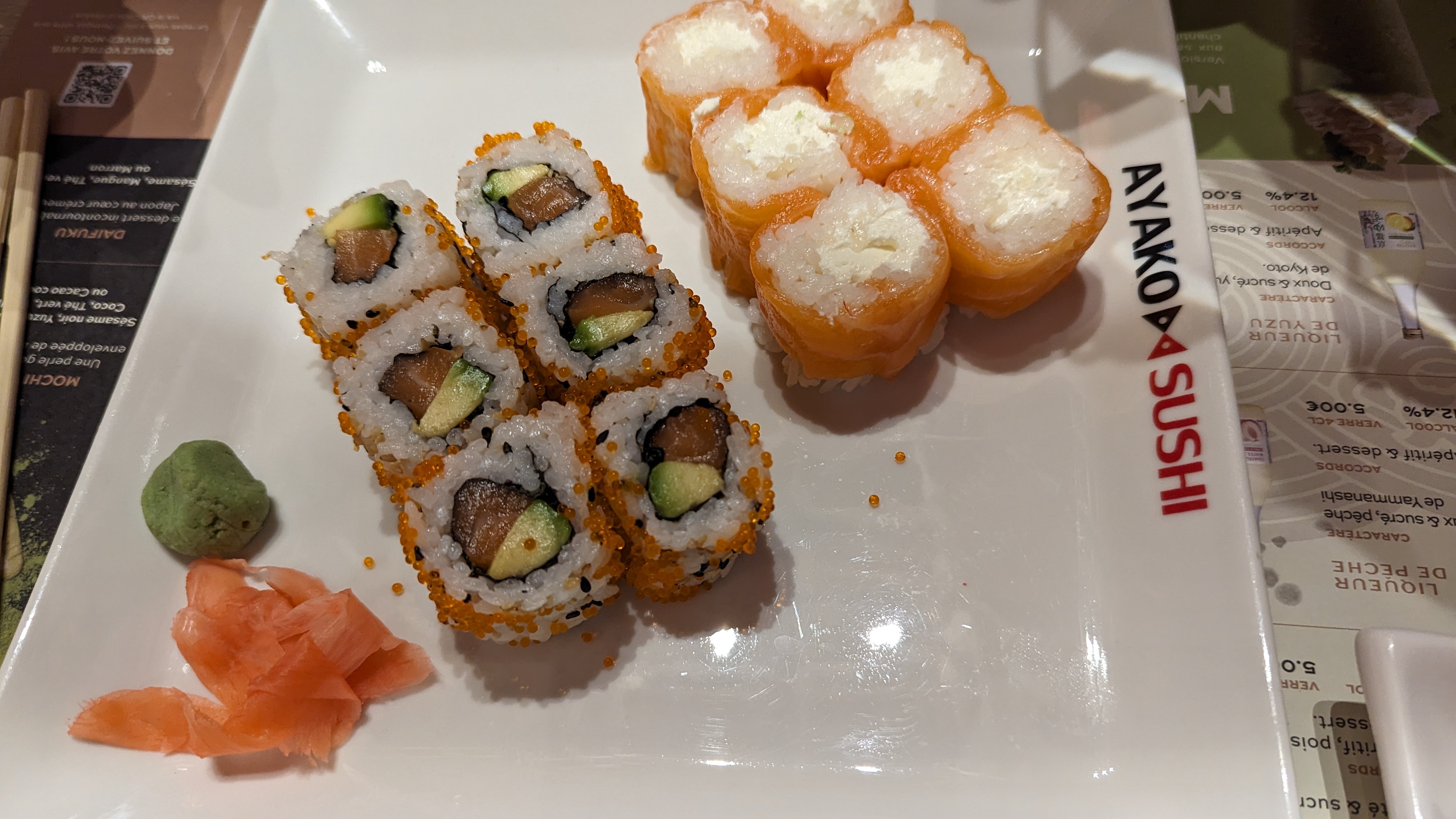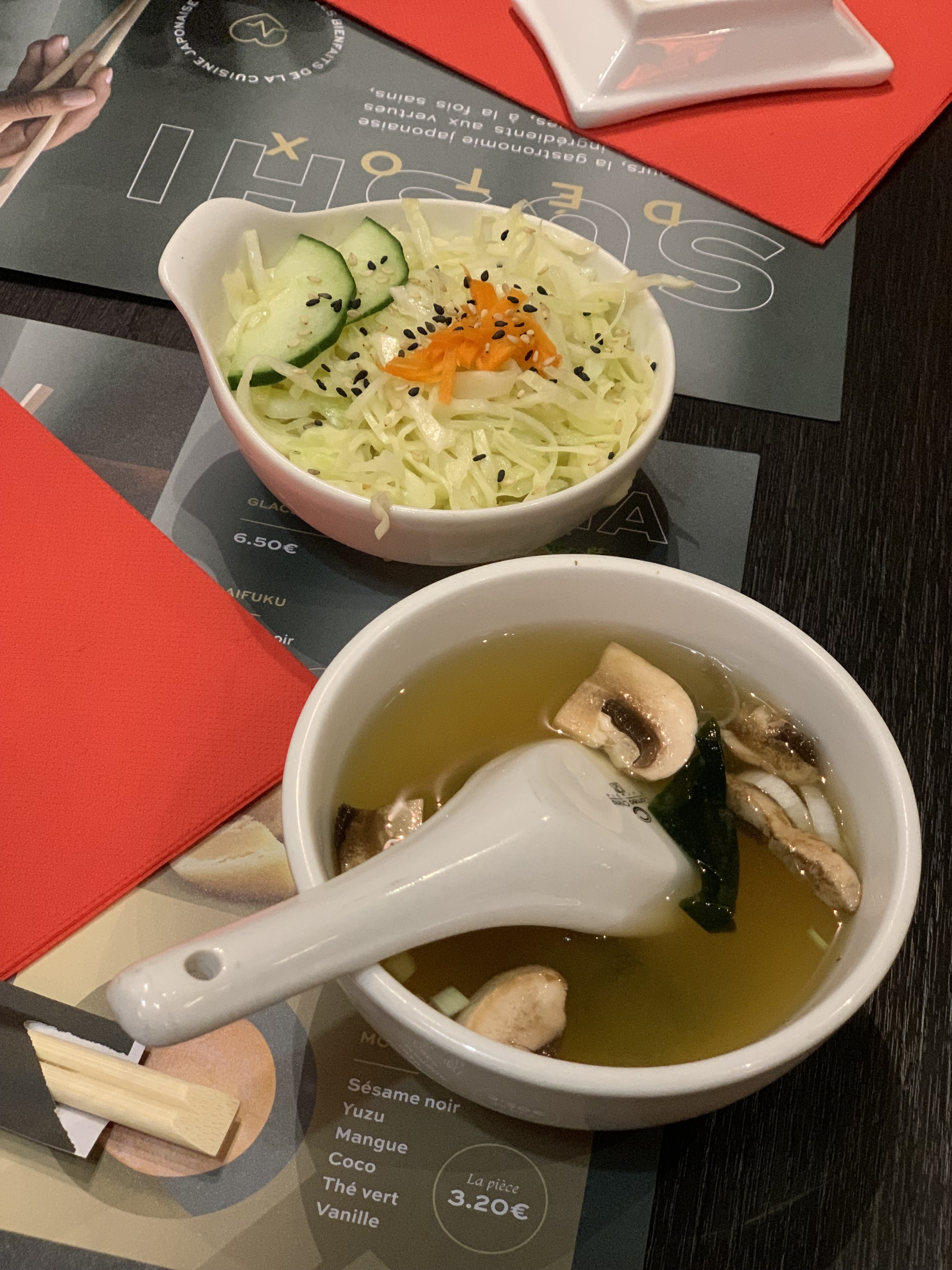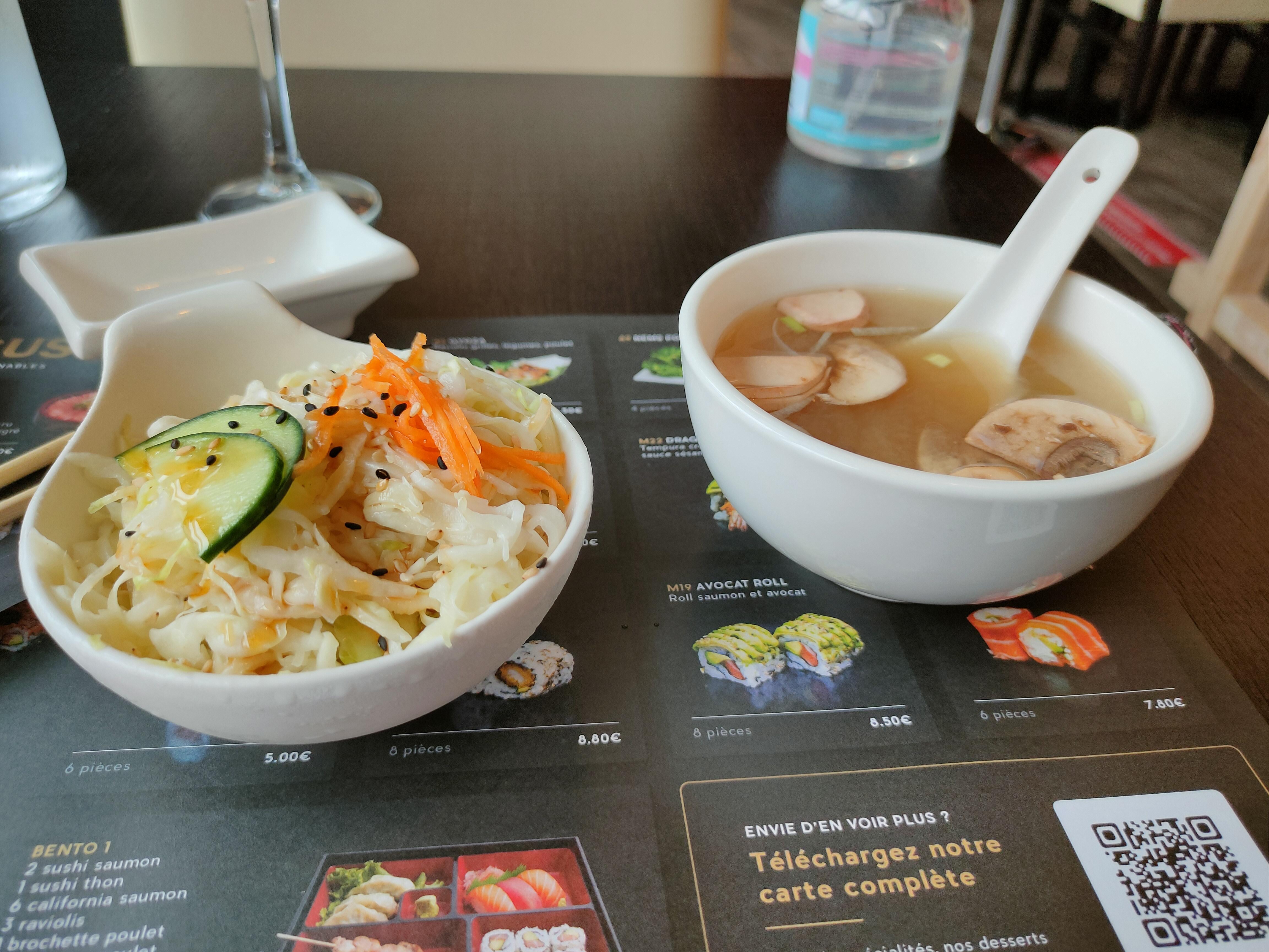 Nous avons pris 2 menus sushi + maki (soupe miso & choux) tout ce qu'il y a de plus classique chez le japonais. Nous avons eu mal au ventre tous les deux. Je doutais un peu de l'expérience, je suis fixé. Plus jamais...