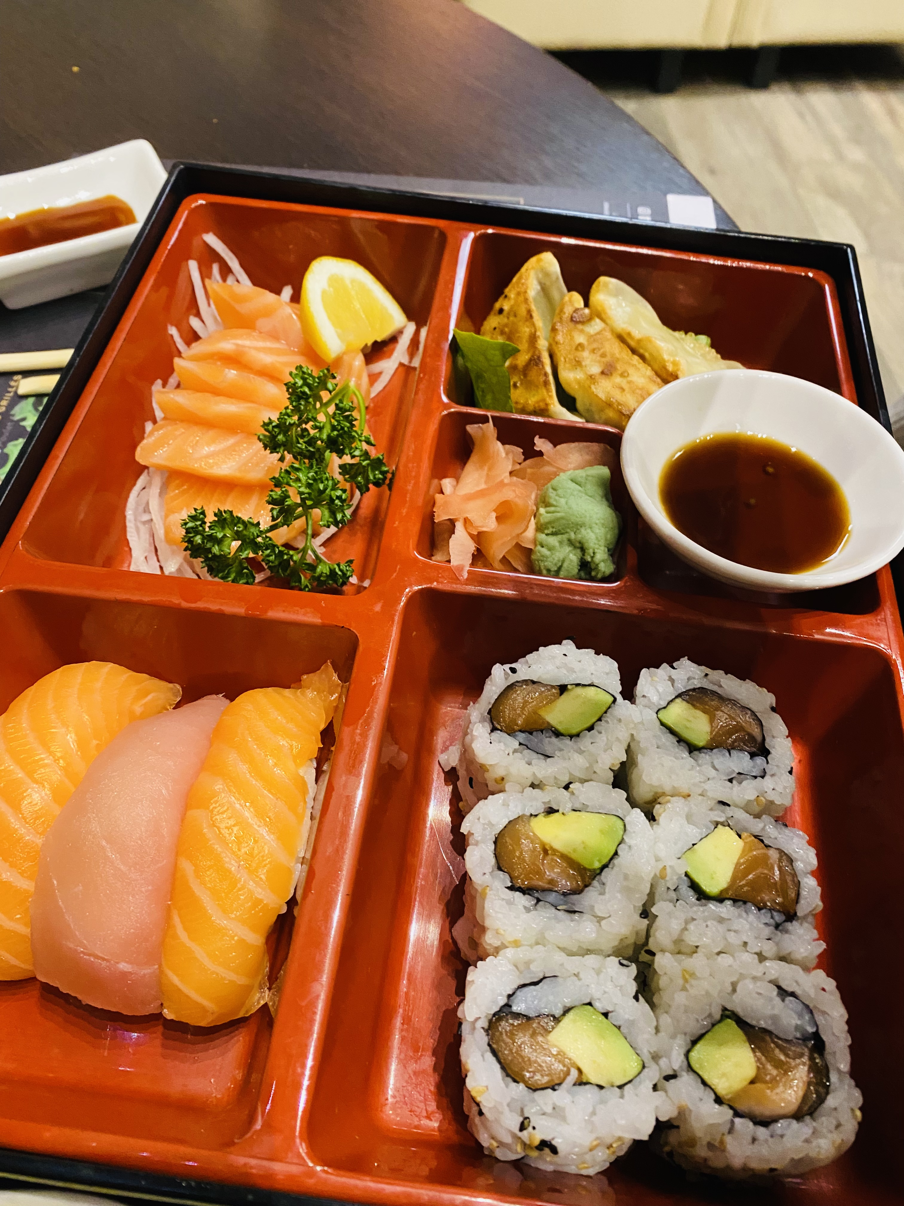 Salade de saumon avocat avec des bas morceaux de saumon... déception. Sashimi de thon et saumon bien frais... dommage que le persil soit défraîchi. Le dragon roll était succulent! Heureusement.