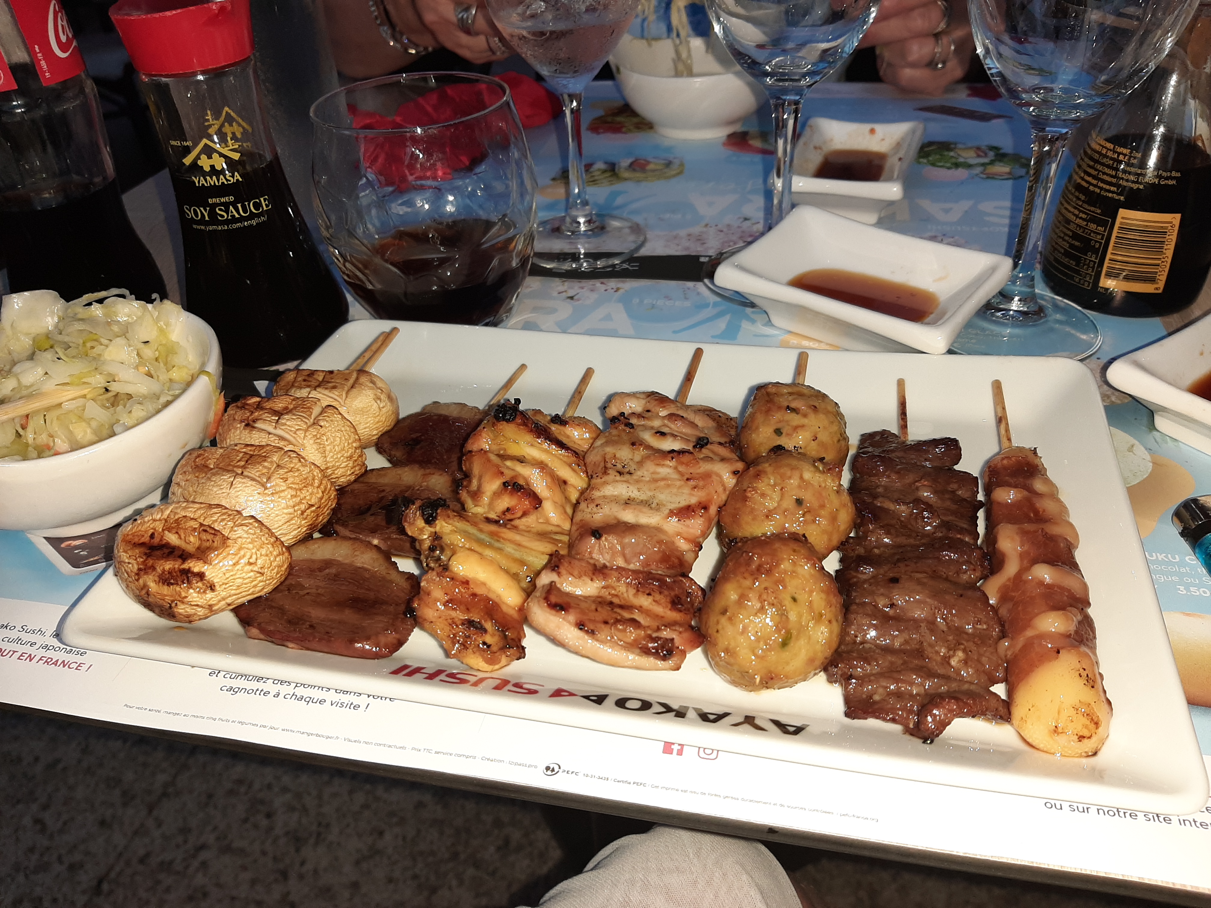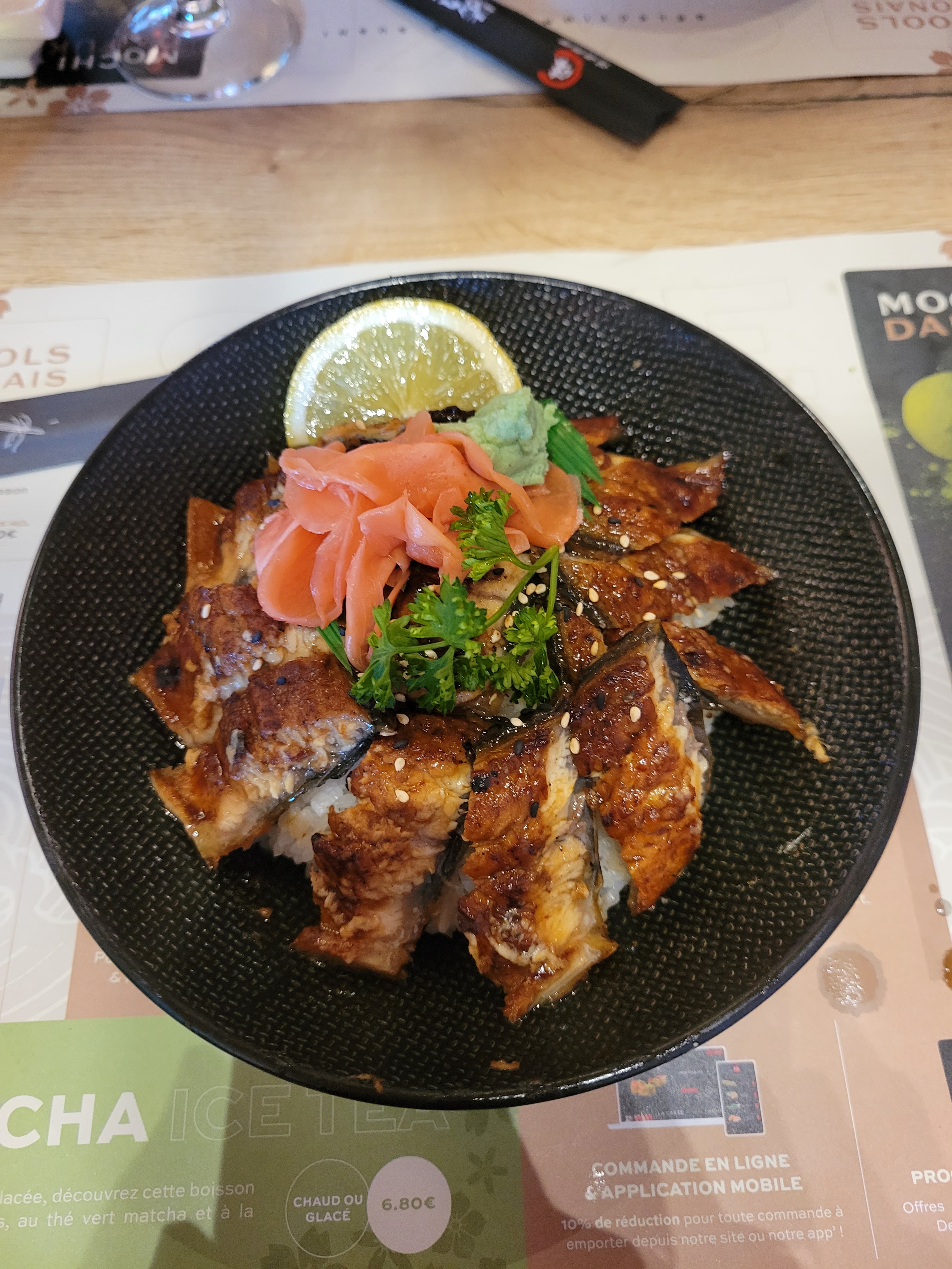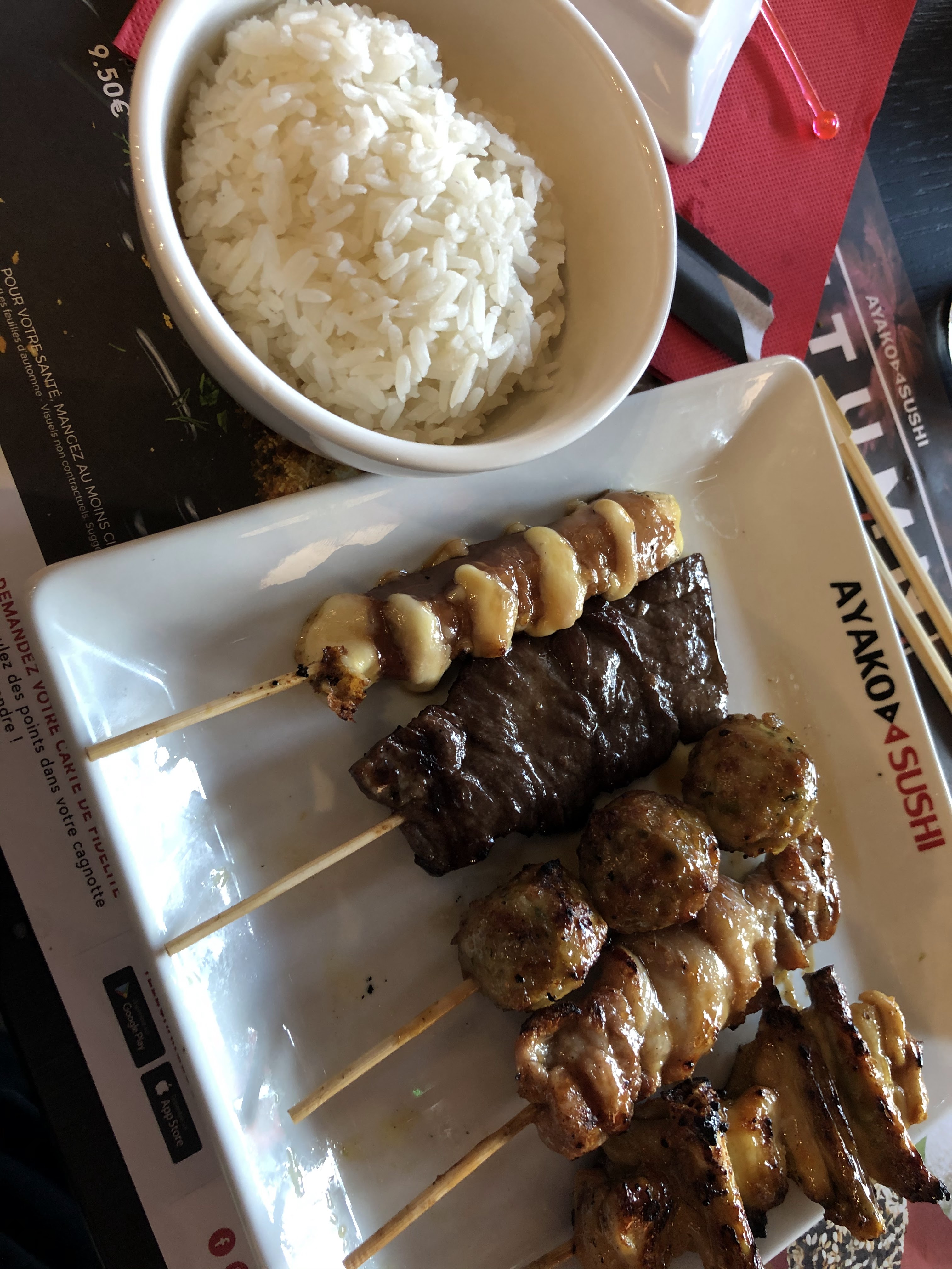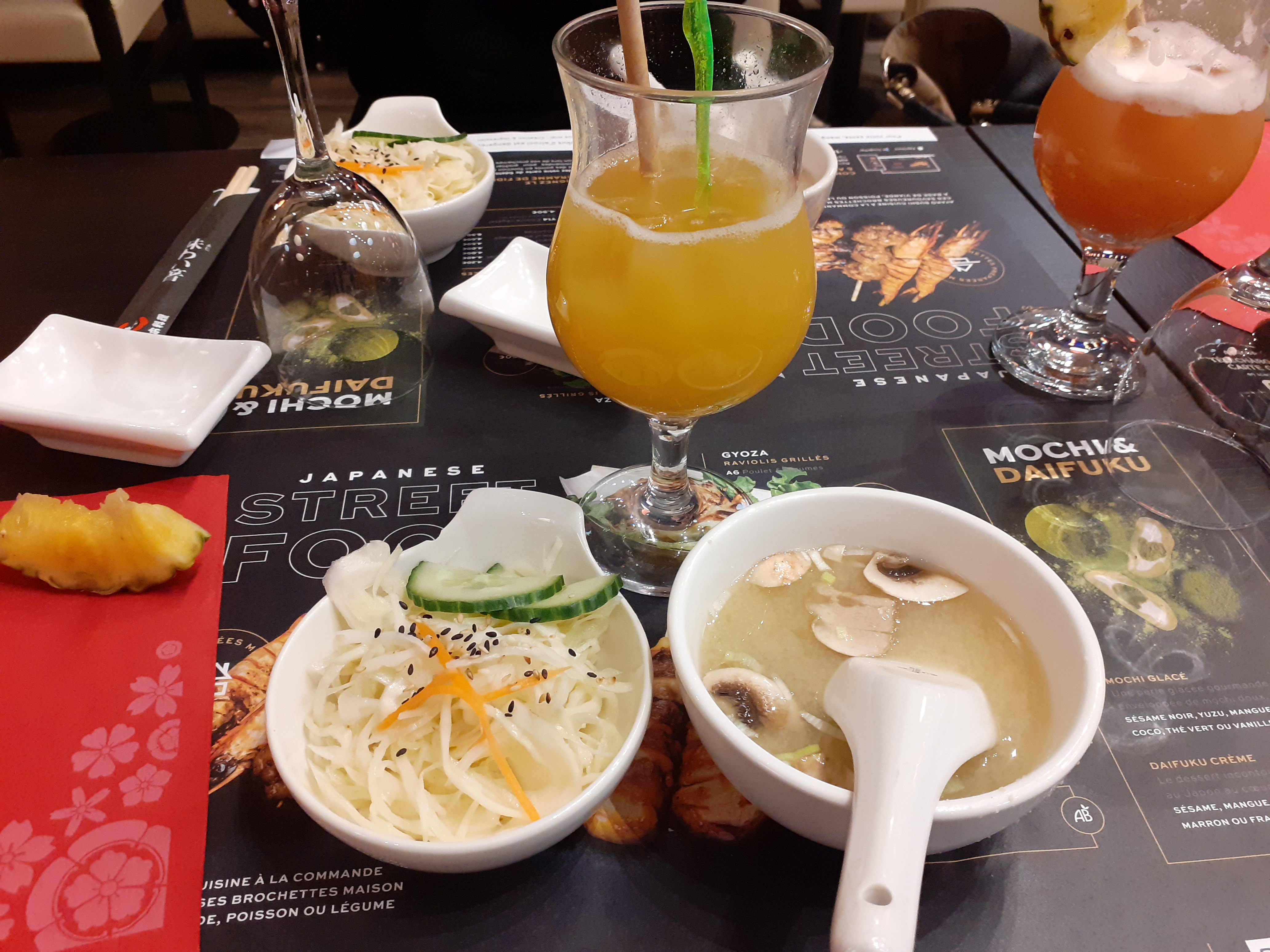 J’y ai mangé seul ce midi, un personnel très sympa, un lieu avec de l’espace et une jolie deco sans trop de chichi. La principal le repas, un menu midi, la petite soupe, la petite salade, un apéro wasabi, un plat qui arrive avec le riz et sauce soja sucrée ou salée. Bonne cuisson des brochettes et gouteuse. J’y reviendrais car le prix reste raisonnable pour ce que j’ai mangé.