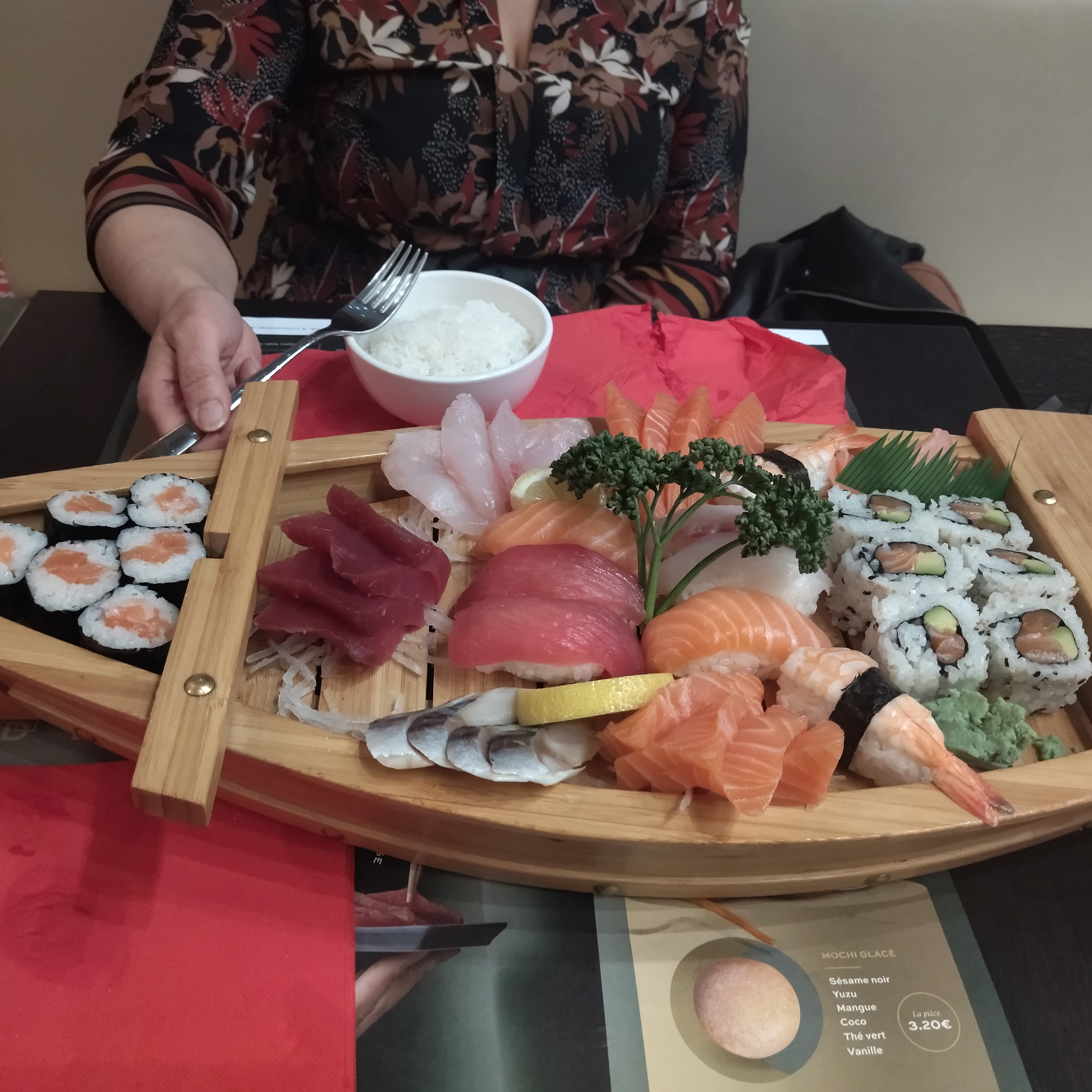 Menu duo très copieux et bon. 42 euros très correct. Mais le dessert mochi est franchement moche !!!! Une petite boule (la taille d'un petit chocolat type chardon... pour vous donner une idée) bien trop dure perdue au milieu d'une petite assiette et cette malheureuse boulette pour 2euros90!!!! A la limite de l'arnaque... Sinon, le lieu est vaste....trop... Sentiment d'être dans un hangar aménagé... Un peu genre cafeteria. La musique est discrète asiatique et fort agréable. Dans l'ensemble très inégal...