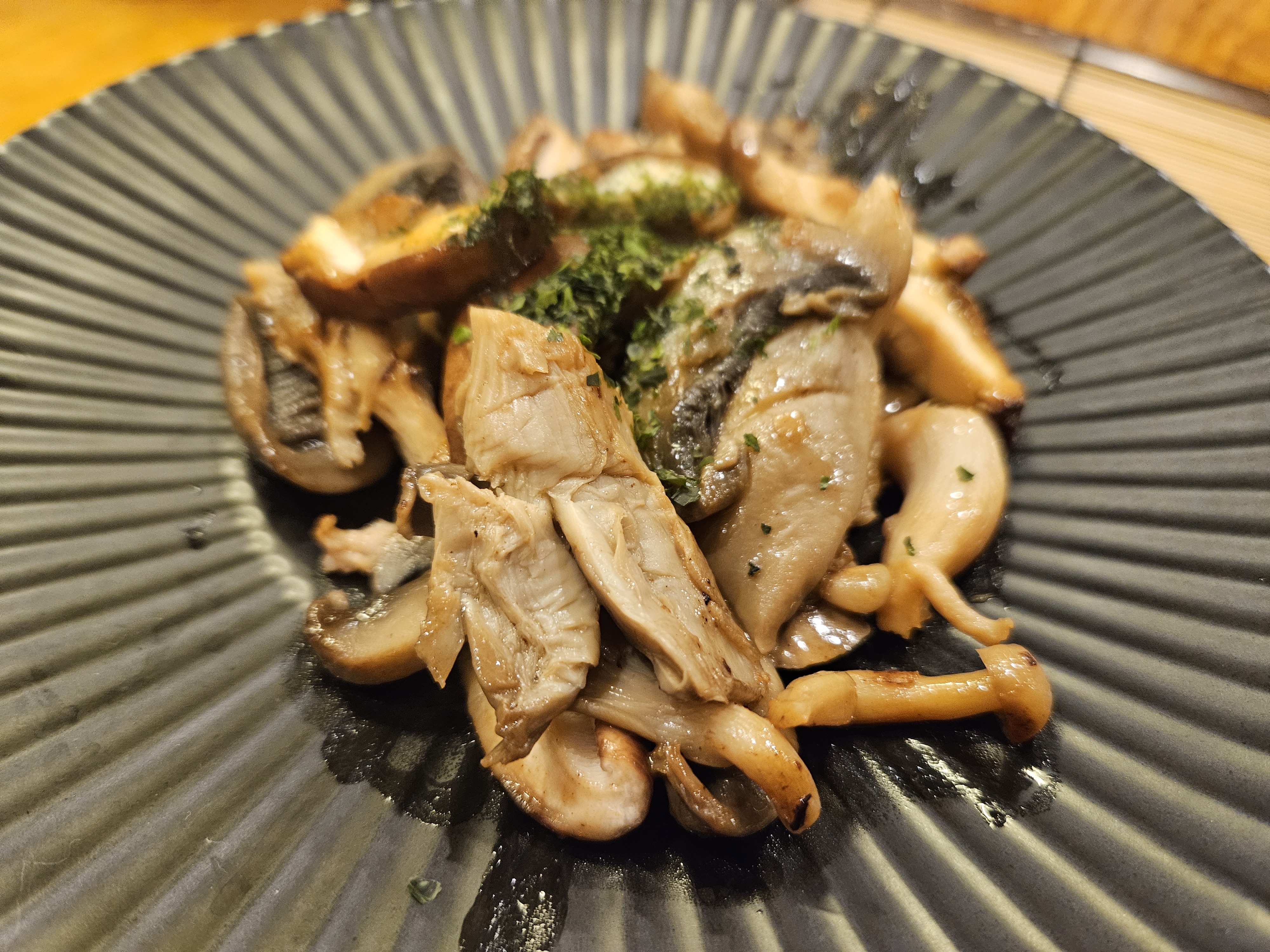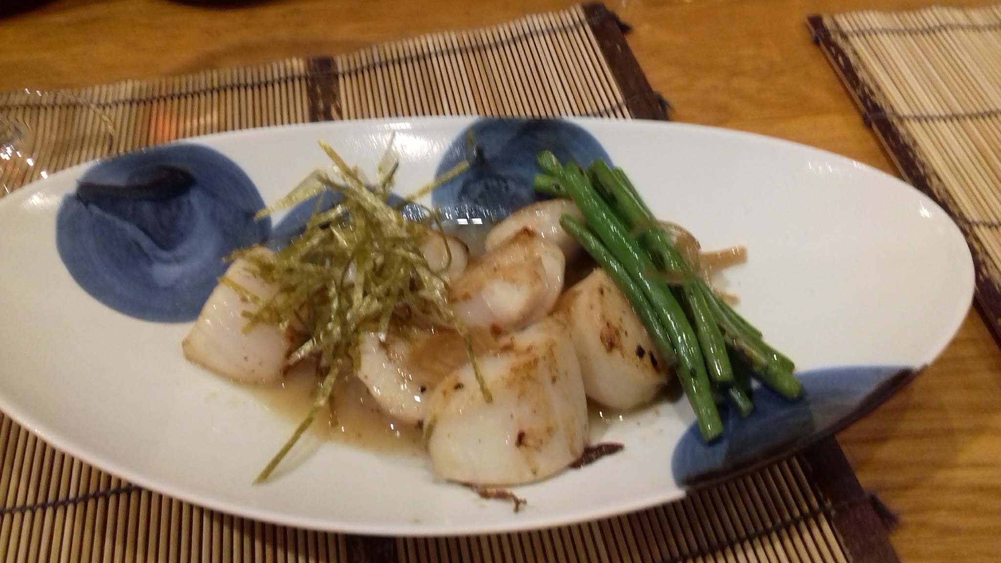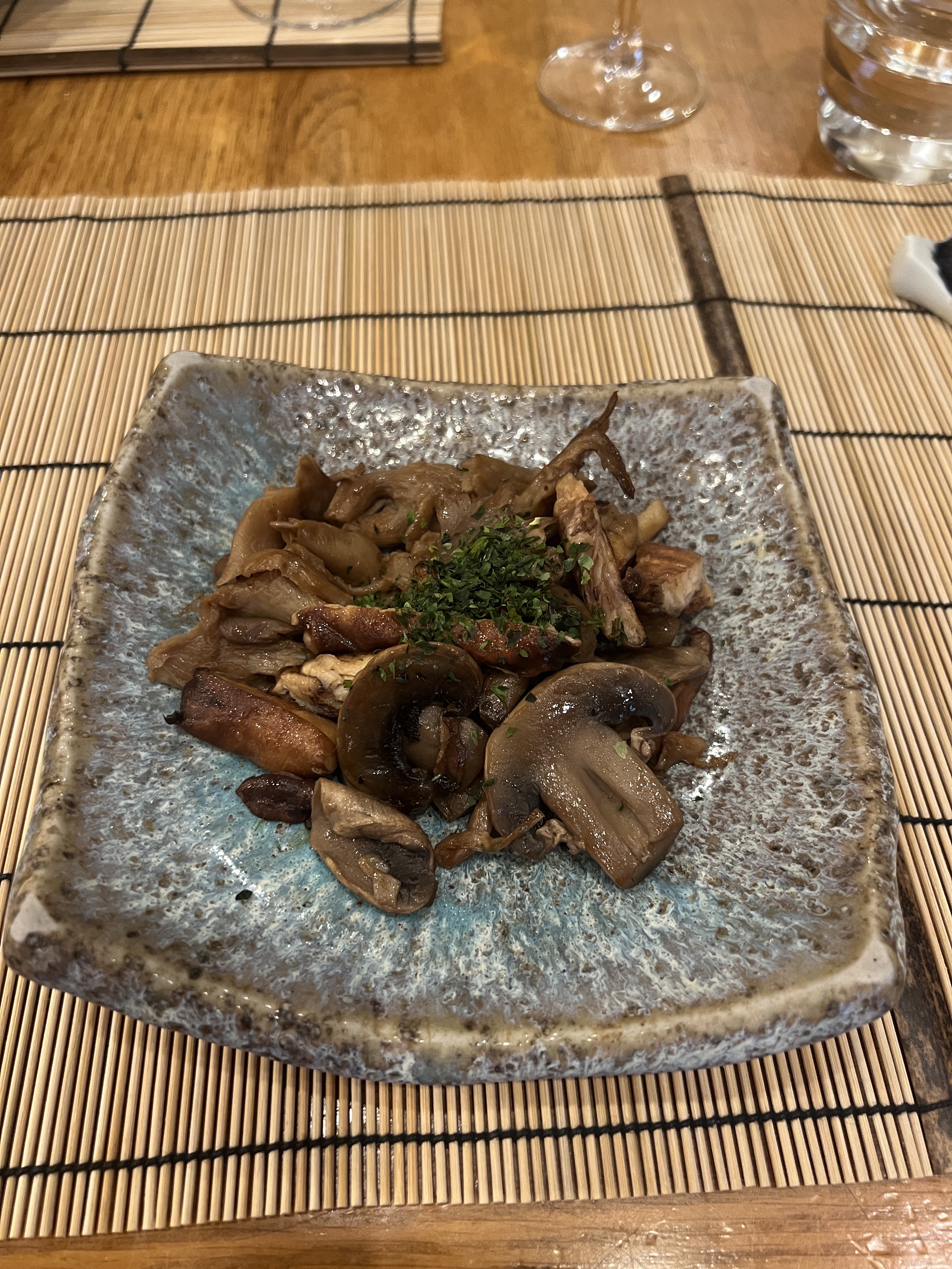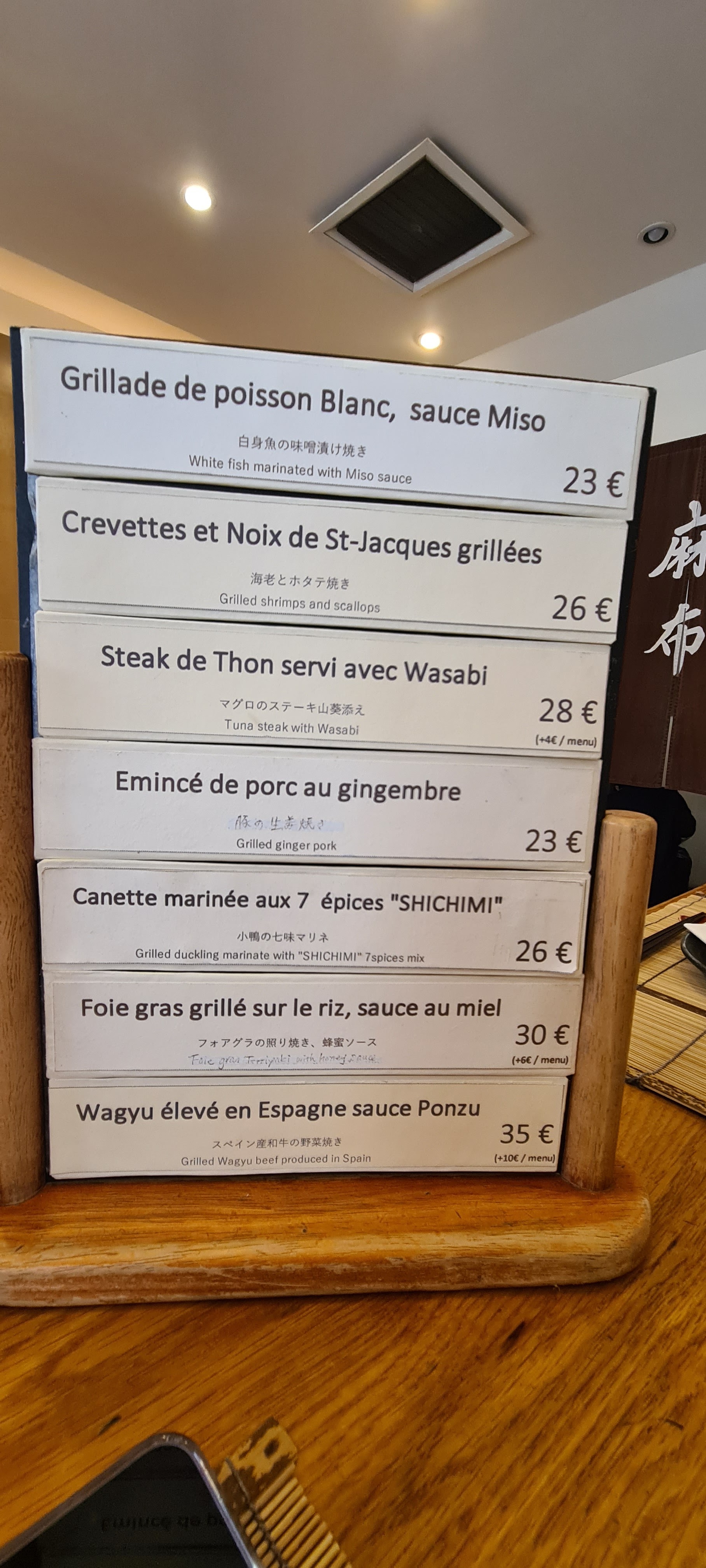 Globalement un peu déçue sans effet waouuu. On sait que les japonais sont chers, mais là, il y a un rapport qualité prix qui n’est pas au rendez vous. À l’époque, il n’y avait pas beaucoup de restaurants comme celui-ci. Mais les temps ont changé. Nous connaissons très bien le Japon, et ici, il n’y a que peu de générosité. Donc oui, c’est plutôt bien fait, c’est bon, mais ça manque de panache et de goût. Un amuse bouche ridicule. Des bulots à 15.5 euros juste décortiqués avec 3 lamelles de champignons de paris… 3 shitakes avec des champignons des bois (en fait de Paris) à 15.5, ok, mais ça ne casse pas 3 pattes à un canard. Le bœuf, tendre, mais ce ne sont que des petits bouts de viande à la plancha avec 3 haricots verts (oui croquants) et quelques pousses de soja. Le saké chaud à 27 euros… c’est trop. Un service agréable qui fait passer la pilule, mais nous n’y retournerons pas.