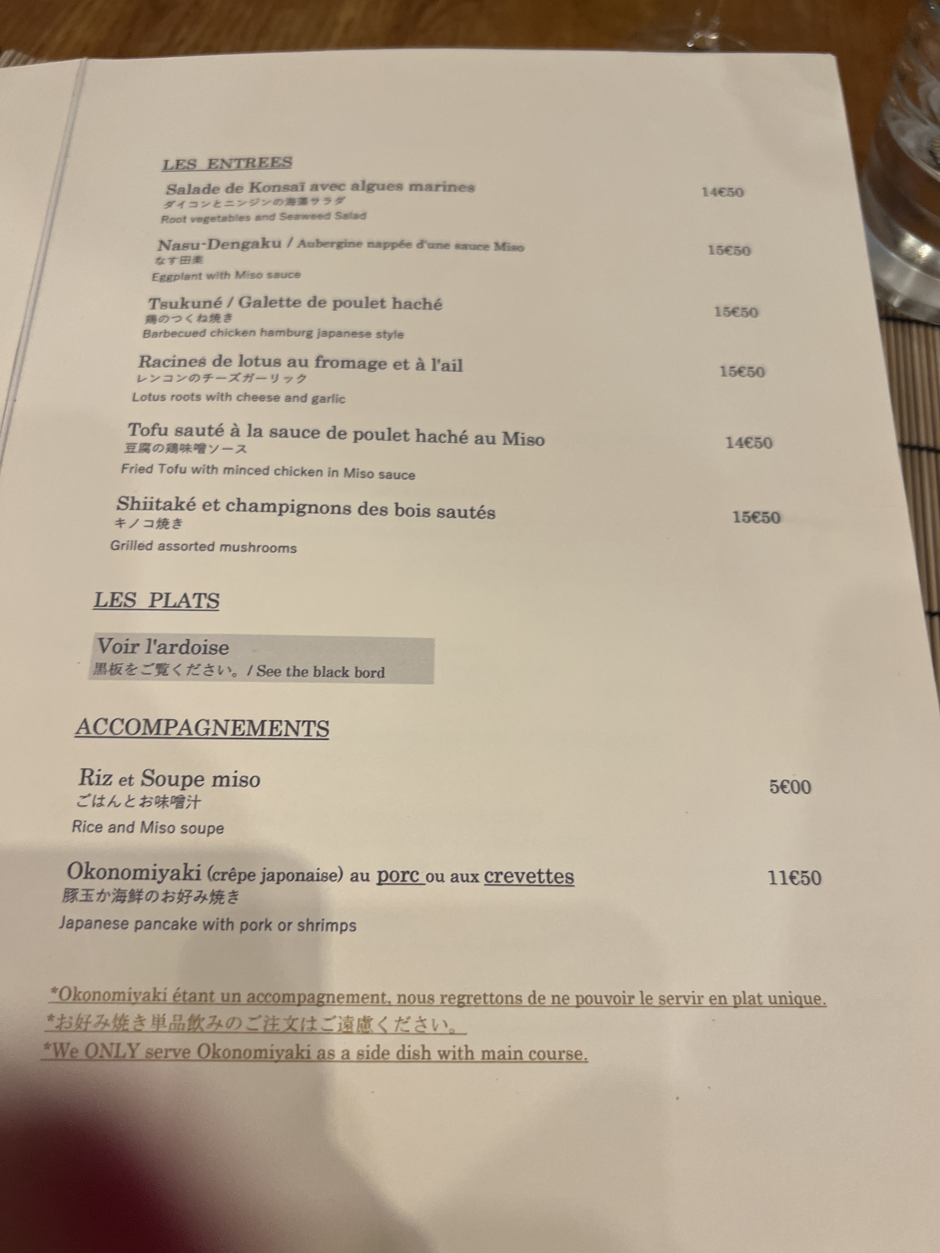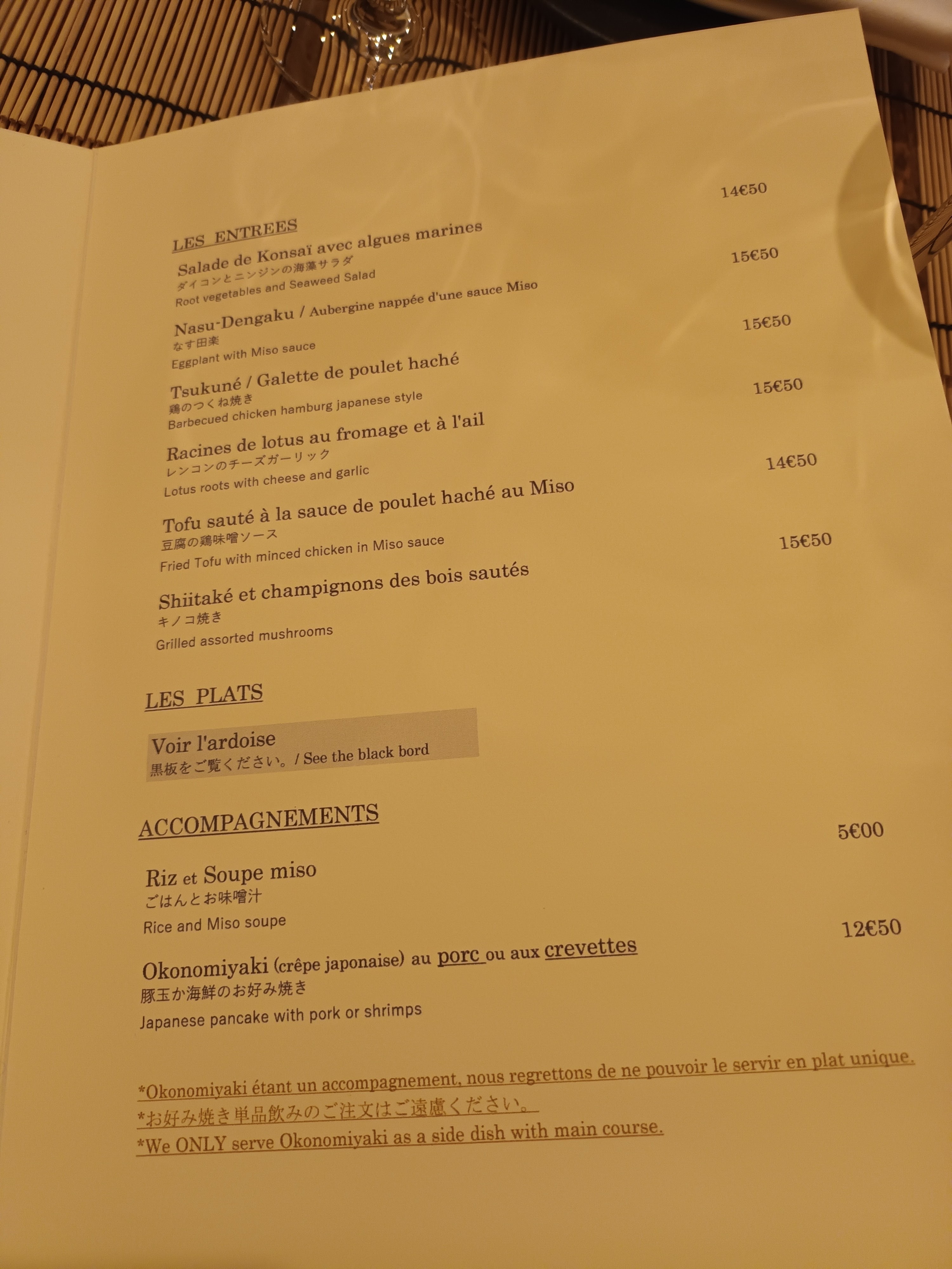 Ici on voyage au Japon, le vrai ! Pas de sushis et tant mieux. De découvertes en découvertes pendant la soirée, préférez être assis au bar pour le « spectacle ». L’équipe est d’une gentillesse.