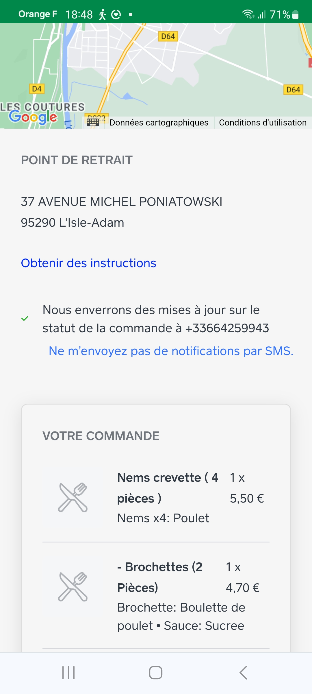 La commande n'est jamais arrivée. Nous n'avons pas été prévenue. UberEat à indiqué au bout de deux heures que cette commande avait été annulée. Je déconseille