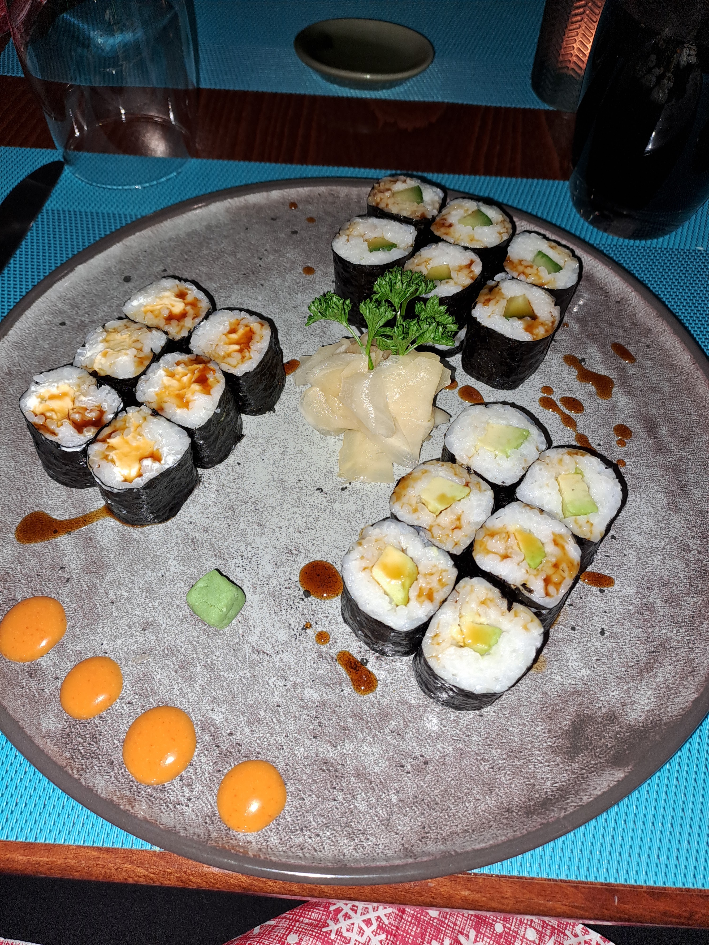 Restaurant avec petite décoration typique. Avant de vous déplacer, il est possible de consulter la carte sur internet. Puis, à table, vous pouvez passer la commande toujours via internet, tout est codifié par mesure de simplification et c'est également plus rapide. Le service est très sympa et les plats sont délicieux, tous servis avec wasabi, gingembre et assaisonnements. Originellement, le gingembre est mangé par les Japonais entre deux plats ou en fin de repas pour nettoyer son palais. C'est une façon de faire un rinçage de palais entre deux saveurs pour profiter au mieux du goût à venir. Le gingembre se mange donc normalement seul entre deux sushis différents. Le choix est important : gyoza maison croustillant poulet, maki thon, California thon avocat, sushi saumon, sushi thon, maki thon avocat, etc. Chacun prenant un plat différent de l'autre afin de goûter plus de saveurs, le serveur prend l'initiative d'apporter deux assiettes supplémentaires afin de faciliter le partage. Très bonne idée ! Puis le serveur nous conseille un dessert, beignet aux haricots rouges et ses glaces, vraiment délicieux. Ce restaurant mérite une autre visite.