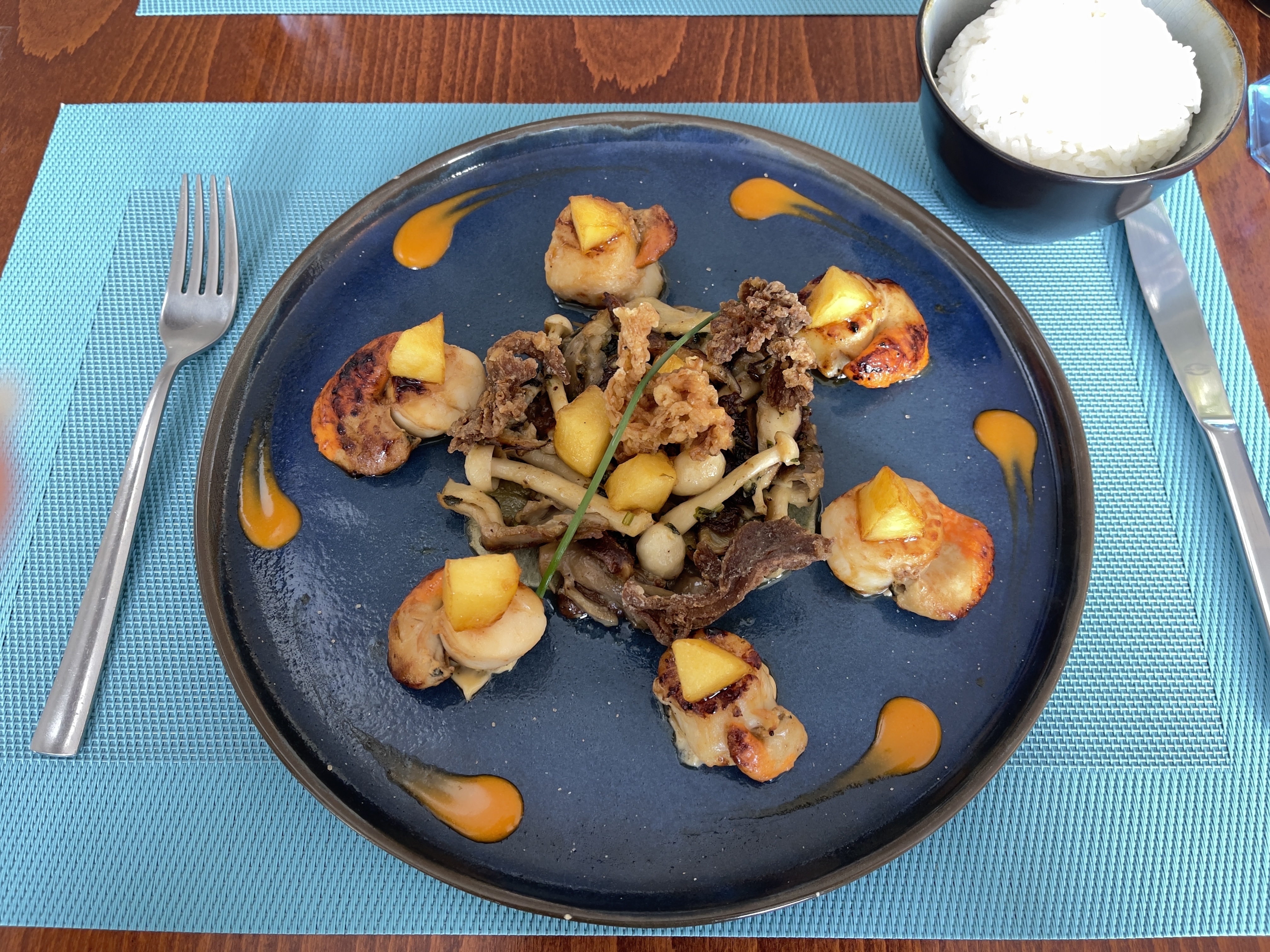 Un délicieux mixte entre cuisine japonaise et française ! 👌 Nous avons cependant une suggestion : l'éclairage est très blanc et fort, cela n'est pas très agréable et ne favorise pas le moment de détente le soir lors du dîner. Une lumière plus chaleureuse et tamisée serait idéale dans un si joli restaurant !