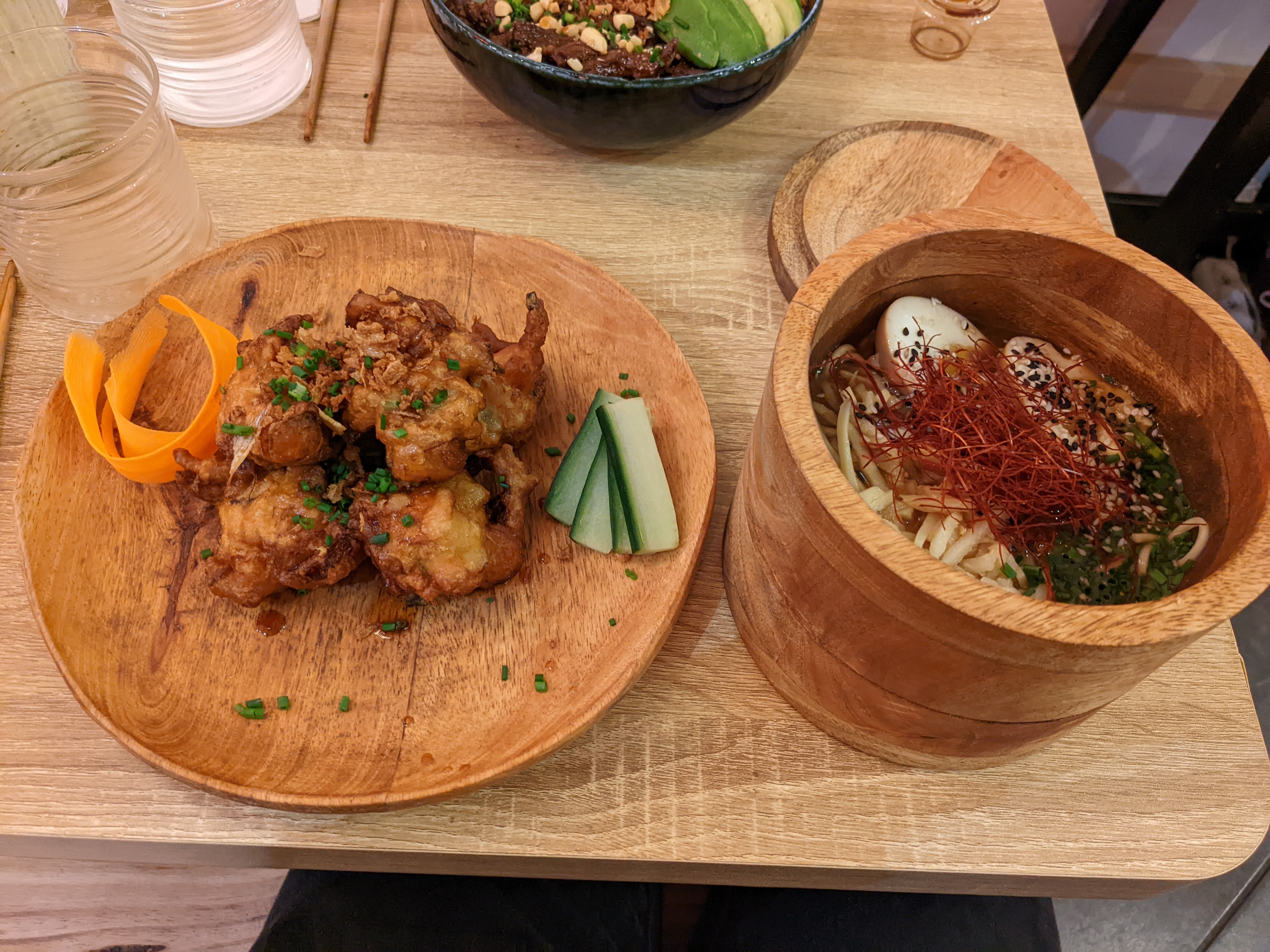 Colslow froid sur riz chaud avec 4 crevettes avec panure sur-epaisse. De la mayonnaise partout, karagé sec fait avec du blanc de poulet plutôt que la cuisse.... bref un fiasco. Grosse déception avec un repas gâché.