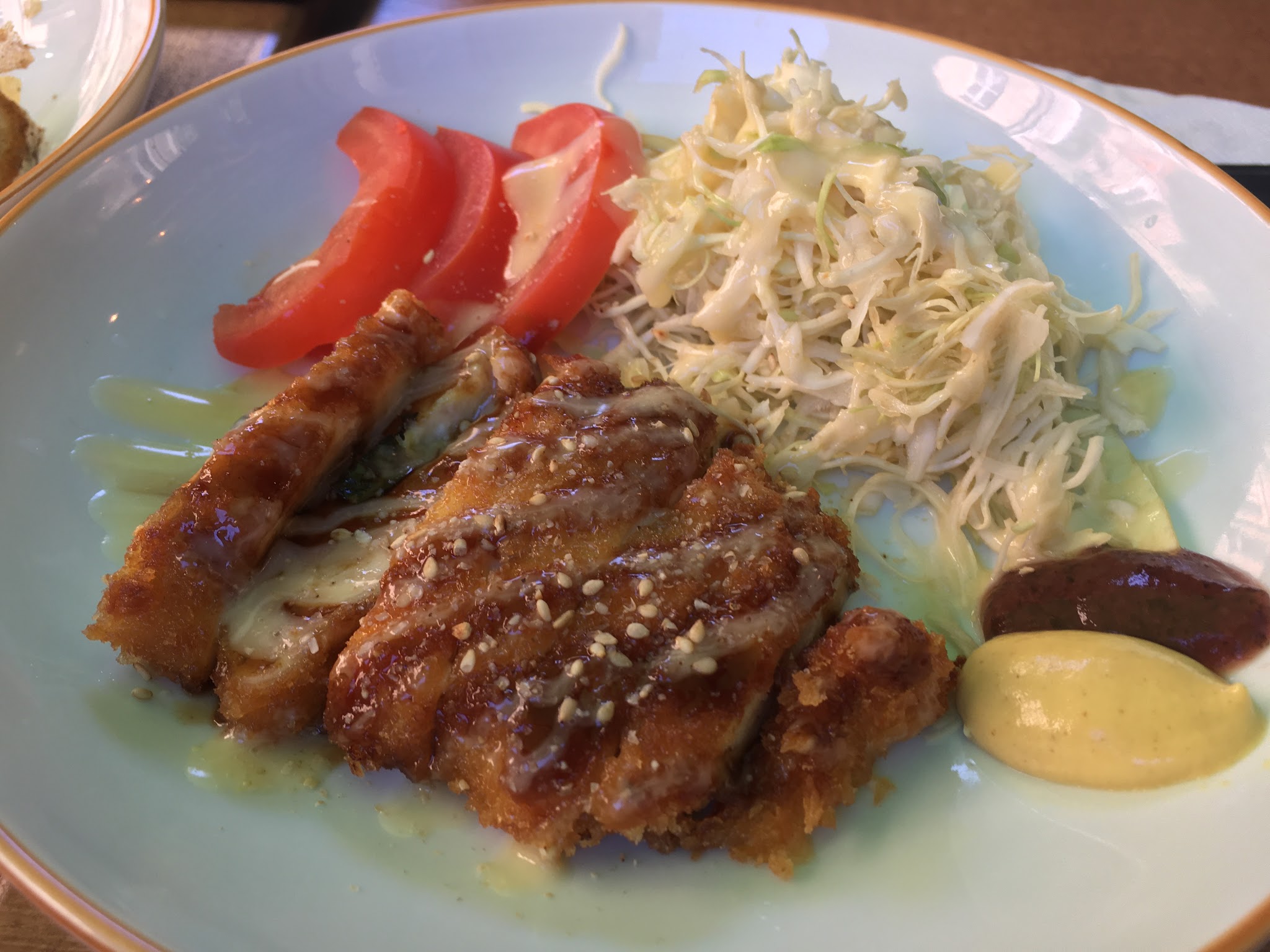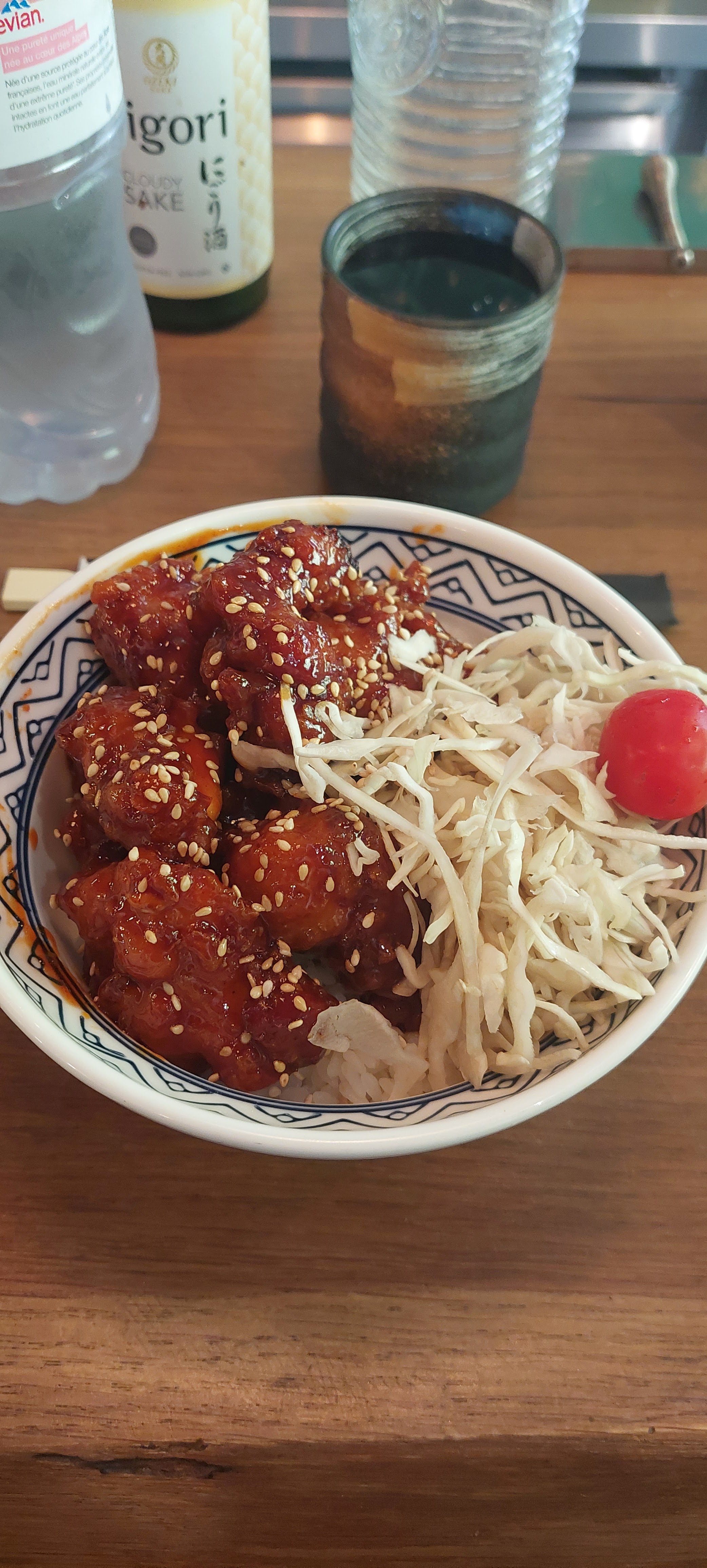 Un régal! Le fait d'ajouter du shiso au centre d'une escalope de poulet panné au fromage dans un donburi, bien que non conventionnel, me mettait l'eau à la bouche...Et à raison. Excellent idée de leur chef japonais!