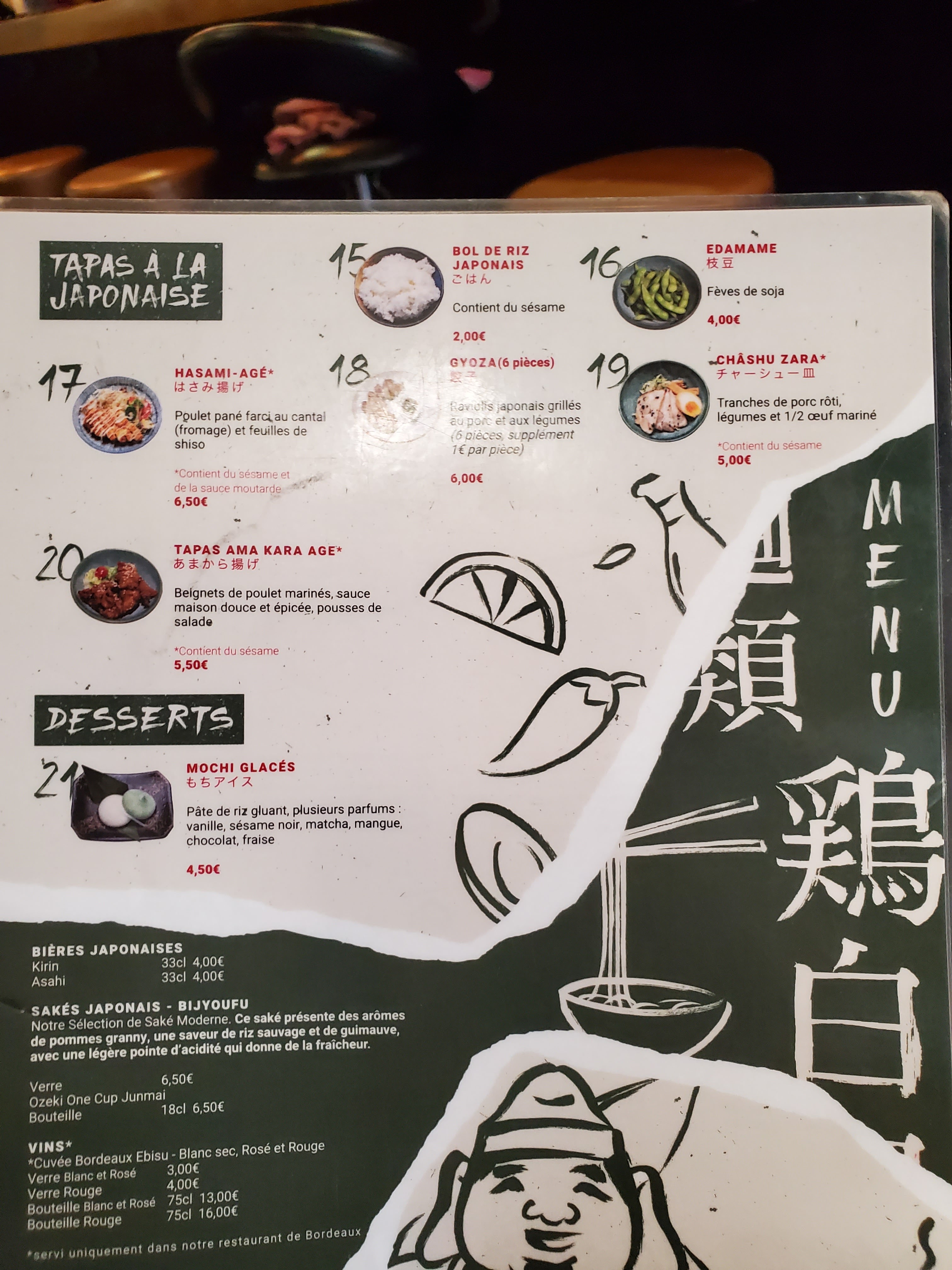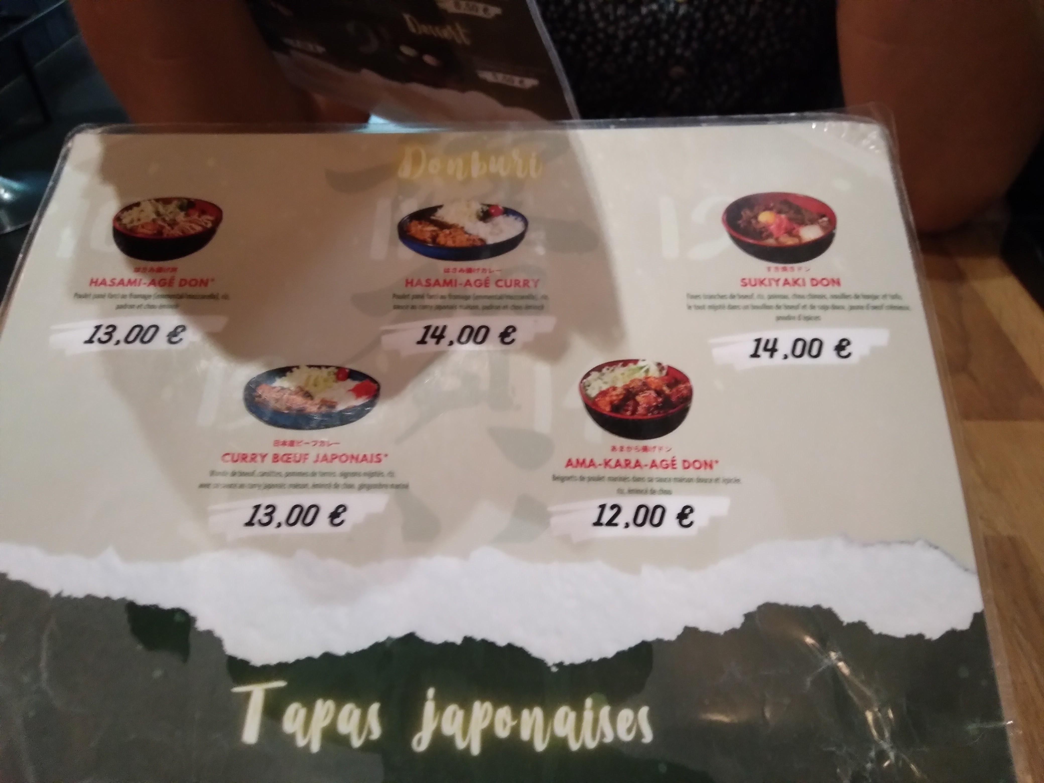 J’ai goûté le donburi au poulet farci de fromage et curry: la cuisine est très bonne et on en a pour son argent. J’ai payé 12€50 et on ne se moque pas du client bien sur le riz que le poulet. La sauce au curry reste en bouche même apres avoir quitté le resto. Foncez !