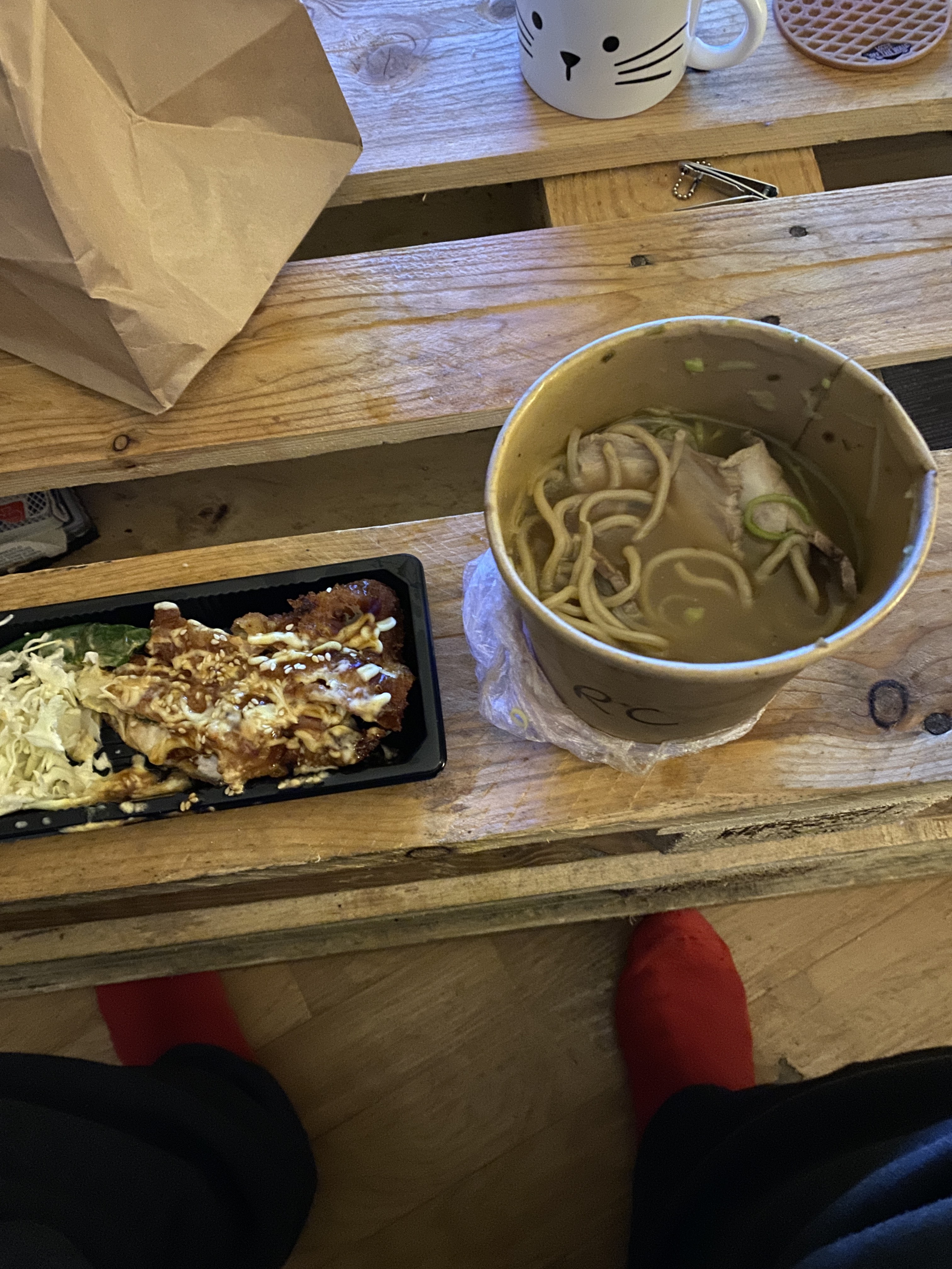 Commandé à emporter ! Il s’agit de notre premier plat de ramen. Le goût de sel très prononcé... nous n’avons pas aimé.