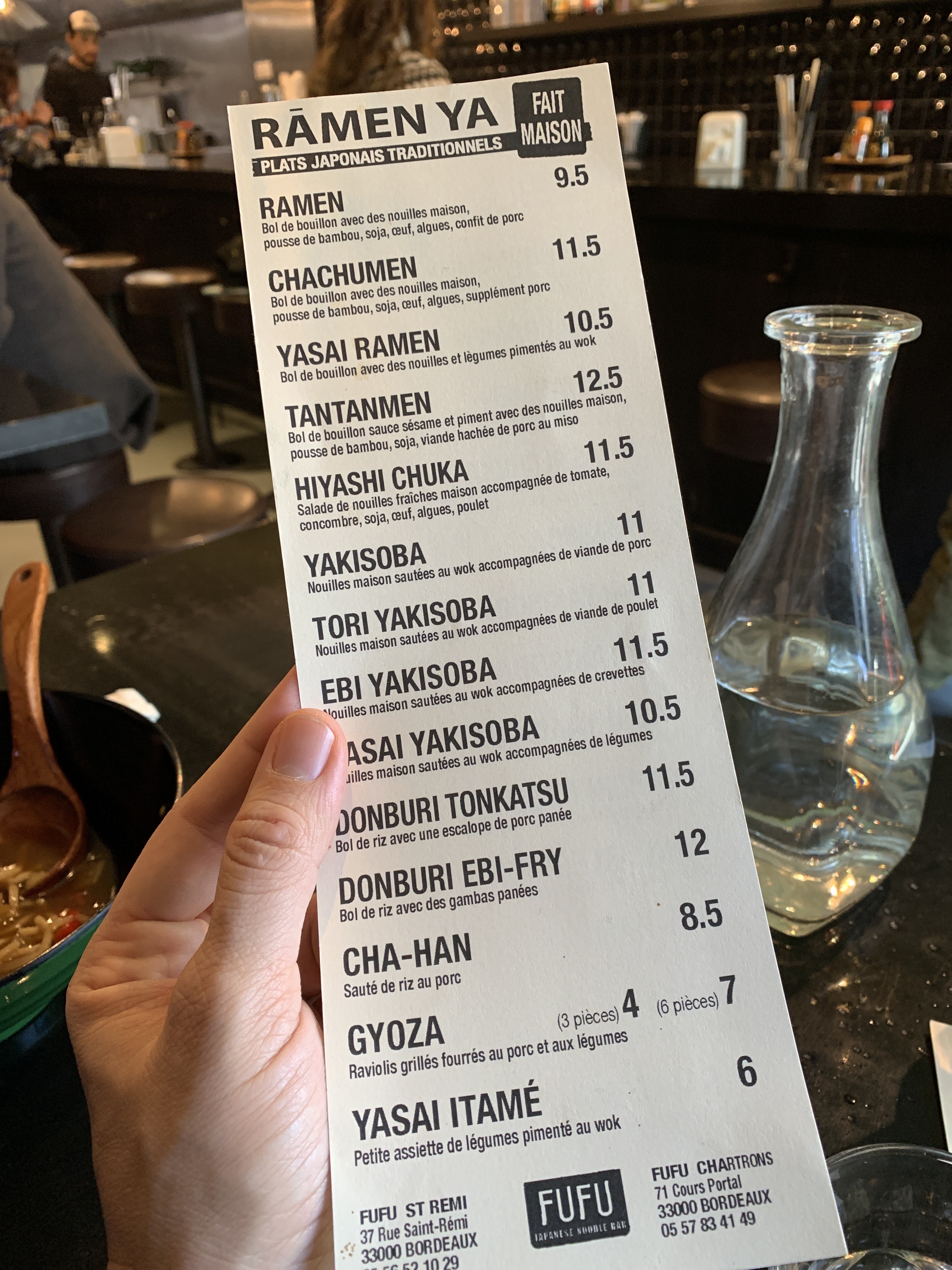 Le palais des ramens. Délicieux, très réputé sur Bordeaux, il y a toujours beaucoup d'attente mais ça vaut le détour. Plat unique environ 11/12€ mais largement suffisant. On y sort généralement repu 😁😋