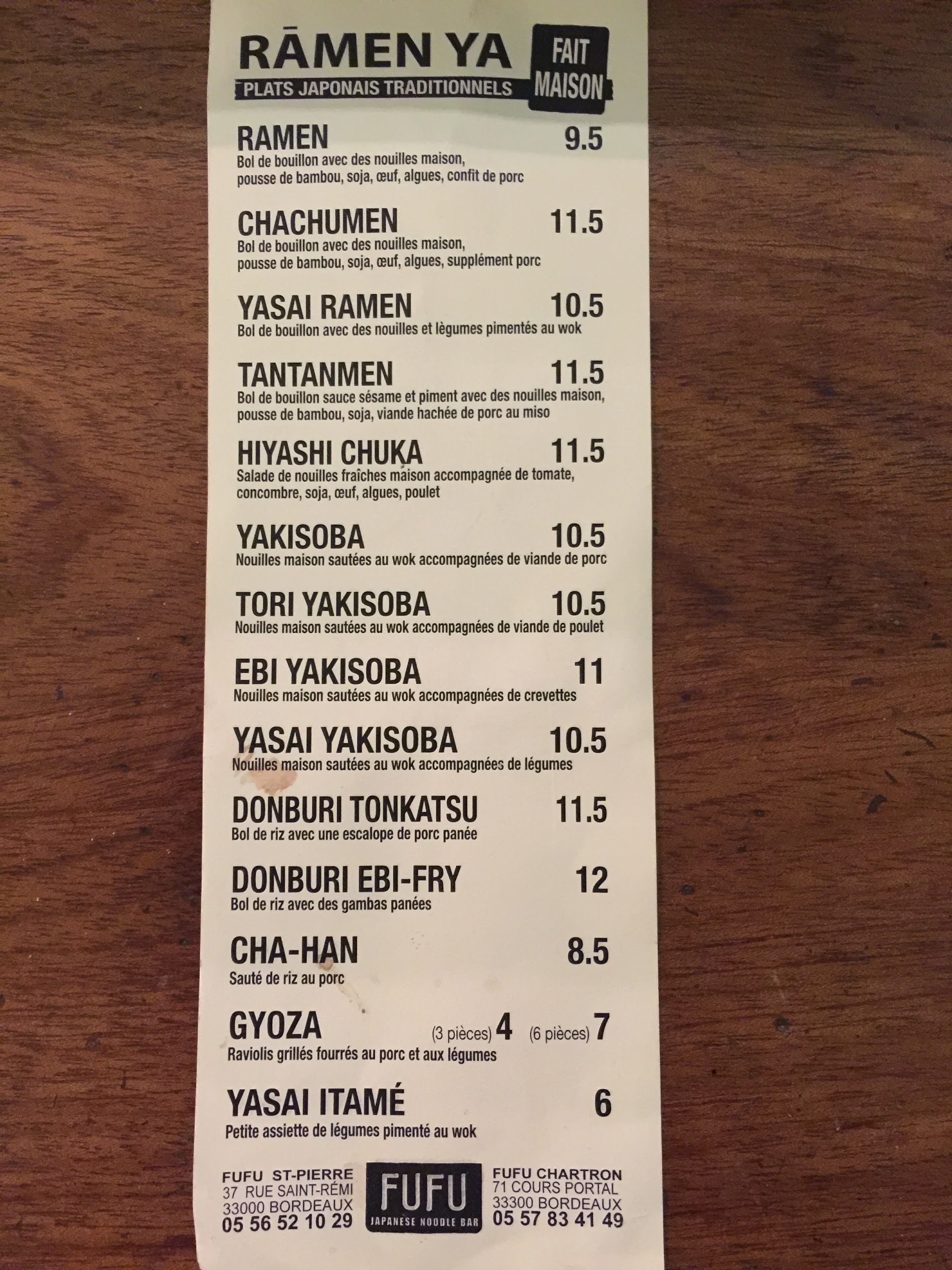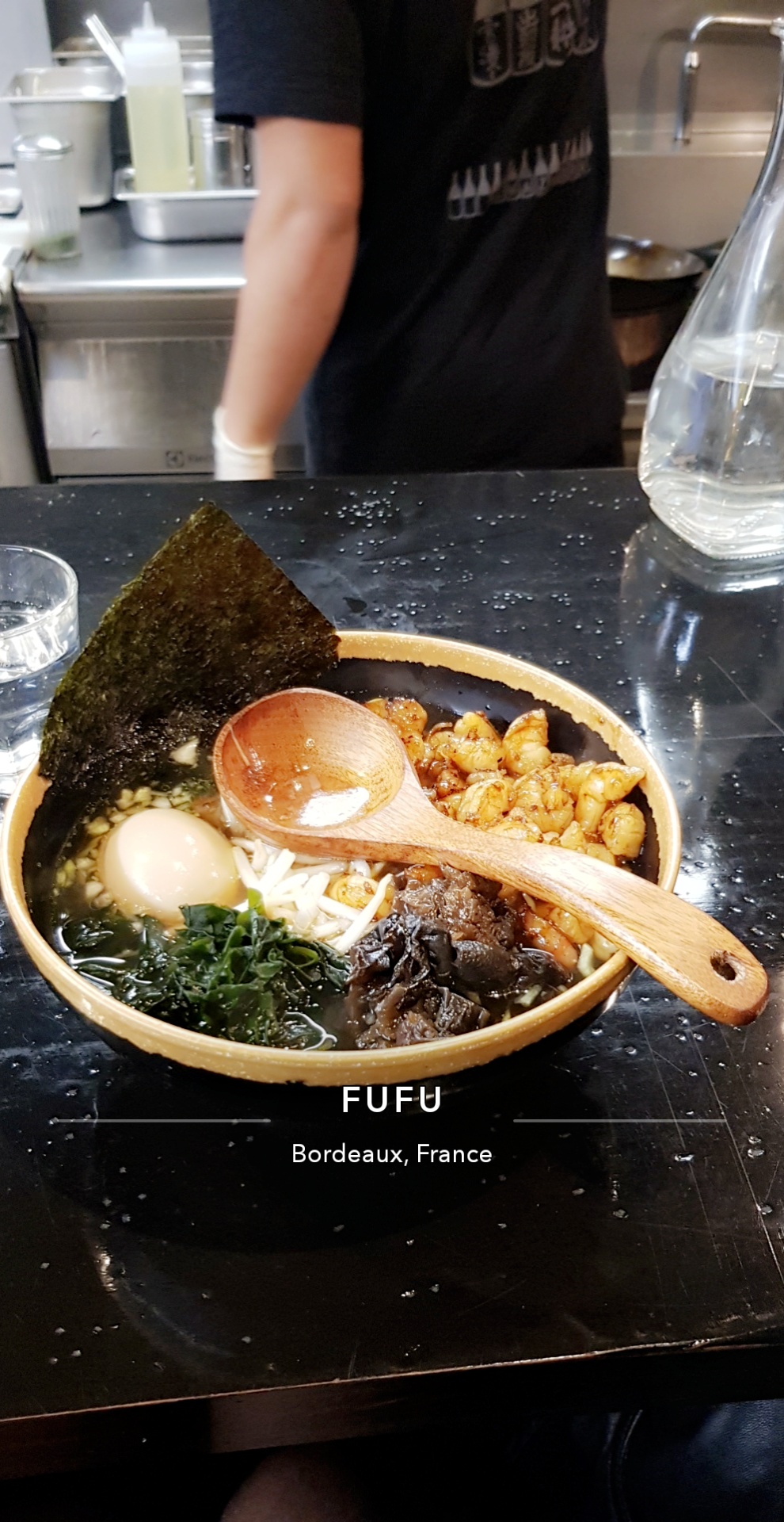 La vie est parfois ponctuée d'événements extraordinaires, l'ouverture d'un deuxième fufu dans le quartier des chartrons en fait partie ! ( je m'emballe un peu je sais mais c'est pour la bonne cause) La réputation du fufu premier du nom n'est je pense plus à faire à Bordeaux, tout le monde a déjà trépigné d'impatience dans la longue file d'attente pour obtenir une place si prisée au comptoir du fameux bar à noodles. Et bien voilà que son petit frère a pointé le bout de son nez depuis quelques mois déjà et je le dois donc d'en donner mon avis Au niveau de la carte pas de changement, on retrouve les mêmes choses dans les deux établissements. C'est au niveau de la salle que la différence existe, adieu l'endroit exigu où il fallait attendre une plombe le week-end afin de pouvoir s'asseoir aux tables si rares ou aux tabourets collés entre eux ! ( on a le temps de se la toucher...la nouille. Ok je sors) Je sais, là est tout le charme de l'établissement j'en suis bien conscient et je suis pleinement d'accord, mais attendez de manger la même chose assis à une table digne de ce nom dans une salle dont la superficie est proche du double de celle de la rue Saint Rémi et vous me direz si j'ai pas un peu raison, non mais. Bref je n'ai pas l'impression que le goût soit vraiment différent au fufu 2, ou alors il faut vraiment chercher la petite bête. On a le même style de décoration, on y retrouve donc la même ambiance de bar à noodles avec les mêmes plats, bref, amateurs de soupelettes et nouilles nippones, allez y les yeux fermés !