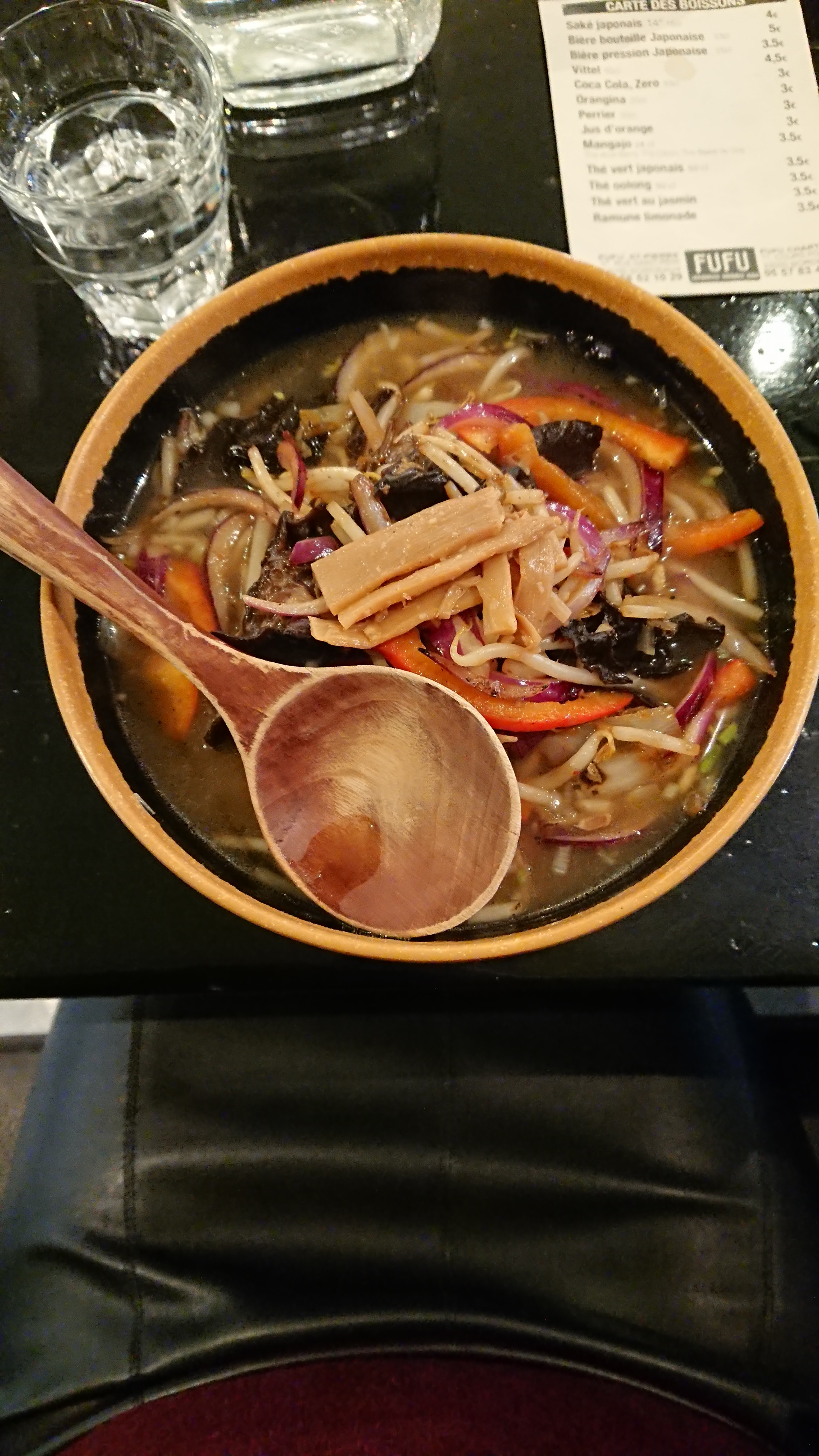 !! ATTENTION !! Carte mensongère, le ramen végétarien est en réalité cuisiné à partir d'un bouillon de poulet. Bien sûr, ceci n'est pas précisé. Ayant eu un doute sur le gout et l'odeur, j'ai appelé pour en avoir le coeur net, et ils me l'ont confirmé. Aucune possibilité d'adapter donc ce ramen à un régime végétarien.