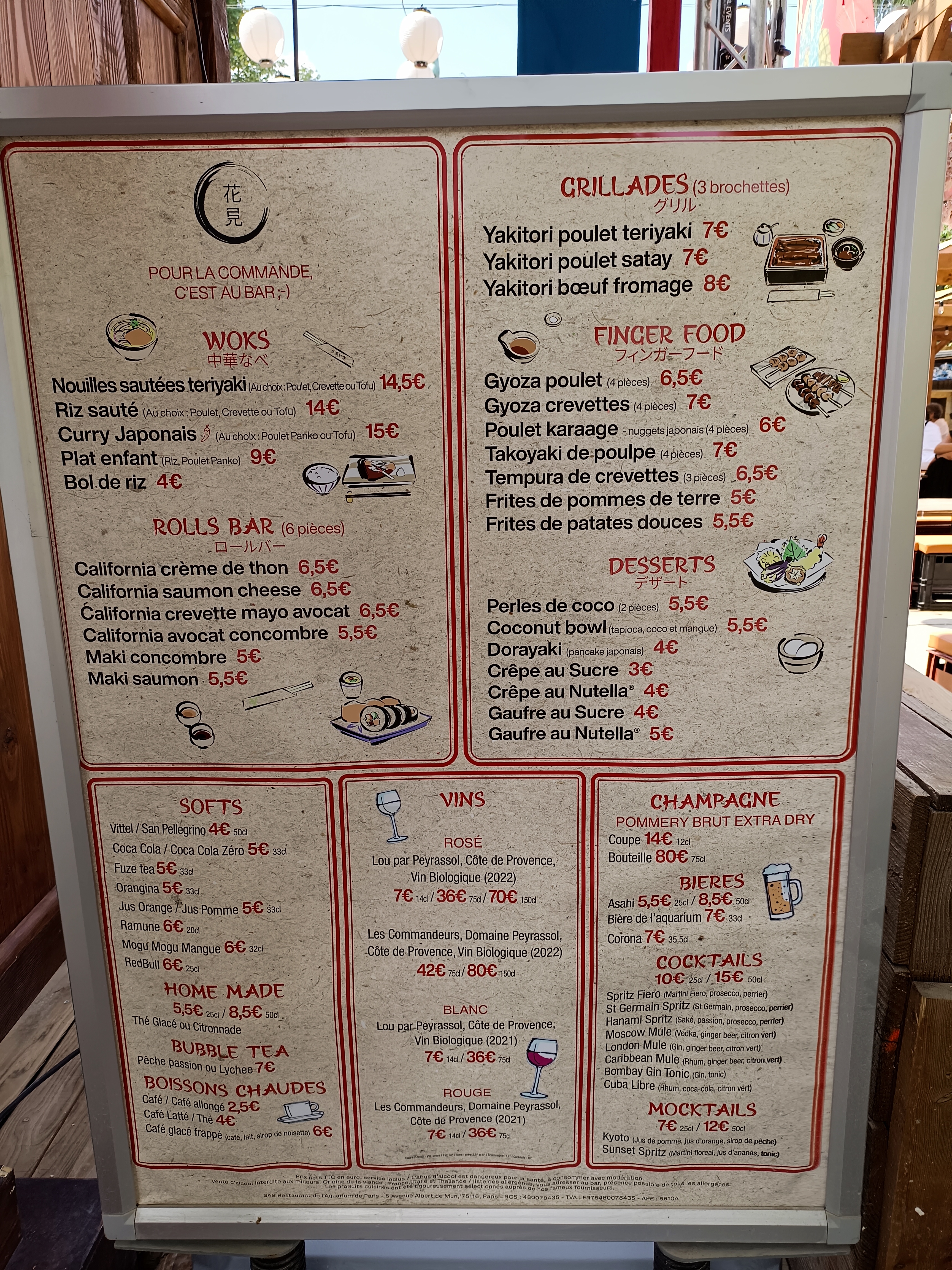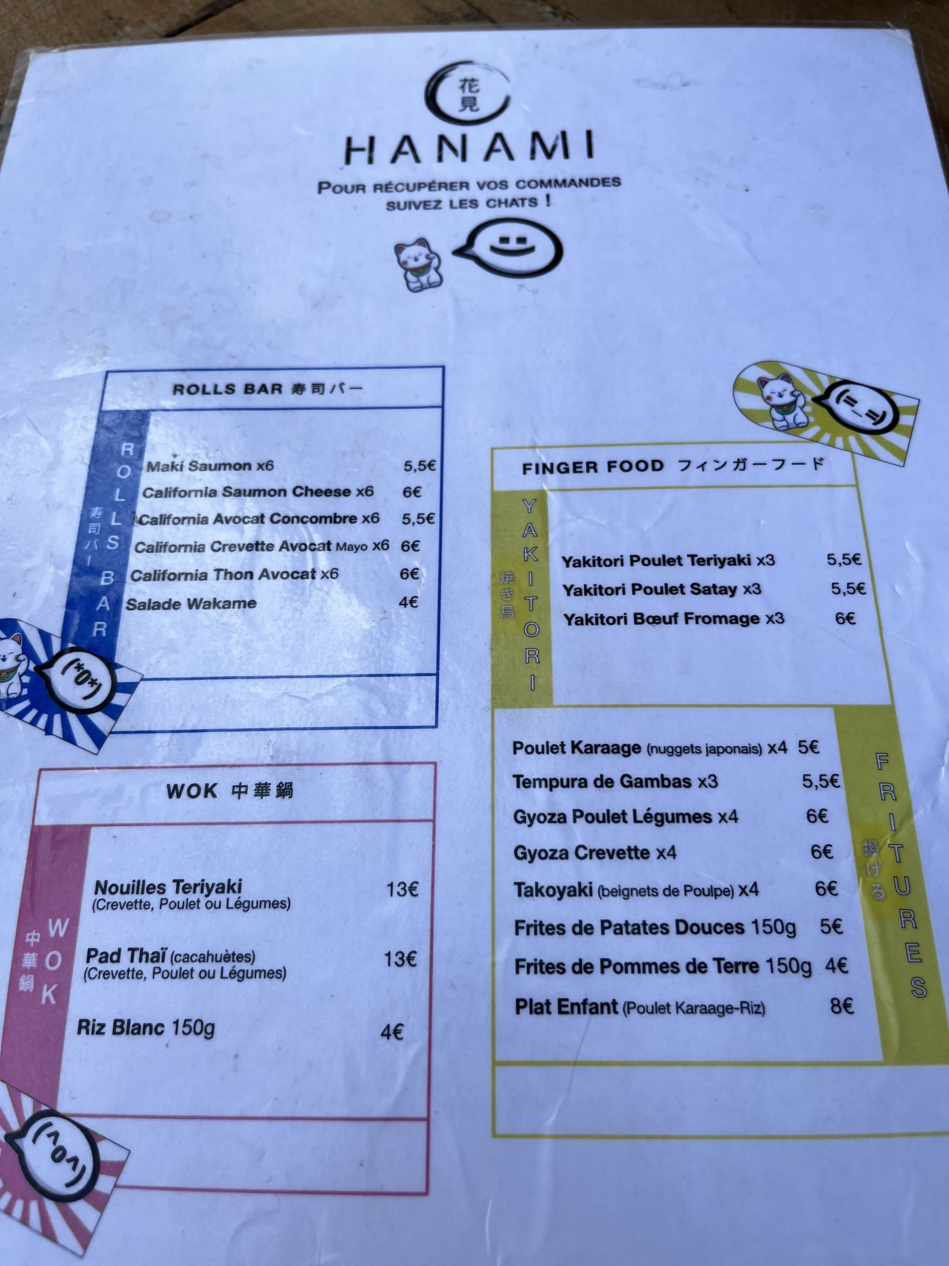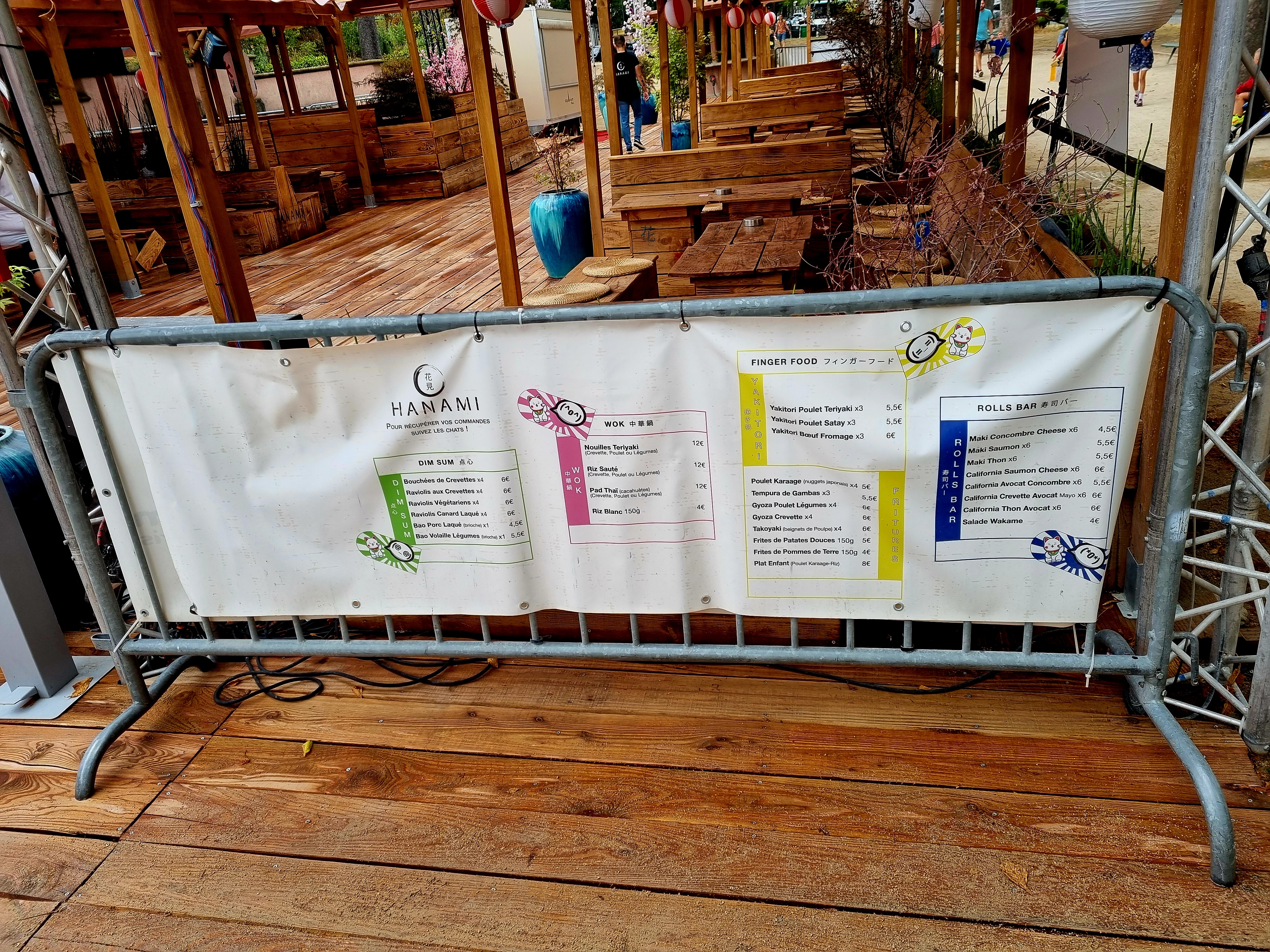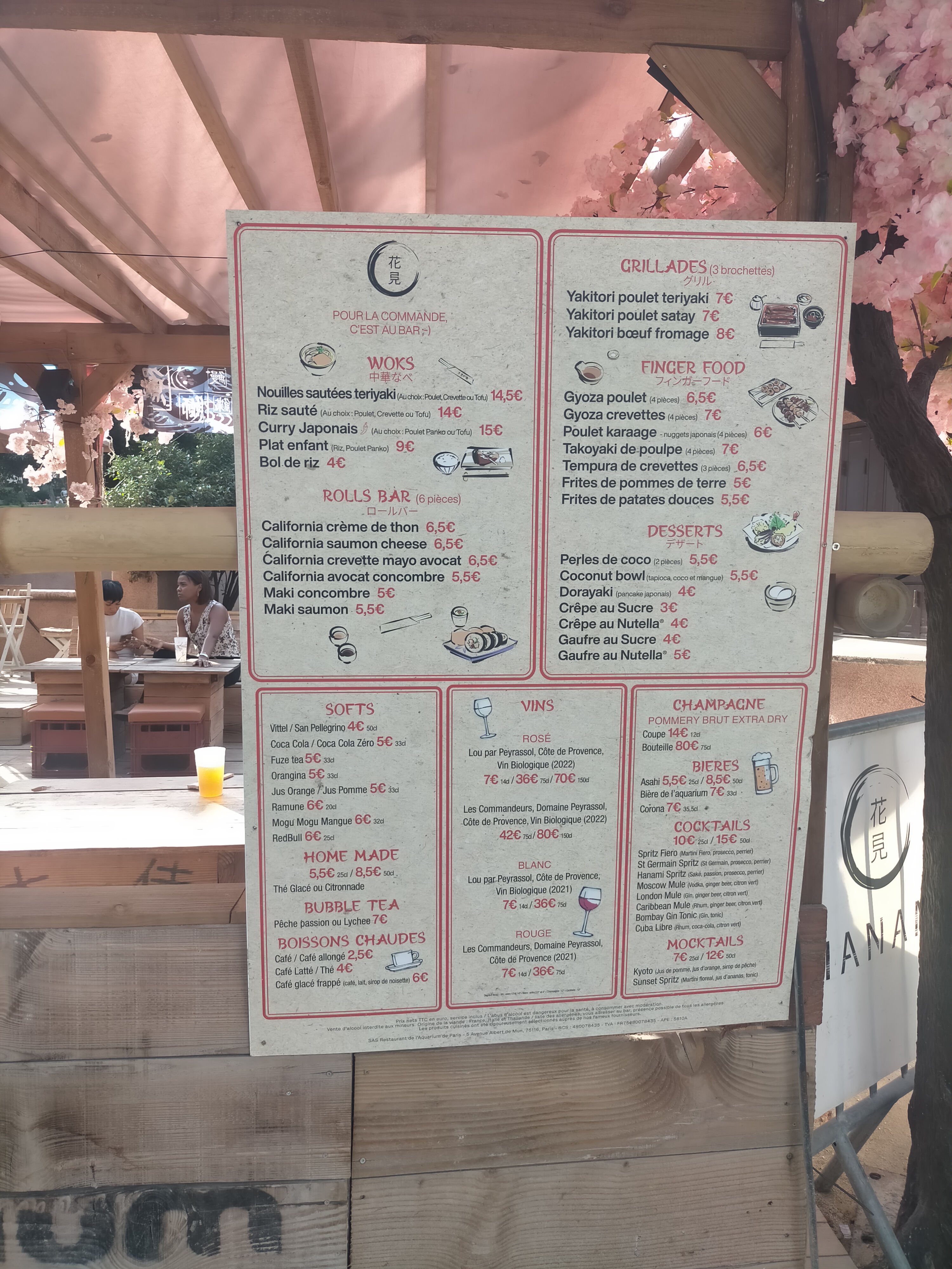 Le Hanami est un restaurant japonais situé en pleine air non loin de la tour Eiffel. J'y suis aller avec ma famille sur les coup de 19 heures. L'ambiance n'était pas invité accompagné d'aucune musique du moins quasiment inaudible et très peu d'indication donnée. Les employés sont tout sauf japonais (pour la plupart indien. Ils sont tous agglutinés dans un coin et ne se préoccupent pas des clients et du service… Ne parle aucun mots de français et essaye malgré tout un anglais déplorable. On essaye de suivre les quelques pancartes qui indiquaient de commander au bar. Le service n'est pas vraiment présent car accueilli par une jeune sur son téléphone à gouailler avec son collègue. Désorienter on trouve tout de même de quoi manger, du moins pour ce qu'il reste de la carte car nos principaux choix écrit sur la carte n'était pas présent. Avec des prix très peu attractifs. On trouve des bancs on bois reconnaissable avec ses clous et vis qui sortent on dirait du bois de récupération de chantier. On nous donne un beeper pour que nous allons chercher nos plats nous même quand ils sont prêt. Les cuisiniers eux aussi ne parlaient pas français, le discours ne se fait pas. Heureusement que personne avait eu des allergies car elles n'étaient ni renseignées ni expliquées. La nourriture reste convenable, à ce prix là c'est sur qu'on en profite mais ce n'est pas de la grande qualité. Un restaurent d'entrée de gamme japonais sur Paris tenue par des japonais aurait mieux fait l'affaire. Avec l'expérience que j'ai eu je ne recommanderais pas ce restaurant cependant il a de quoi être bien améliorer j'espère pourvoir y revenir et être immerger d'avantage dans le monde japonais.