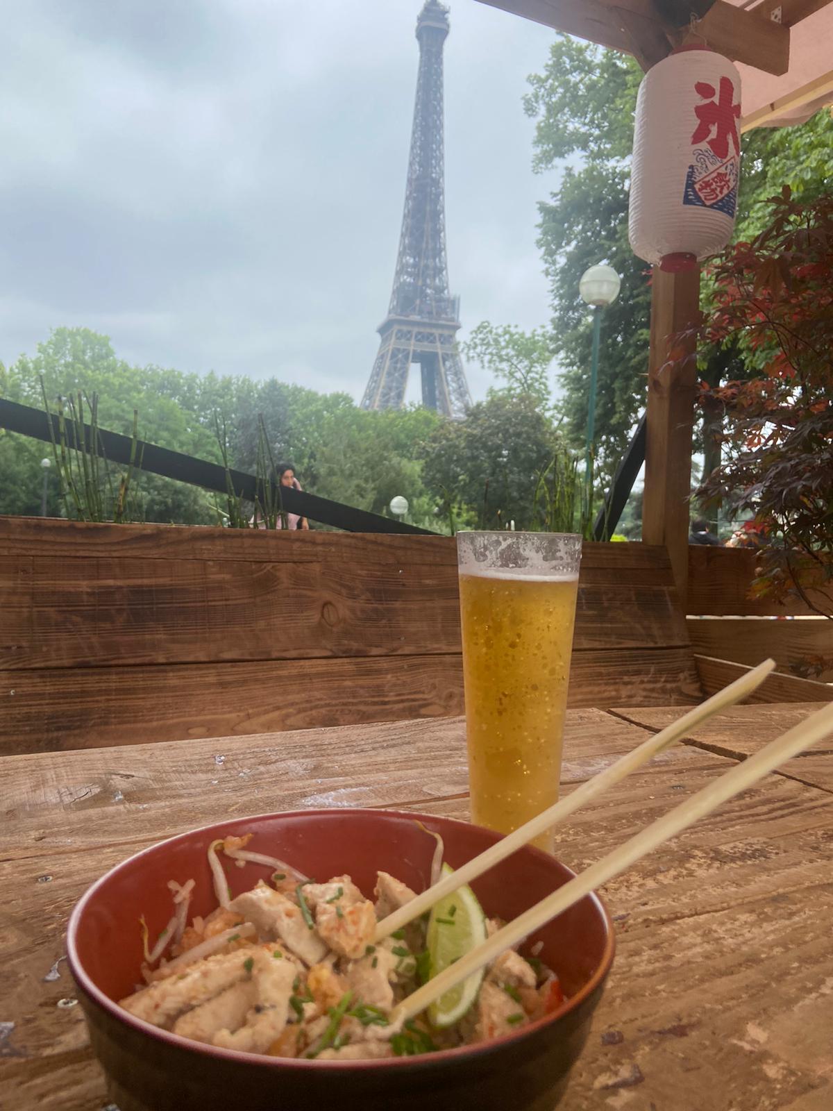 On a super bien mangé Wok de riz sauté et de nouilles sautées à 13e Terrasse devant la tour Eiffel, très agréable. Top