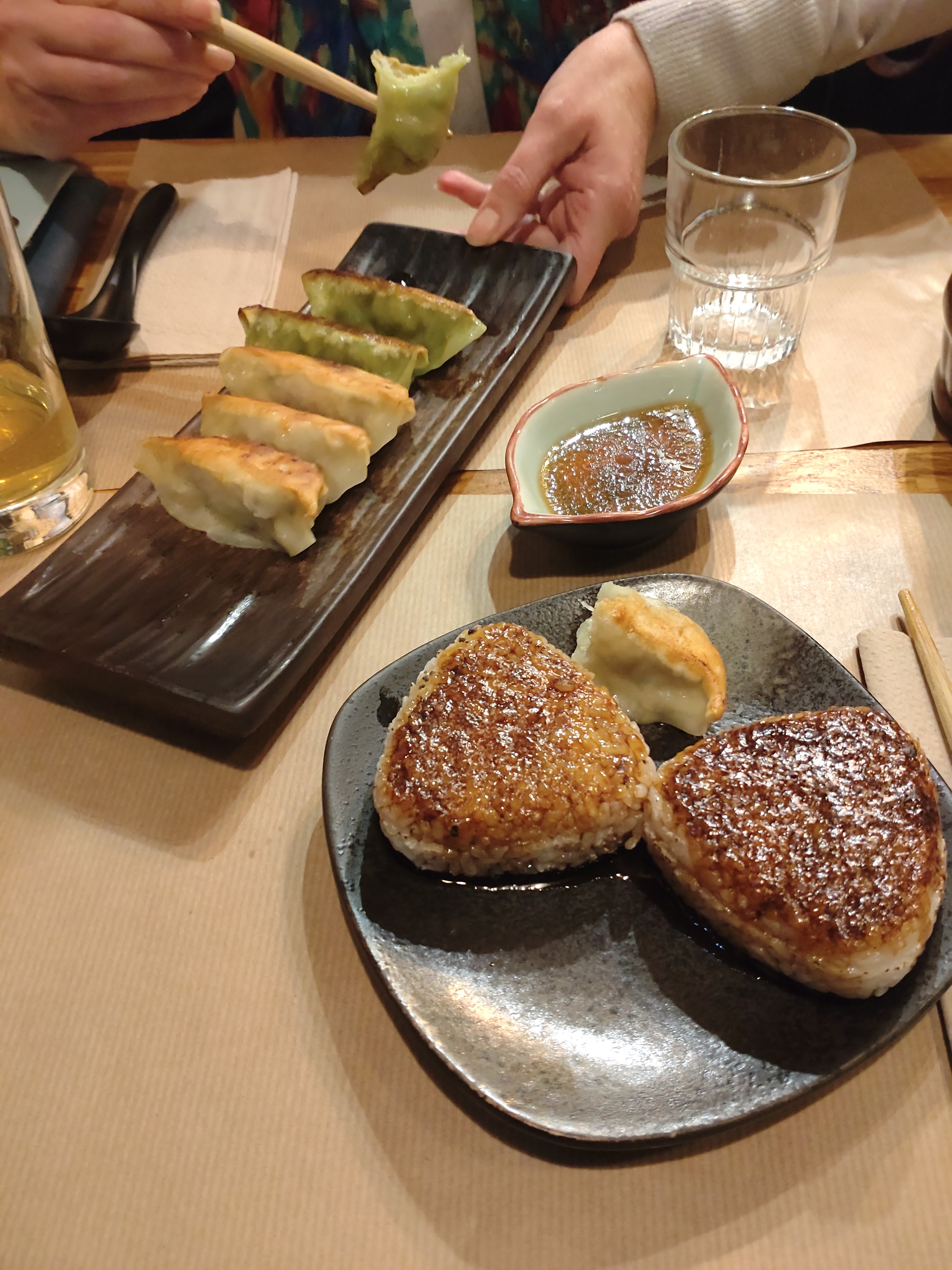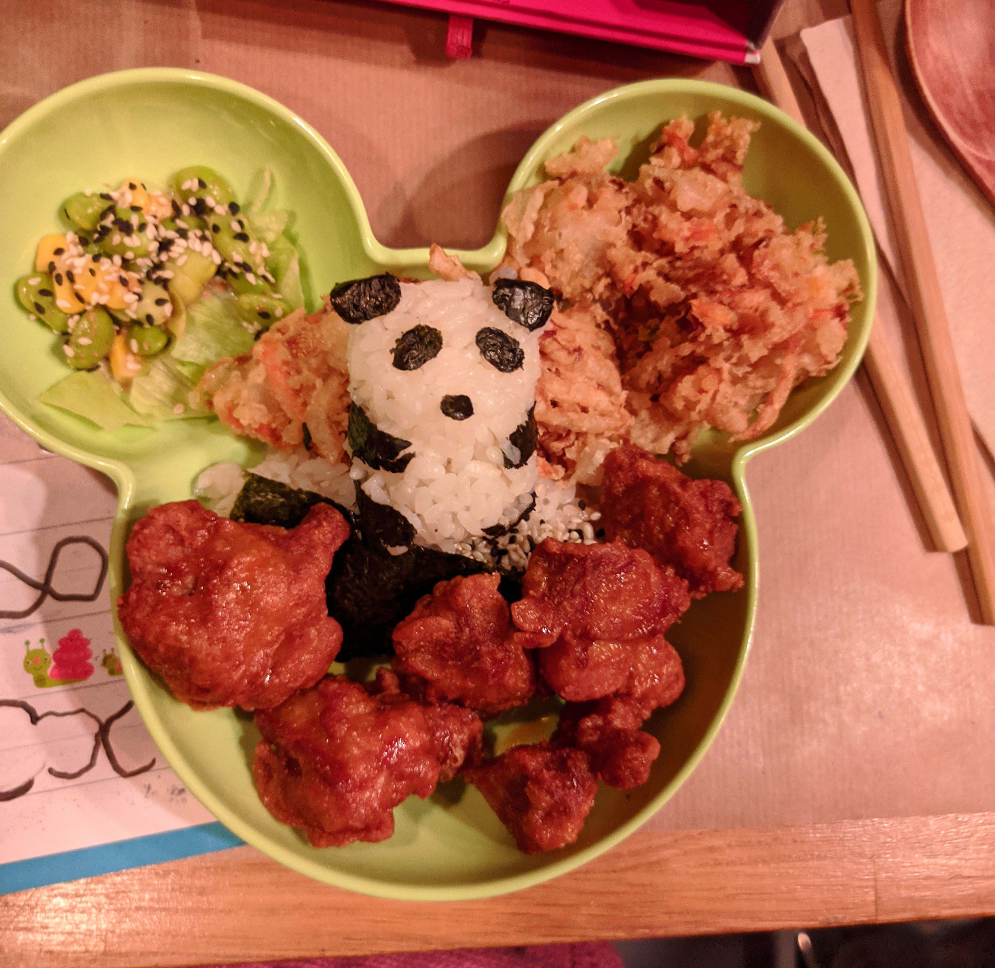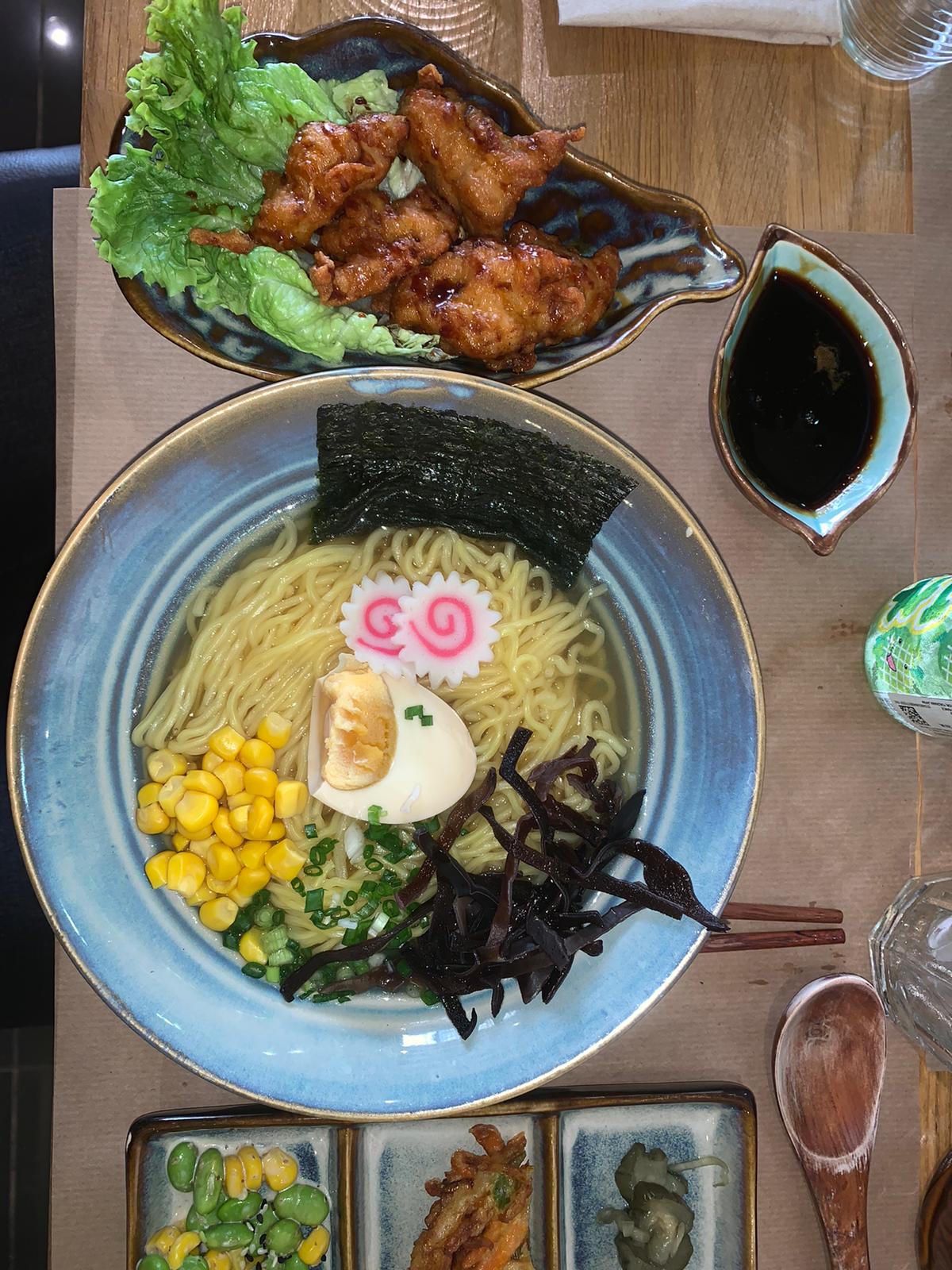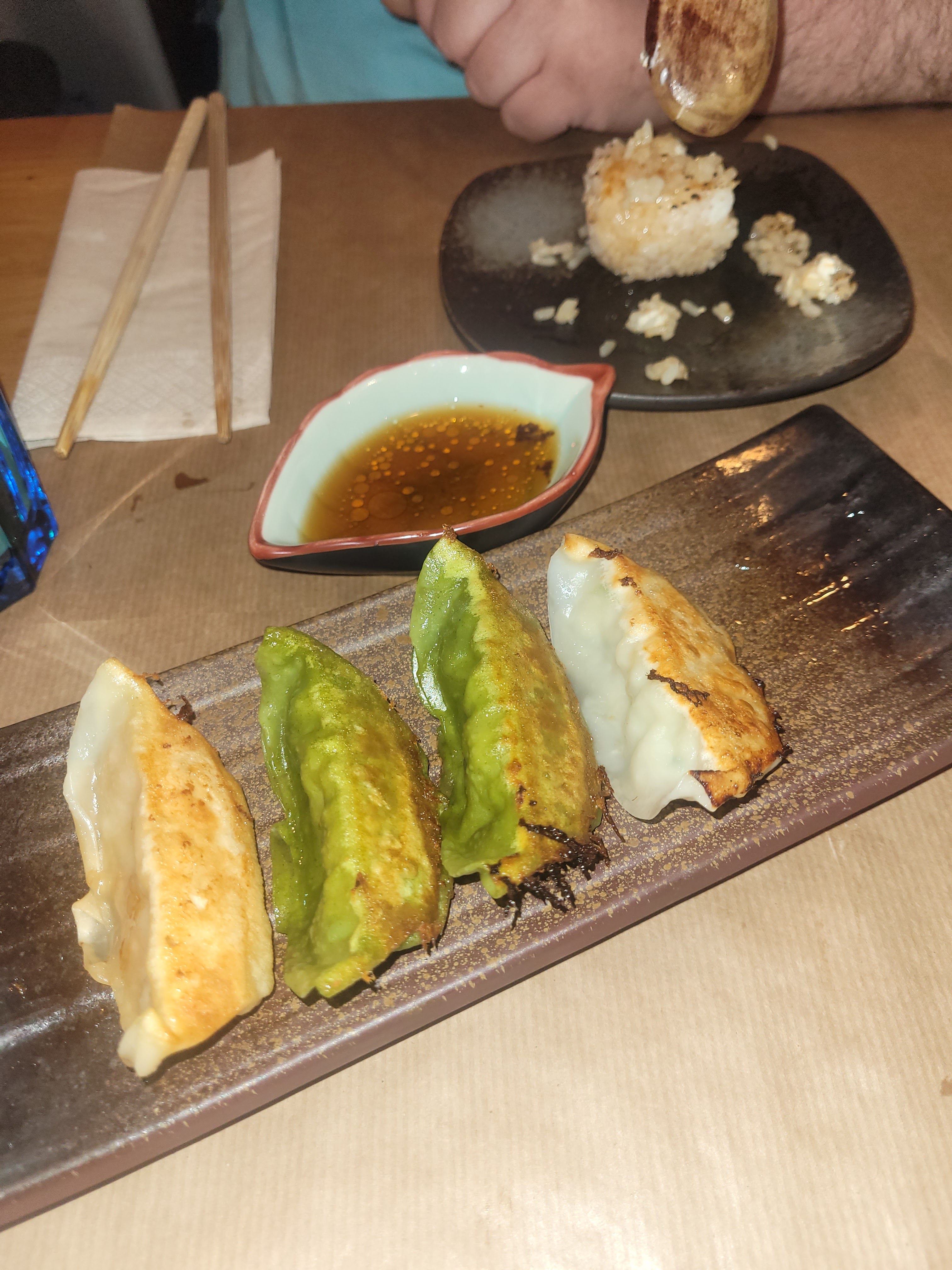 Karaage (poulet fris mariné) et gyozas délicieux. Jolie décoration 🤩