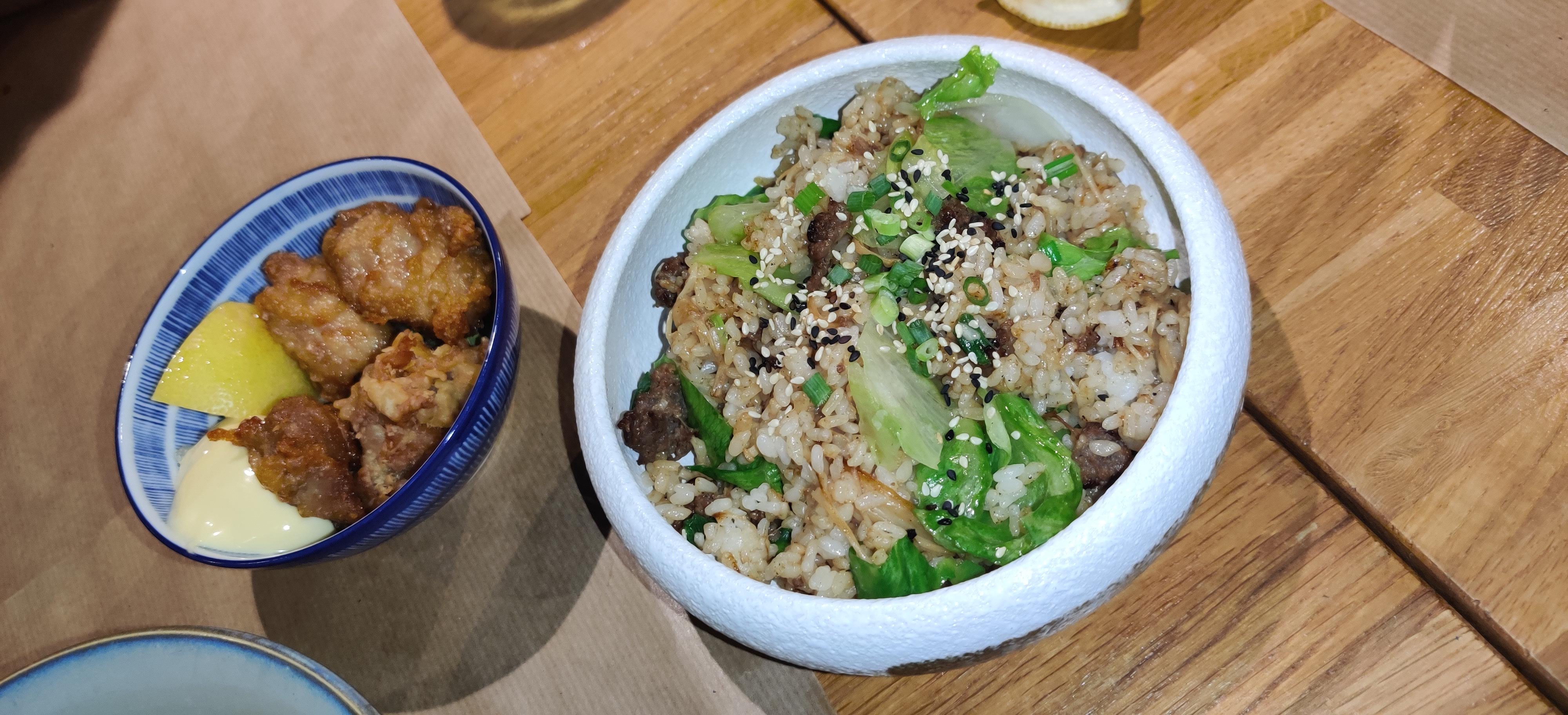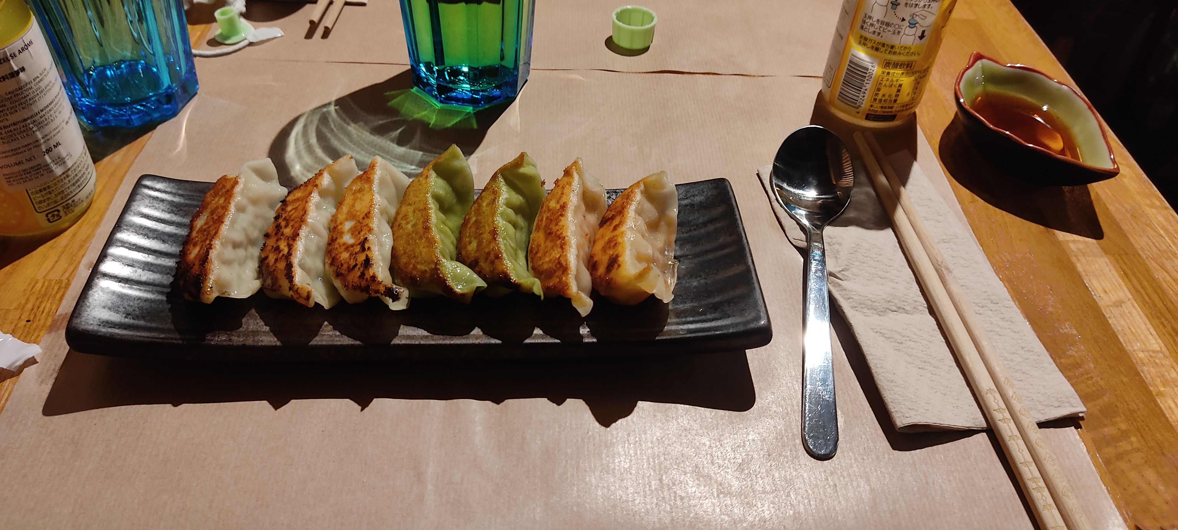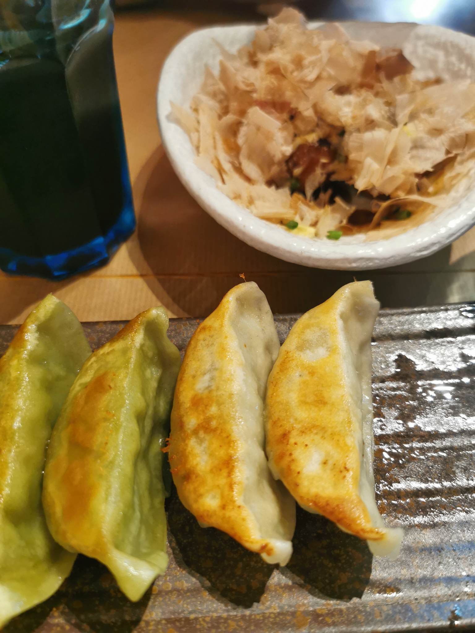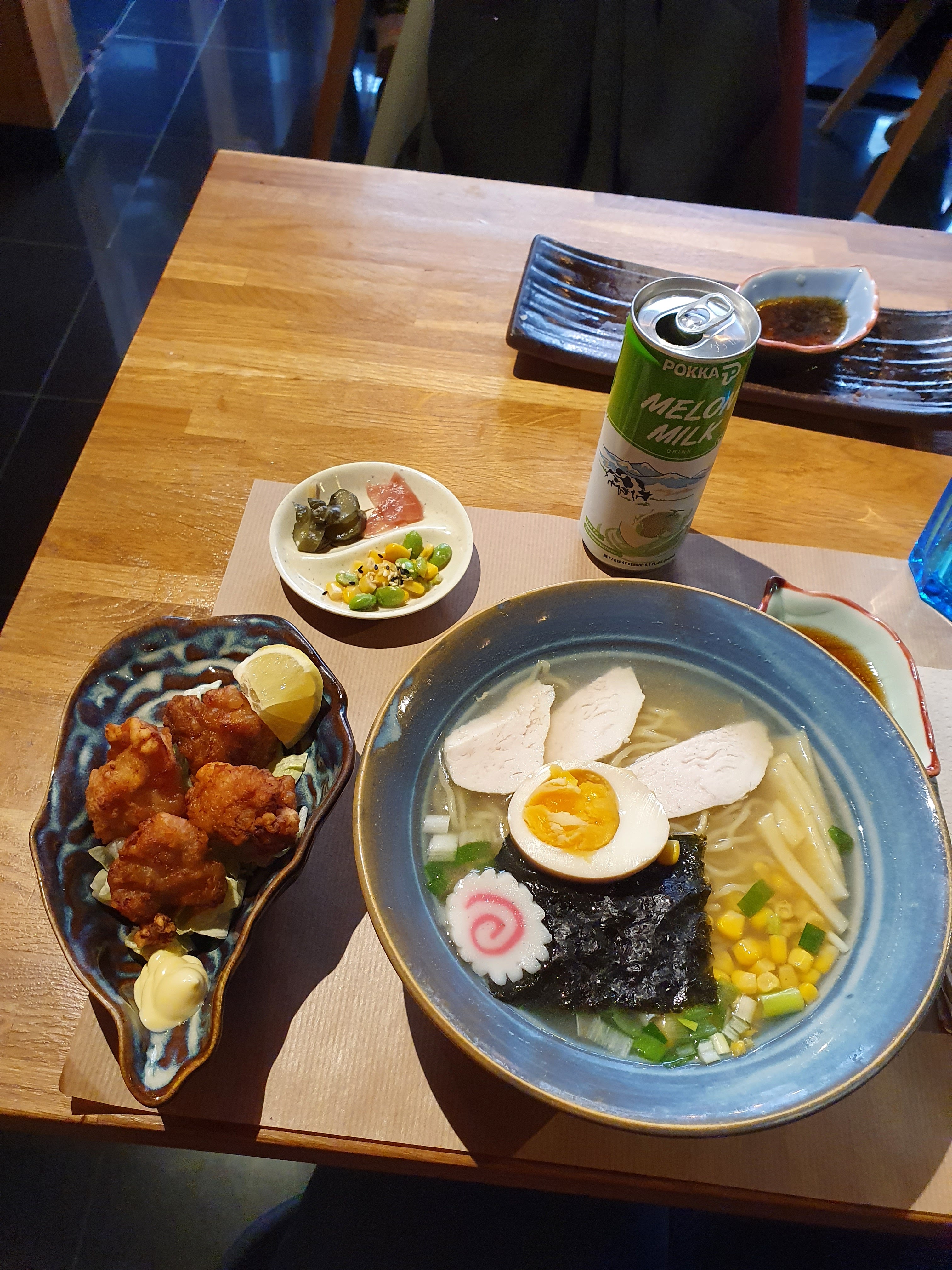 Karaage (poulet fris mariné) et gyozas délicieux. Jolie décoration 🤩