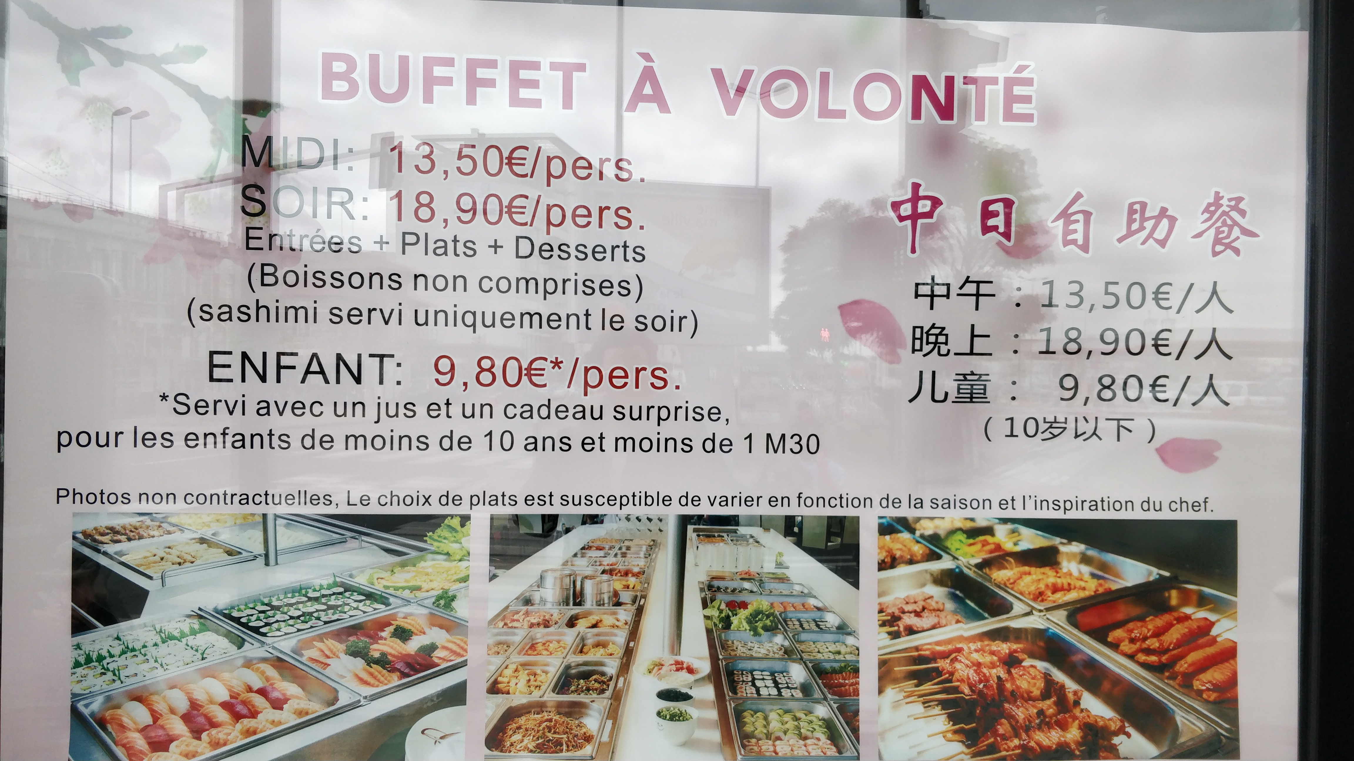 Posté le 06/02/2023 à 00:03"Restaurant japonais de qualité, mais sûrement dépassé par la concurrence en terme de quantité de buffet et si votre enfant fait au moins 1m30 espérer qu'il soit affamé ou un très gros mangeur car le prix passe de 9,90 à 19,90 dès 1m30."