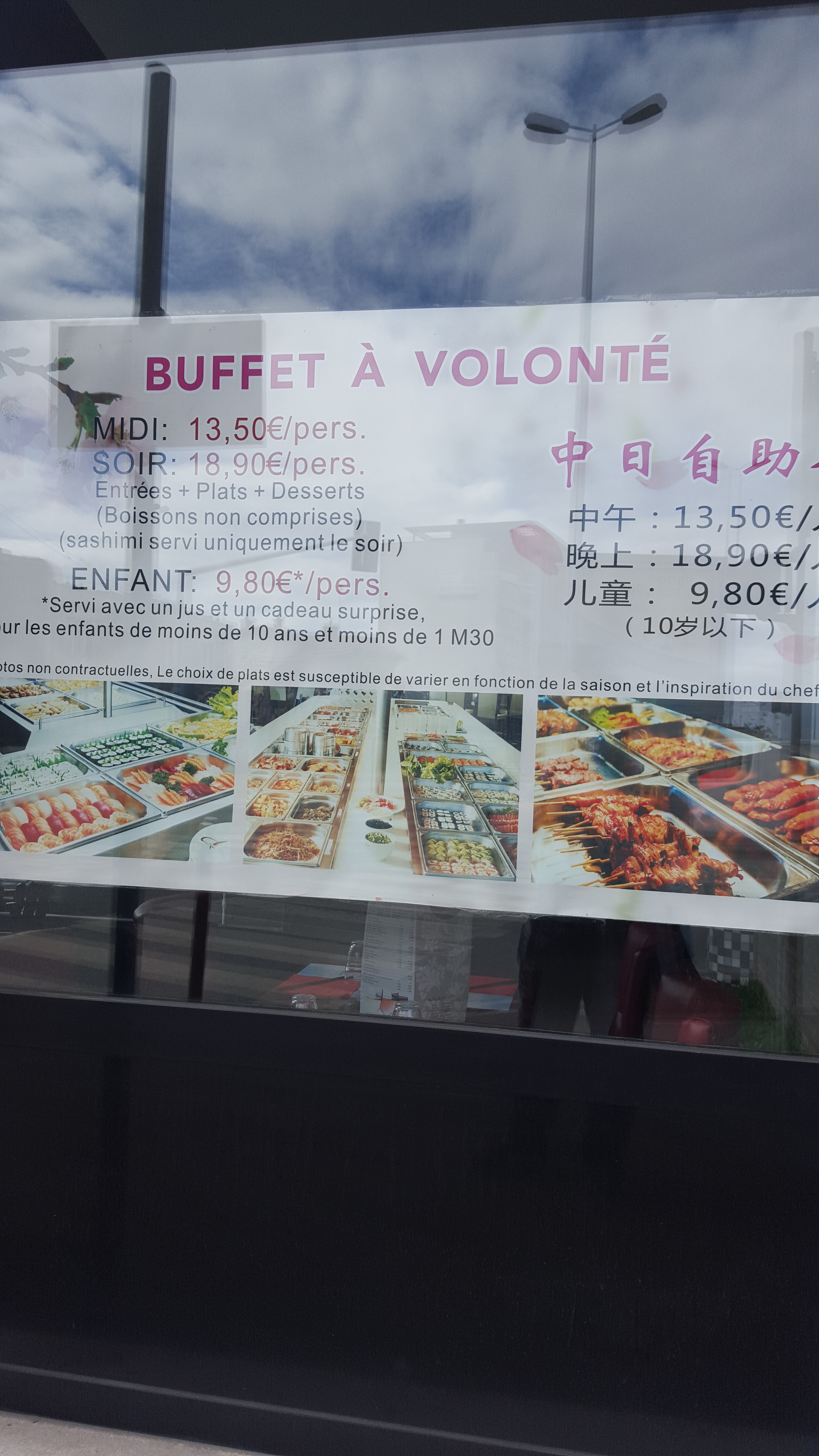 Posté le 29/01/2018 à 21:09"Enfin un restaurant chinois/ japonais et qui plus est , buffet soit si bon ! Un vrai régal, du plaisir aux palais. Le buffet est bien rempli, énorme choix. Les serveurs sont rapides, serviables et efficaces. Ce restaurant m’a réconcilié avec les restaurant chinois à buffet"