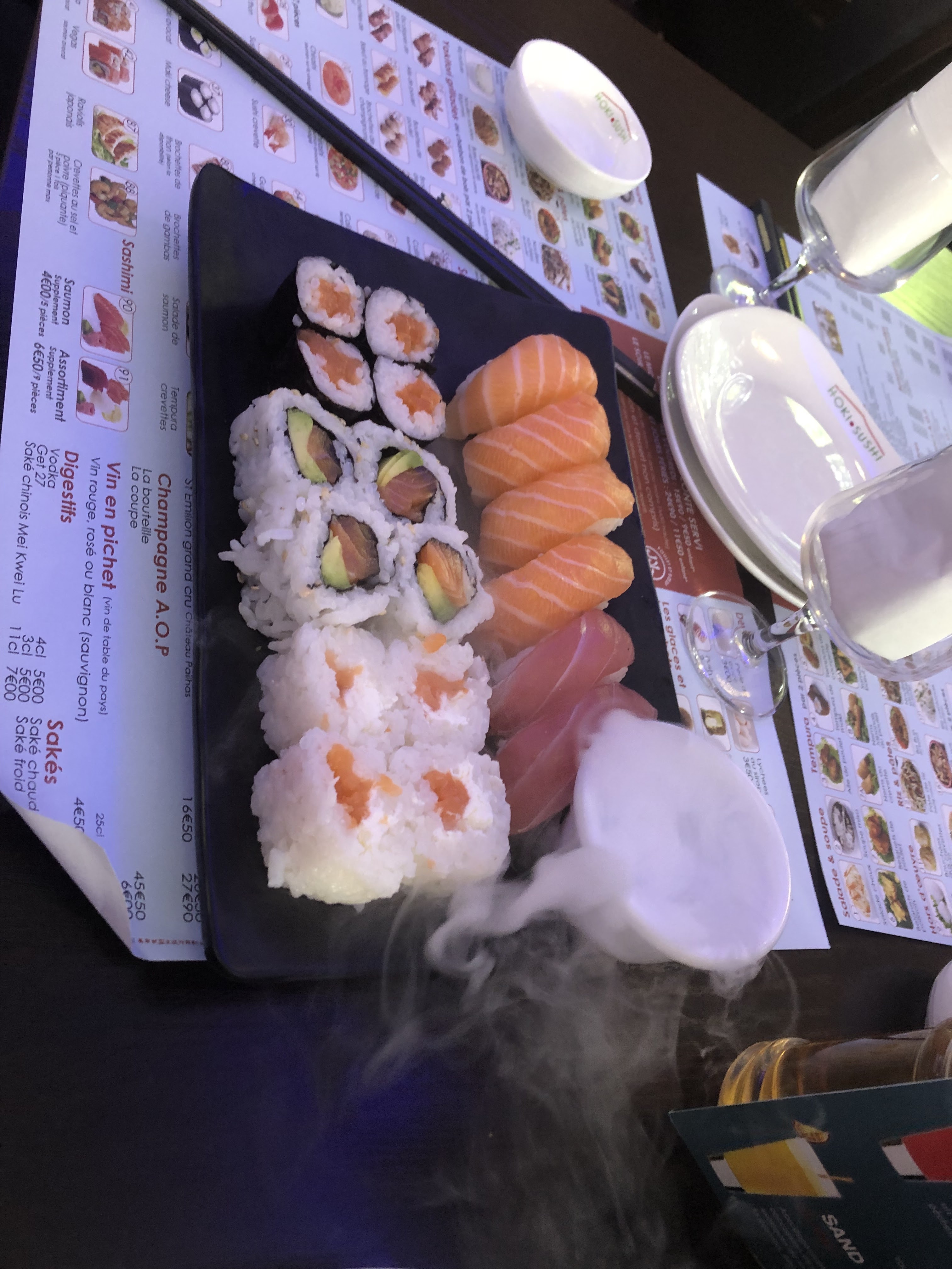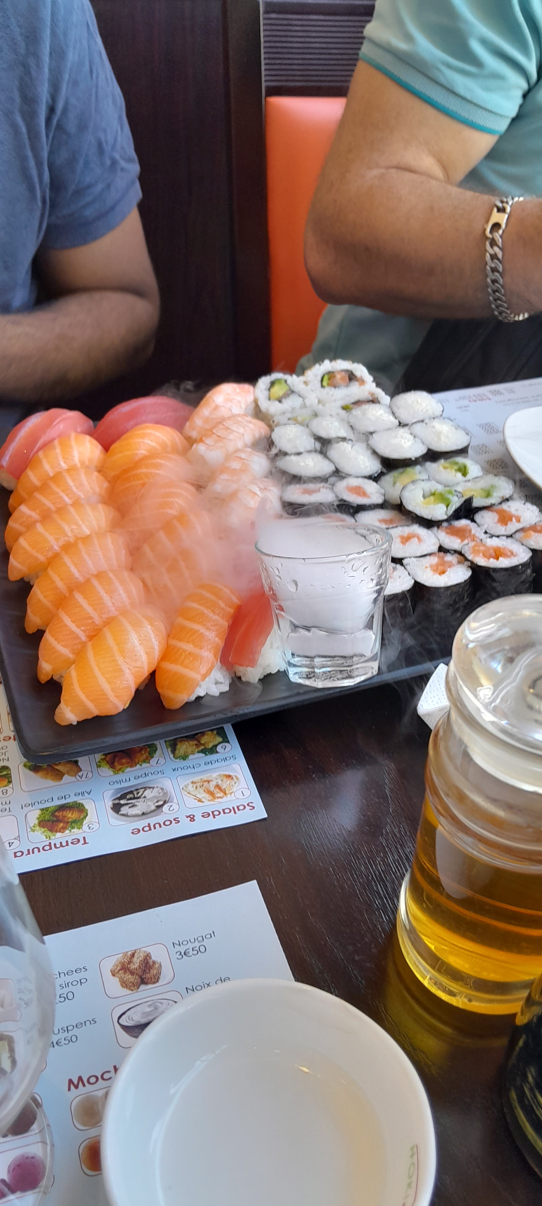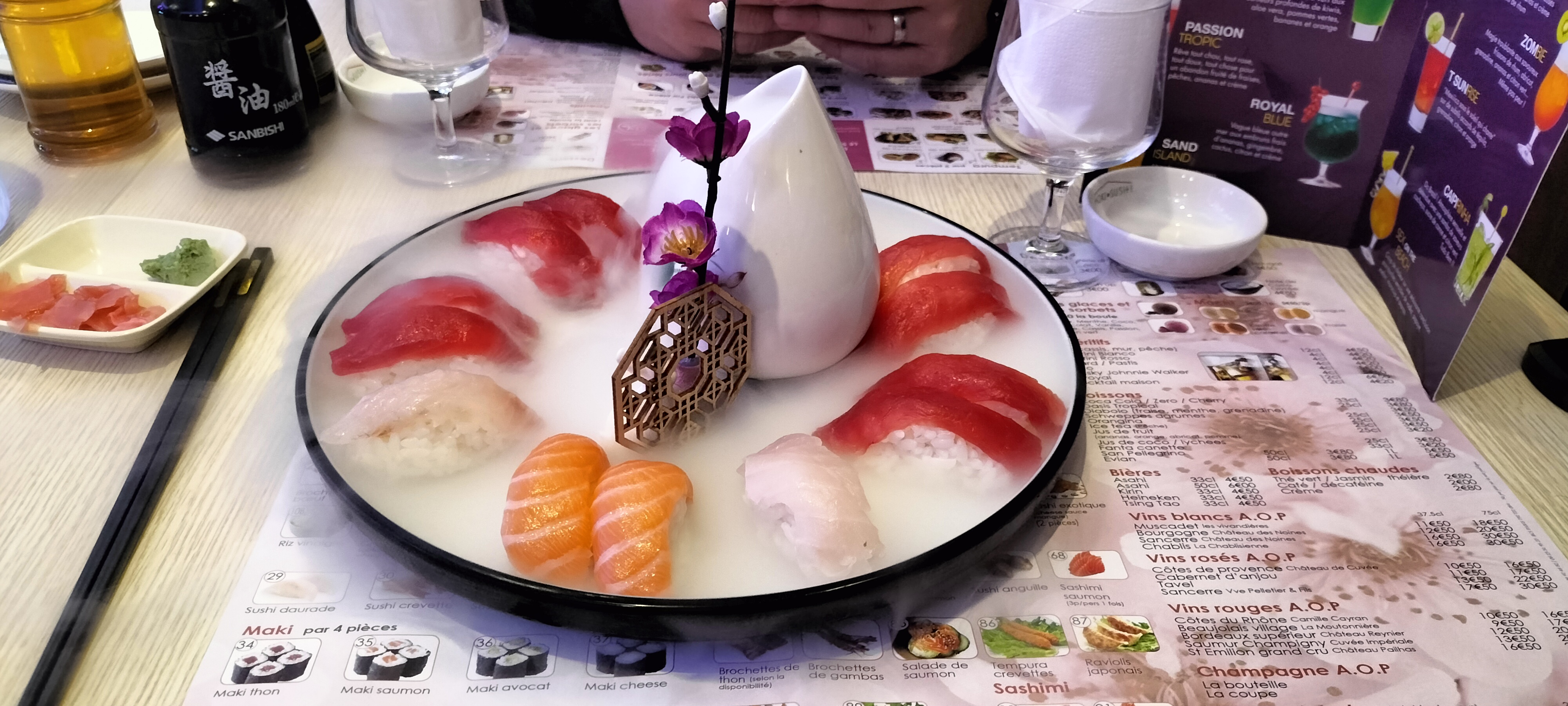 On voulait découvrir un resto de sushi à volonté dans le 91 et ce n'était pas terrible dans l'ensemble pour plusieurs raisons. Pour commencer, le riz est trop dense pour être finement digeste après le repas. Ensuite j'ai été très (désagréablement) surprise de constater que dans la formule à volonté les produits sont servis par paire et non pas par six, comme c'est le cas partout ailleurs ! Pour finir, le sashimi c'est trois tranches de saumon une seule fois par tablée, peu importe si vous êtes plusieurs. Après, le poisson a l'air frais et ce n'était pas mauvais dans l'ensemble, mais je n'y retournerai pas.