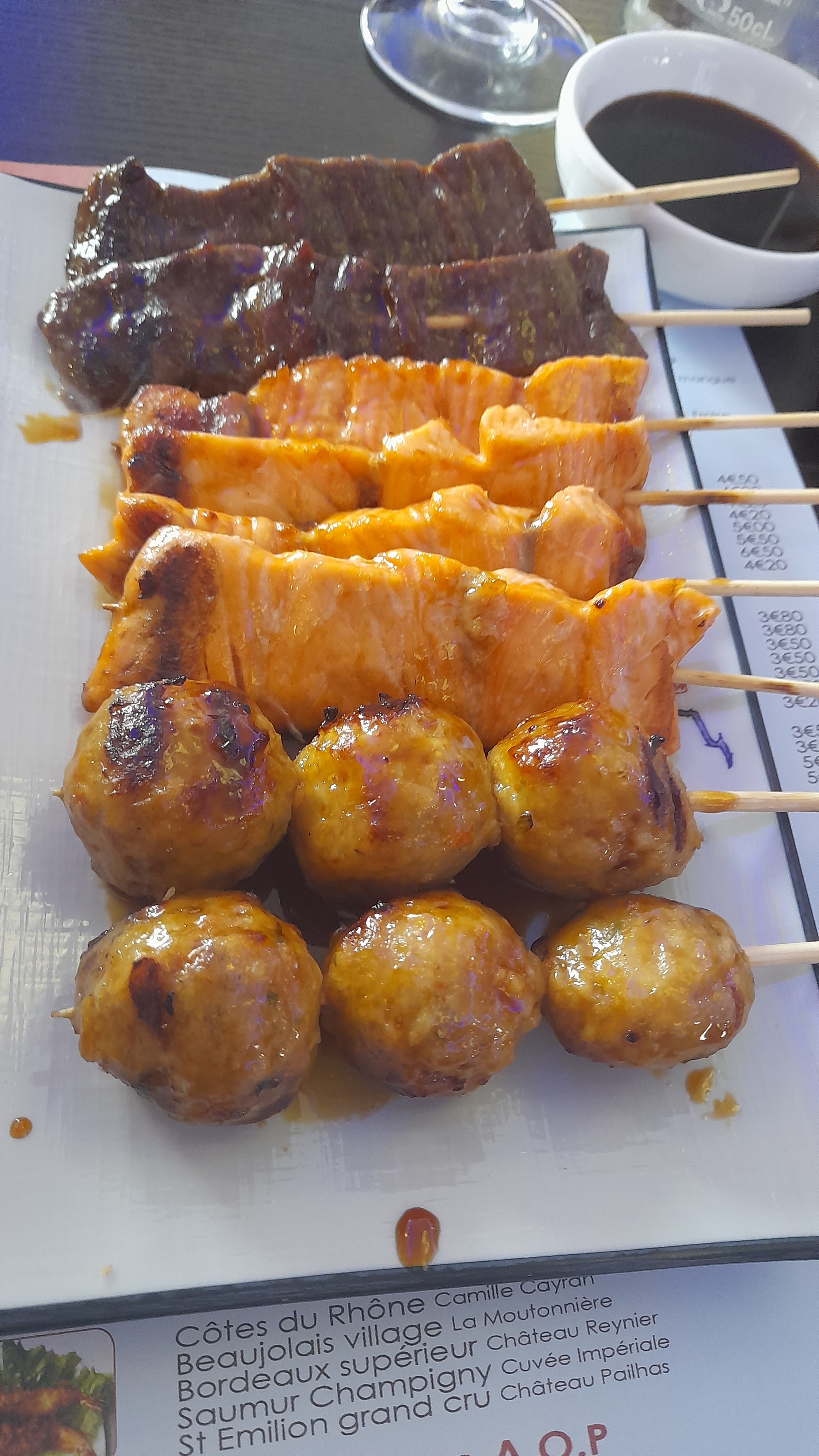 Commande en livraison, pas terrible du tout. Je ne recommanderais pas chez eux. Brochettes rachitiques, mal cuites pour la plupart et pas bonnes. Portions salade ridicule. Pas de baguettes non plus. A éviter a mon avis.