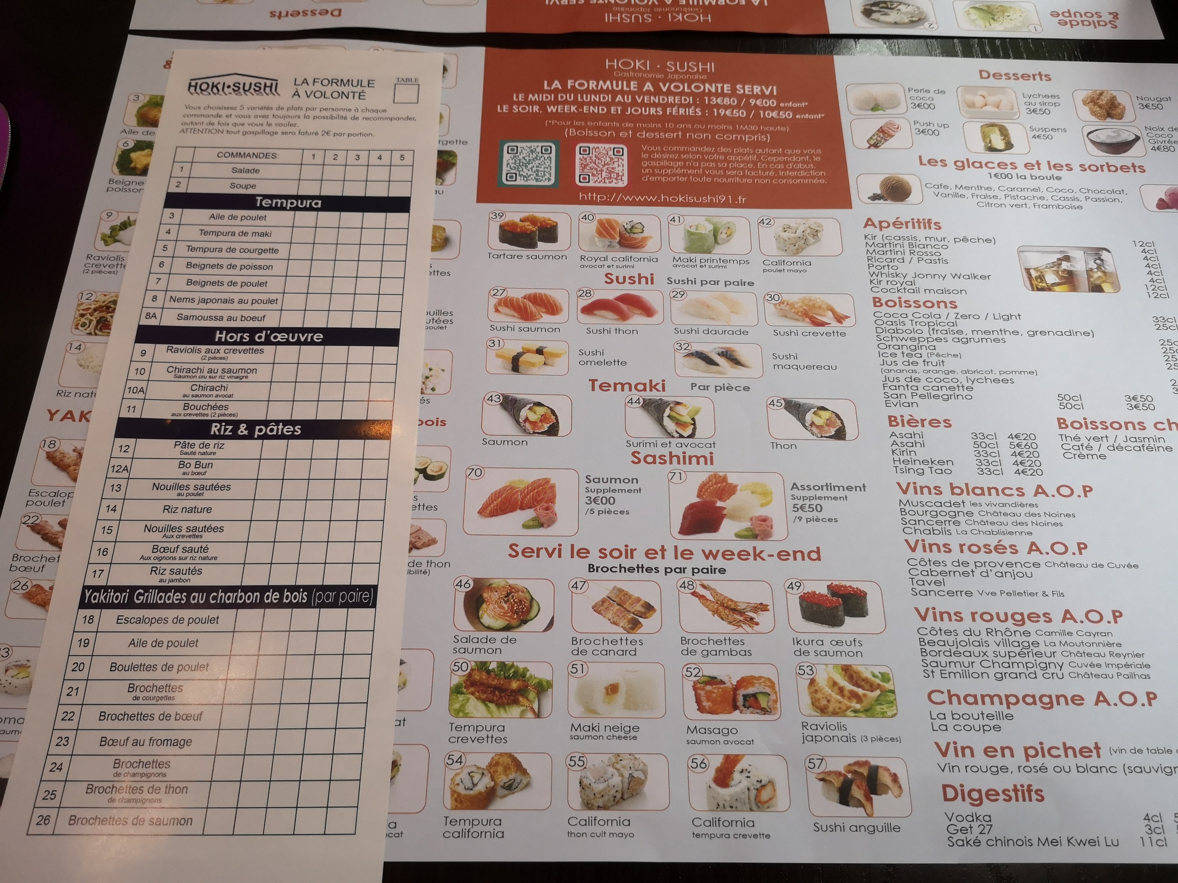 Premier passage au sein de ce restaurant hier soir. Le restaurant est assez caché, il faut en effet passer bien par une rue précise au sein de la zone pour le trouver. Petit parking juste devant et d'autres places près de la route principale. Le restaurant bien que petit d'aspect extérieur est spacieux et confortable à l'intérieur. Les serveurs sont rapides, accueillant et efficaces. (sitôt un plat fini celui-ci est immédiatement retiré pour passer au suivant rapidement) La formule Buffet à volonté est à 19.90 euros le soir et idéal pour tout gros appétit. On peut commander 5 plats maximum par commande, avec une amende de 2 euros par portion non mangé et donc gaspillé. Aucun Doggy Bag possible. Il vaut donc bien mieux ne pas avoir les yeux plus gros que le ventre! On inscrit simplement la quantité du plat désiré dans la case correspondant à son numéro associé dans une grille. Le serveur scanne ensuite cette commande et apporte les plats par la suite. En premier lieu des chips à la crevette sont offerte dès le début puis les plats commandés. Pour ma part j'ai commandé dans un premier temps du riz sauté au jambon (riz cantonais) avec du bœuf au fromage, des boulettes de bœuf ainsi que du sushi et du maki au saumon. Les sushi et maki sont apportés par paire tout comme les brochettes de bœuf. Les plats sont savoureux et calant assez rapidement. Dans un second temps j'ai commandé divers sushi et maki pour goûter (maki omelette, maki au œuf de saumon, maki neige saumon). Je déconseille le maki pour un plus gros repas car ils calent assez vite en effet, contrairement aux sushis qui s'enchainent comme des petits pains! Sauce sucré ou salé, ou gingembre ou wasabi en accompagnement au choix. Rien à redire sur le rapport qualité/prix des plats qui sont bons. Seul Bémol: aucun dessert n'est compris dans la formule buffet à volonté contrairement à d'autres établissements. Difficile de ne manger que du salé sans finir sur une note sucrée pour terminer parfaitement le repas. Hormis cela rien à redire je recommande ce restaurant pour passer une bonne soirée entre plusieurs amis et se remplir la panse comme il se doit!