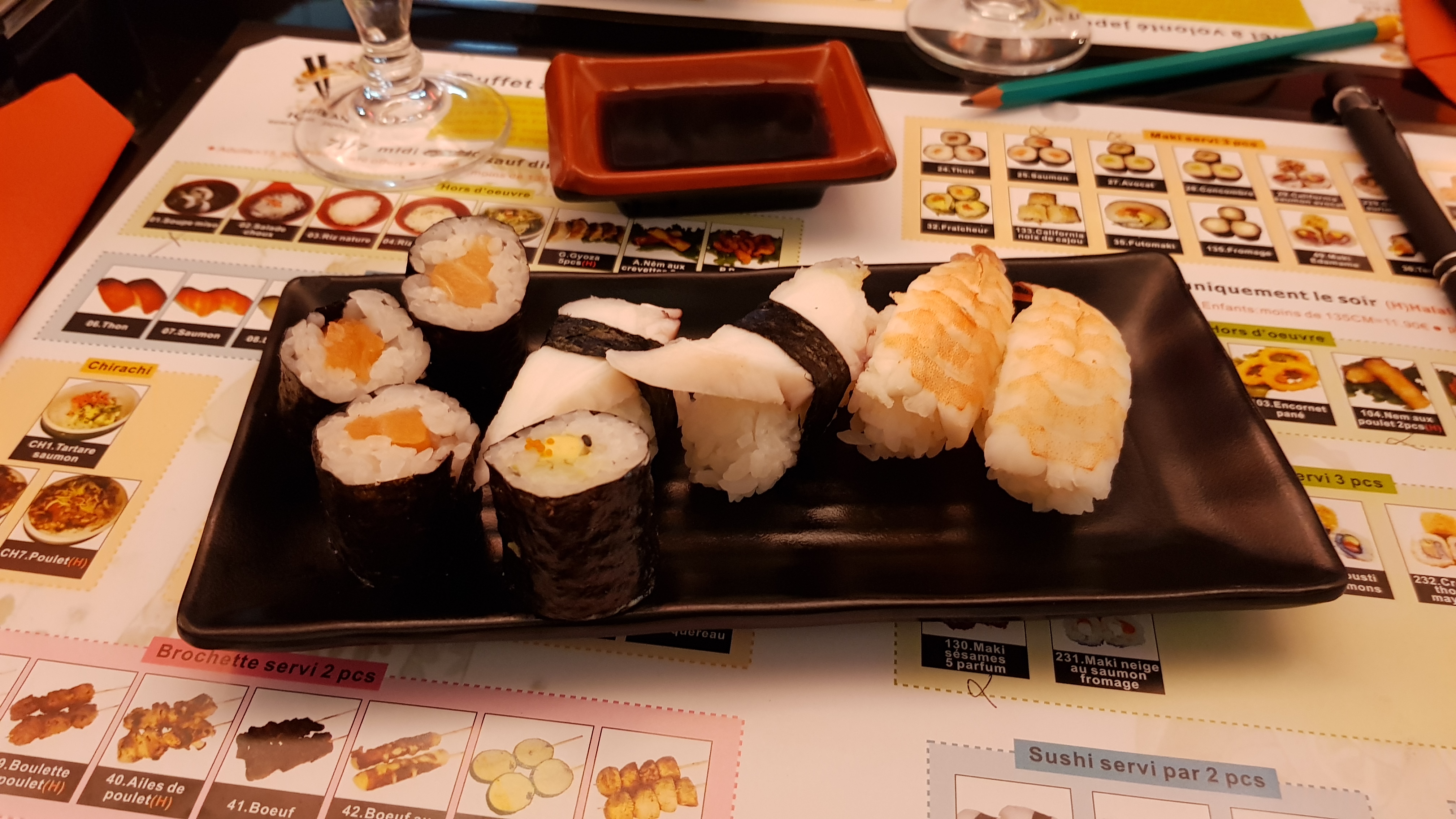Posté le 14/11/2023 à 13:29"À volonté, mais trois services. Bien calculer les portions entre vous car les quantités sont correctes. Les makis, sushis 🍣étaient bons. Les fritures un peu moins bonnes, un peu sèches. Service agréable et personnel parfait."