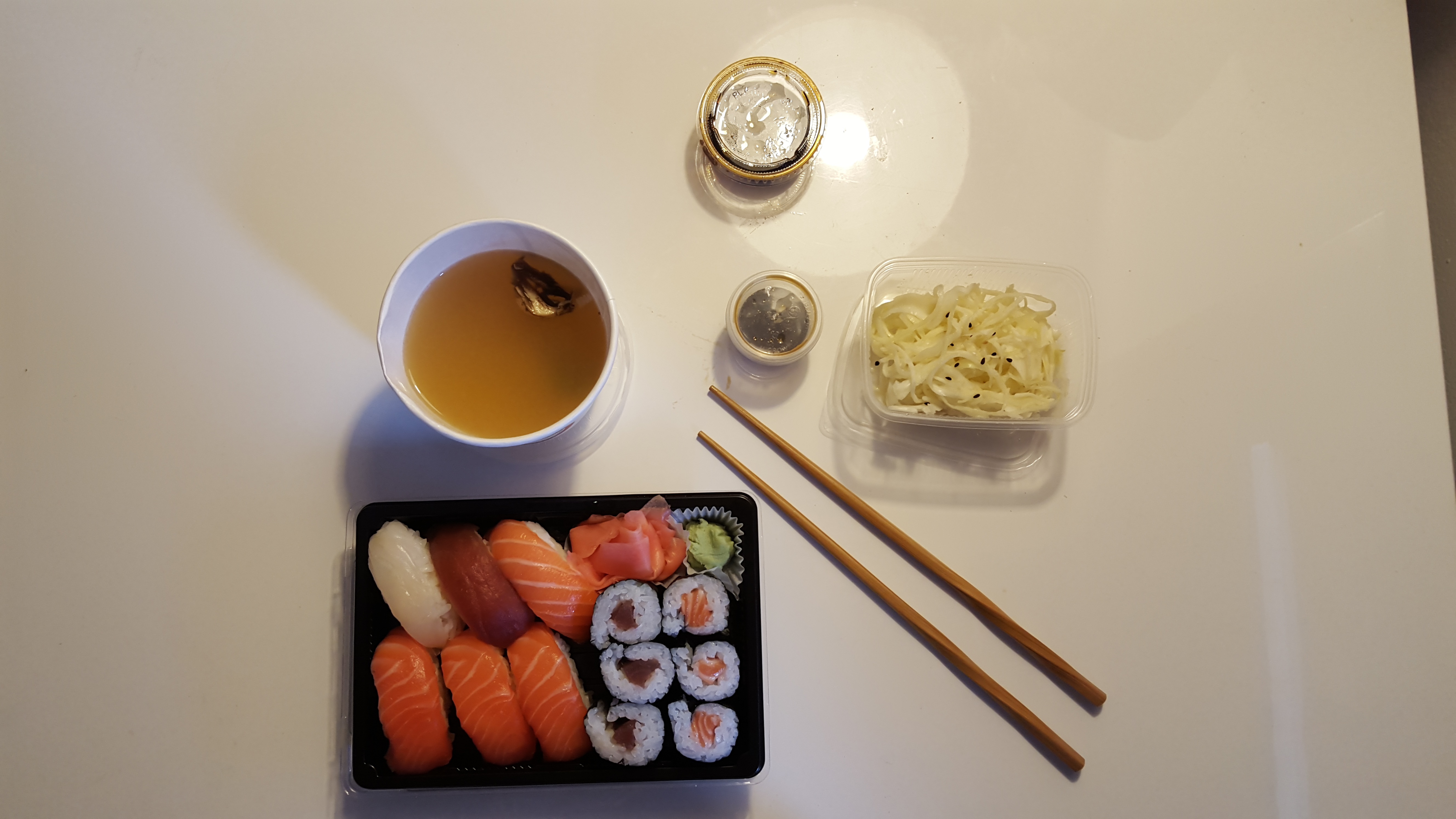 Livraison en moin de 30min sushi frais et délicieux a ne pas manger le lendemain si vous avez pas l’estomac fragile et il faudrez une cuillère pour la soupe miso