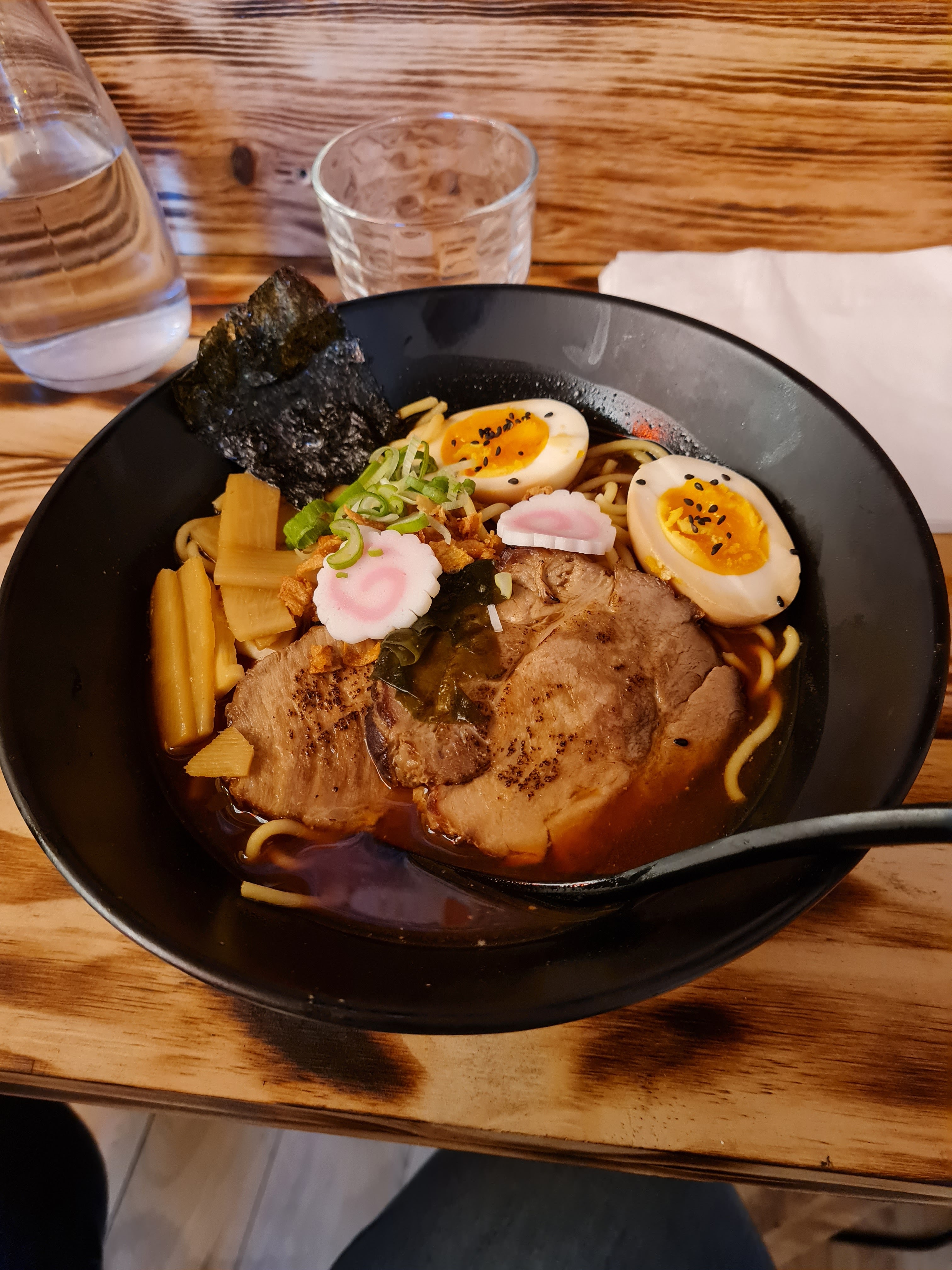 Première fois que je goûte un ramen et j'ai bien aimé ! Je ne suis pas très difficile alors je me contente dire que c'était sympa. Mais honnêtement les pâtes avaient un goût de pâtes pas assez cuites. Je ne pourrai pas en juger davantage car, comme précisé, il s'agit de mon premier ramen. Je suis venue en tant que fan de l'univers Naruto, je reste un peu sur ma faim, dubitatif car je ne sais pas si je reviendrai. J'ai pris à emporté alors je ne pourrais pas comparer les proportions avec le sur place mais le bol ma quand même bien callé. Aussi, c'est assez petit à l'intérieur et il n'y a qu'une table haute collé au mur pour manger (et qui est collante en plus de ça). Ca serait sympa de pouvoir s'y assoir le soir et pas forcément prendre à emporter ! Je recommande pour tester quand même, car ça reste bon, il y a quelques petites choses à améliorer pour que ça en devienne délicieux et incontournable !!
