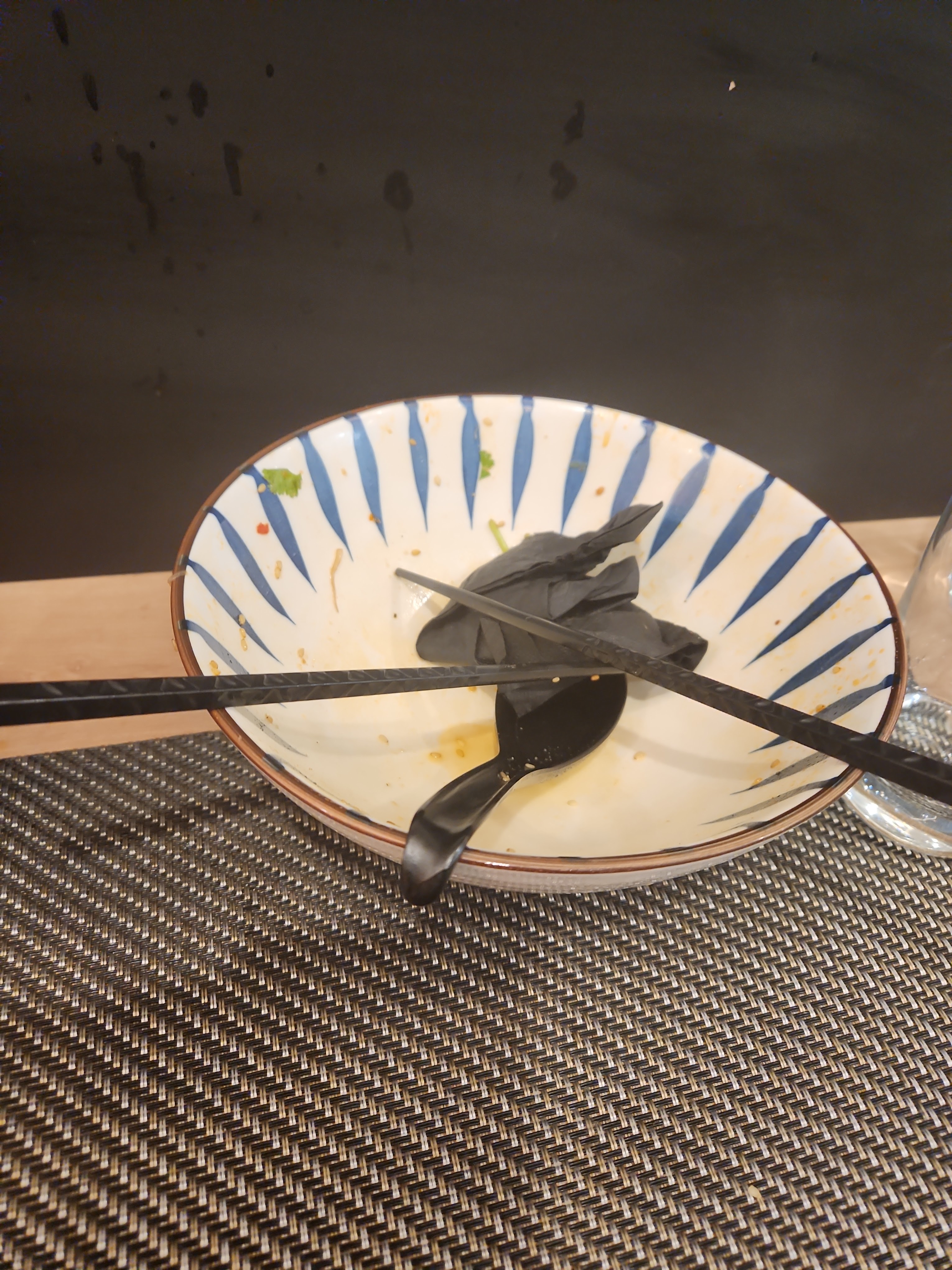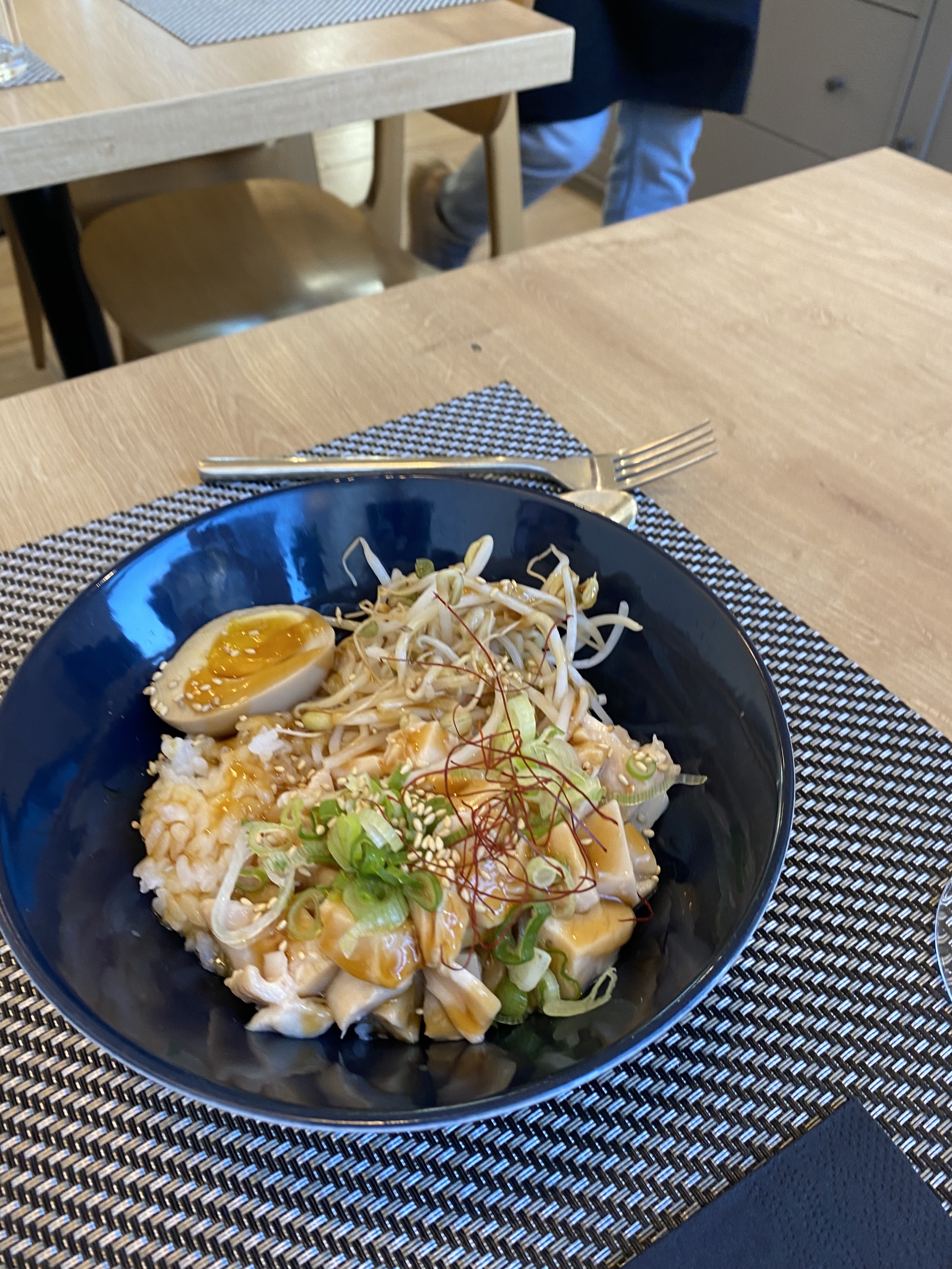 Ça a l'air génial, tout le monde est gentil. Mais le goût des ramen est plutôt monotone et boiteux, le poulet était parfois dur comme du cuir, la soupe était aqueuse. Seuls le sésame et le soja ont ajouté de la saveur ; mais alors beaucoup trop dominant.