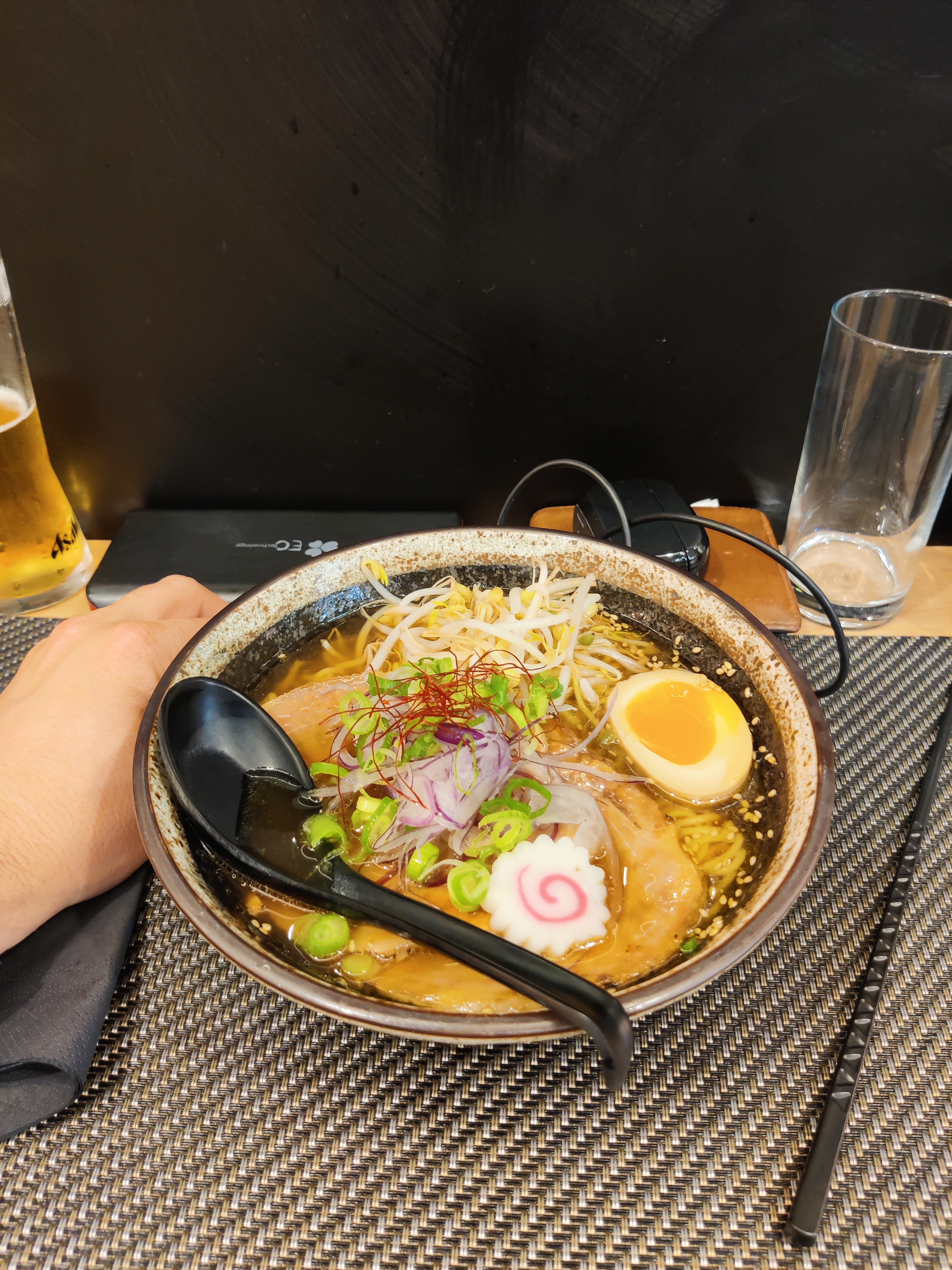 Enfin l'occasion de déguster un Ramen Une première expérience réussie Découverte aussi des graines de soja légèrement salées Apparence proche des petits pois mais goût différent Ambiance générale agréable et très bon conseil du jeune serveur pour le choix du Ramen et de la boisson La bière Asahi accompagne bien effectivement le Ramen Je reviendrai avec plaisir et accompagnée