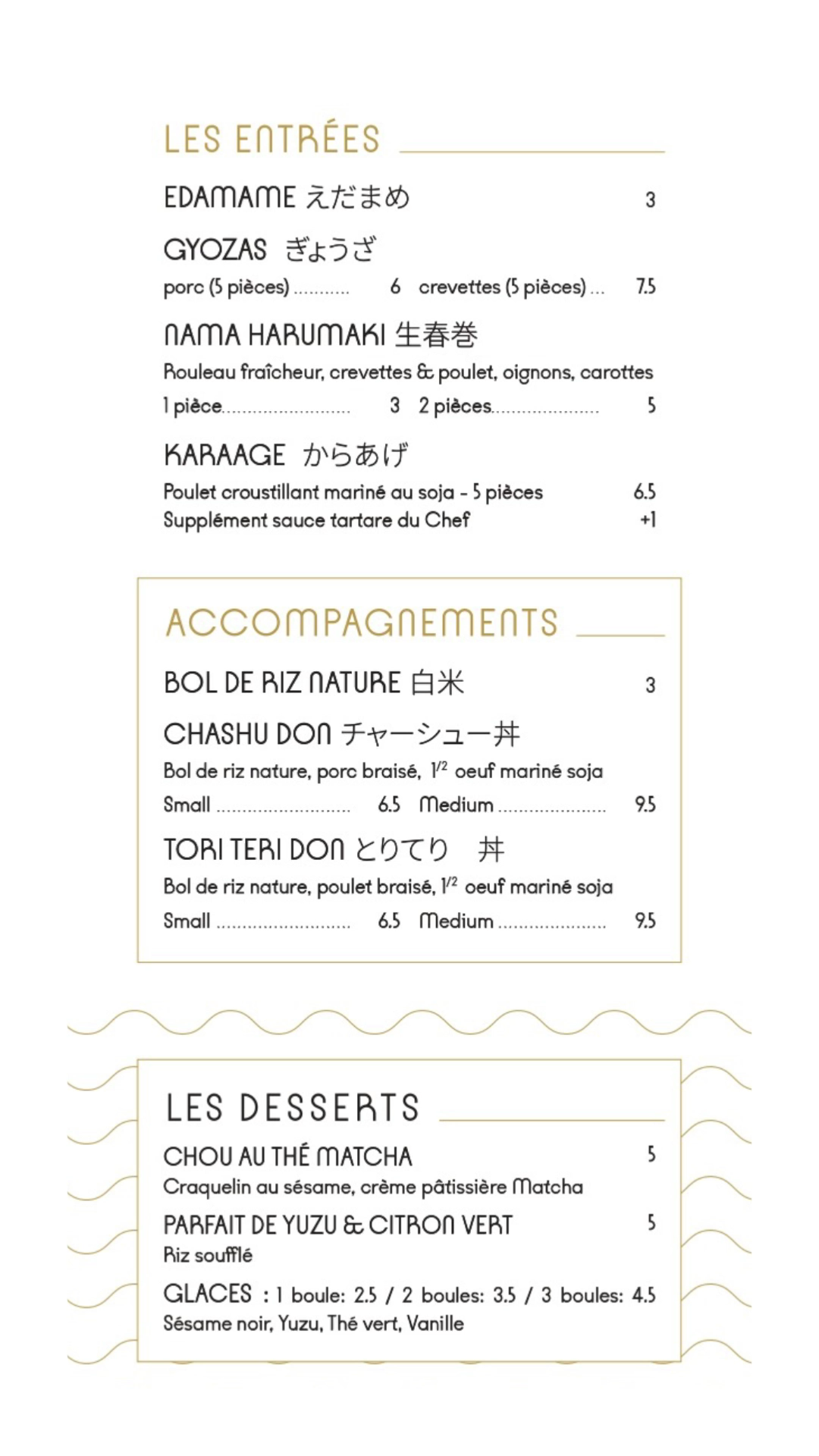 Clients habitués nous avons remarqués que le bouillon a un petit changé et quel bonheur !! Il est moins encore moins salé et plus onctueux c’est un grand oui ! Les Gyozas et Karaage sont toujours aussi bons! Le nouveau dessert tiramisu au thé matcha est vraiment très bon! Continuez ainsi on adore 🥰