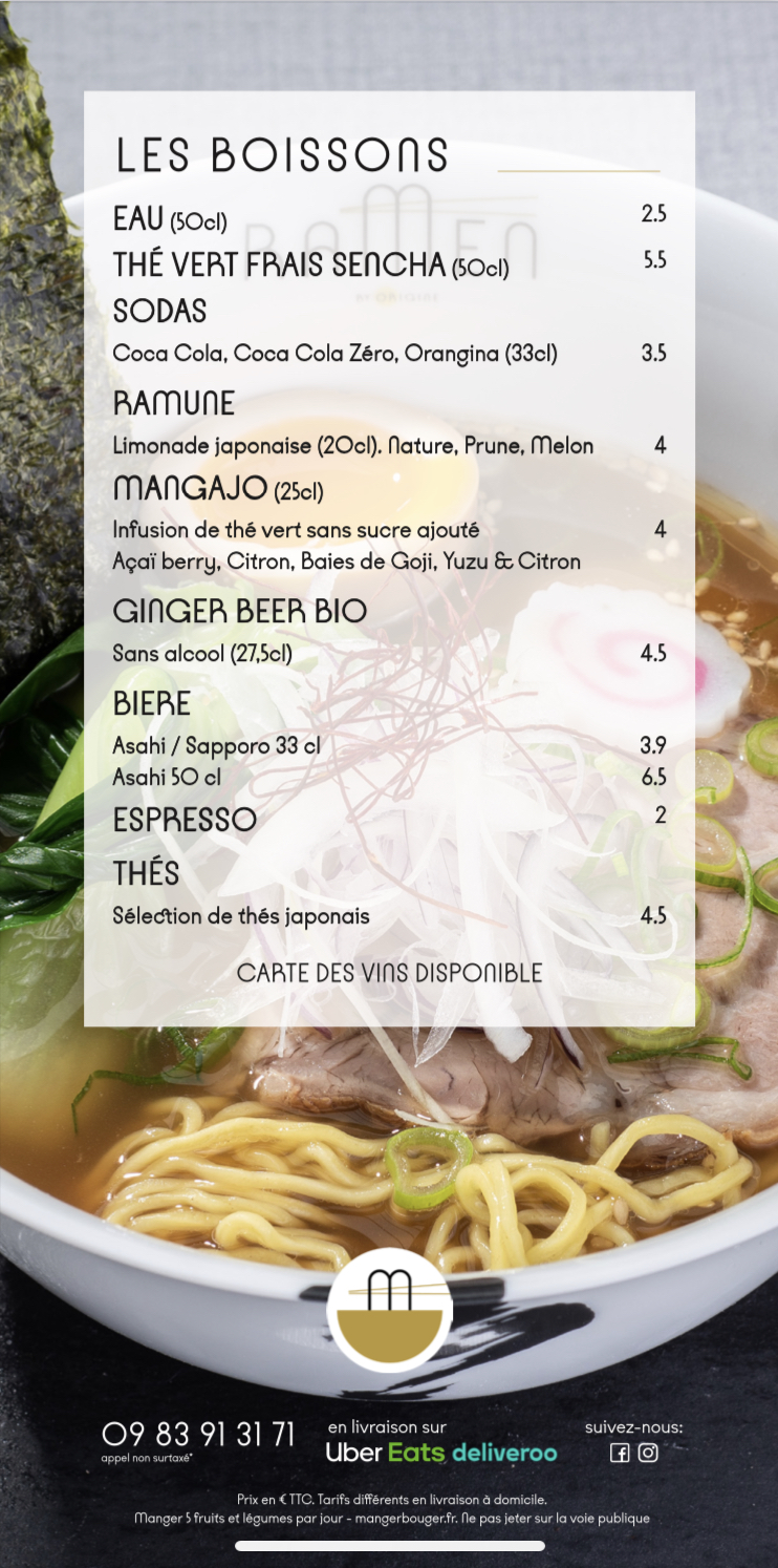 Posté le 10/03/2021 à 16:07"Commander deux ramen, un médium et un large, la différence entre les deux n’est pas flagrante mais la qualité des produits était excellente, la viande est très bonne ainsi que les légumes et mention spéciale pour les karaage qui étaient juste délicieux 👌🏻"