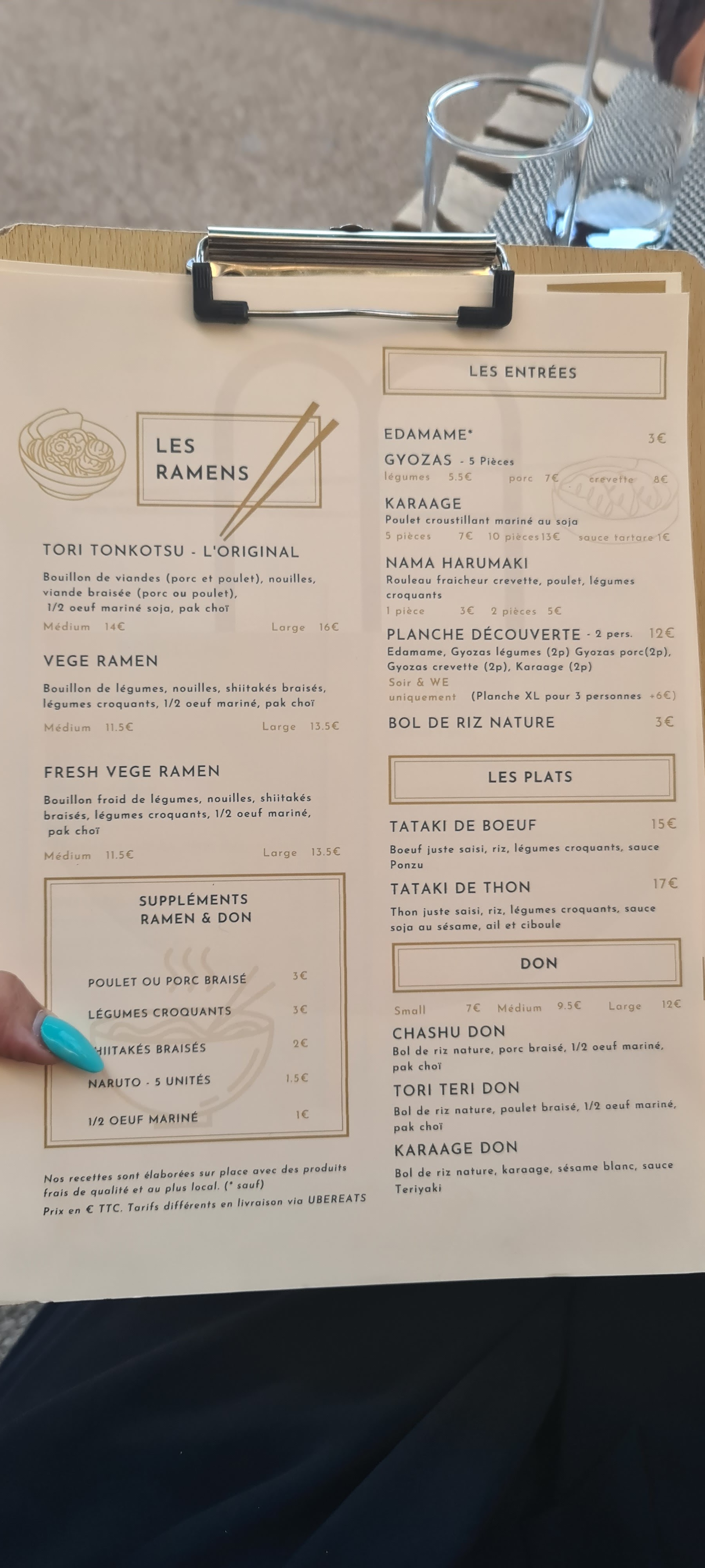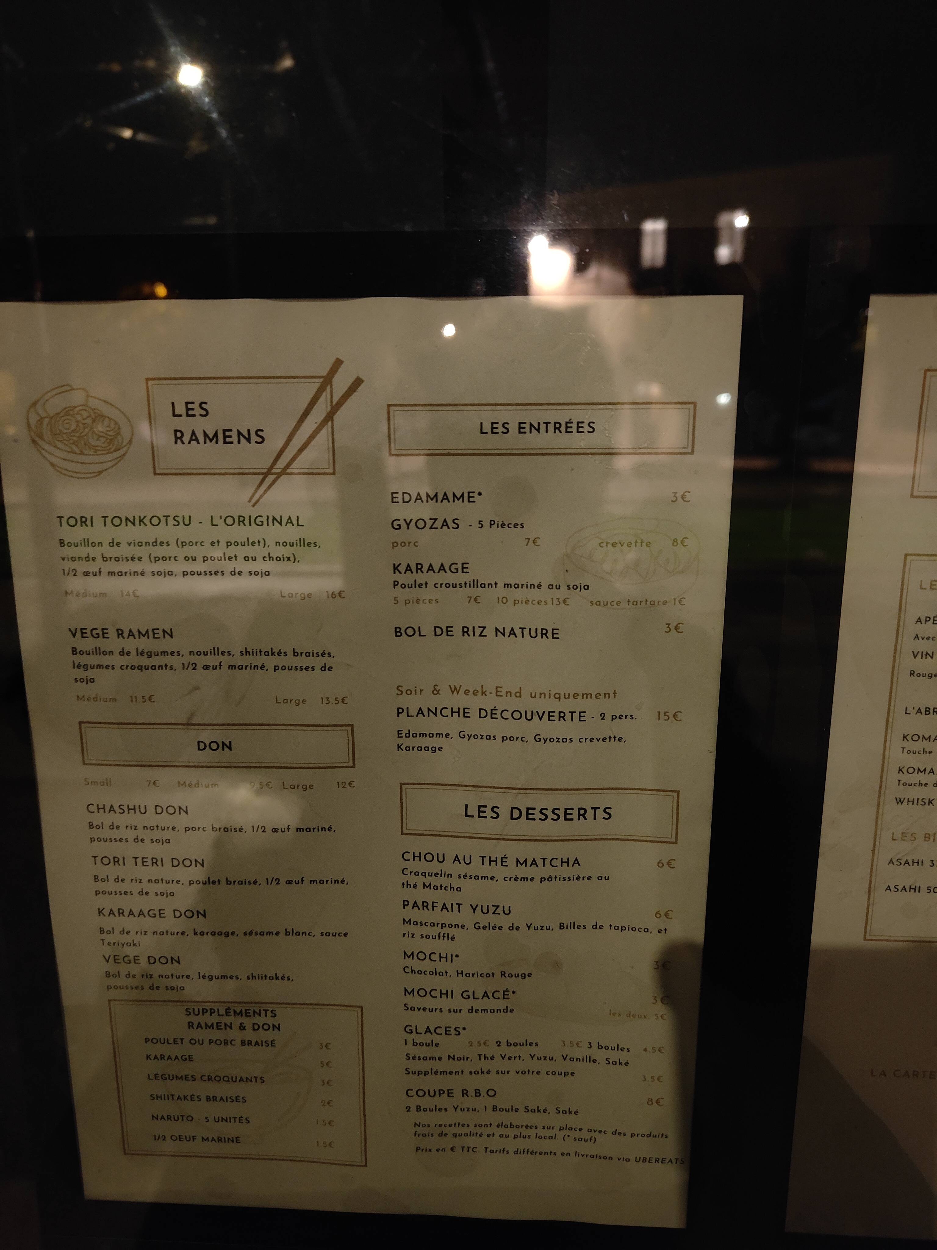 Nous avons commandé via uber eats les raviolis aux crevettes, les croustillants au poulet, un ramen au poulet et un tori teri don. C'était bon... mais je trouve que ça manque de générosité... du coup on reste sur sa faim... Mais les goûts sont bons.